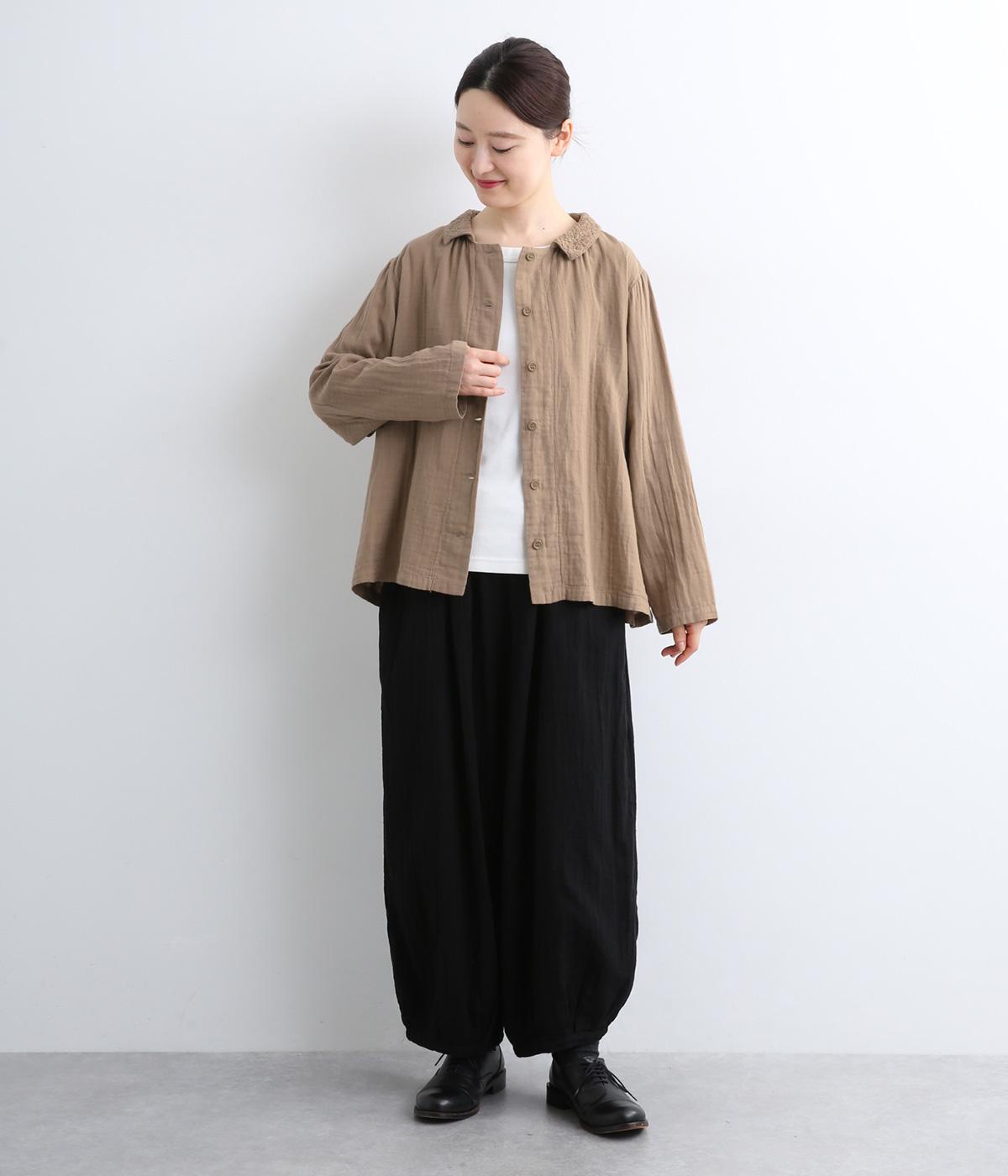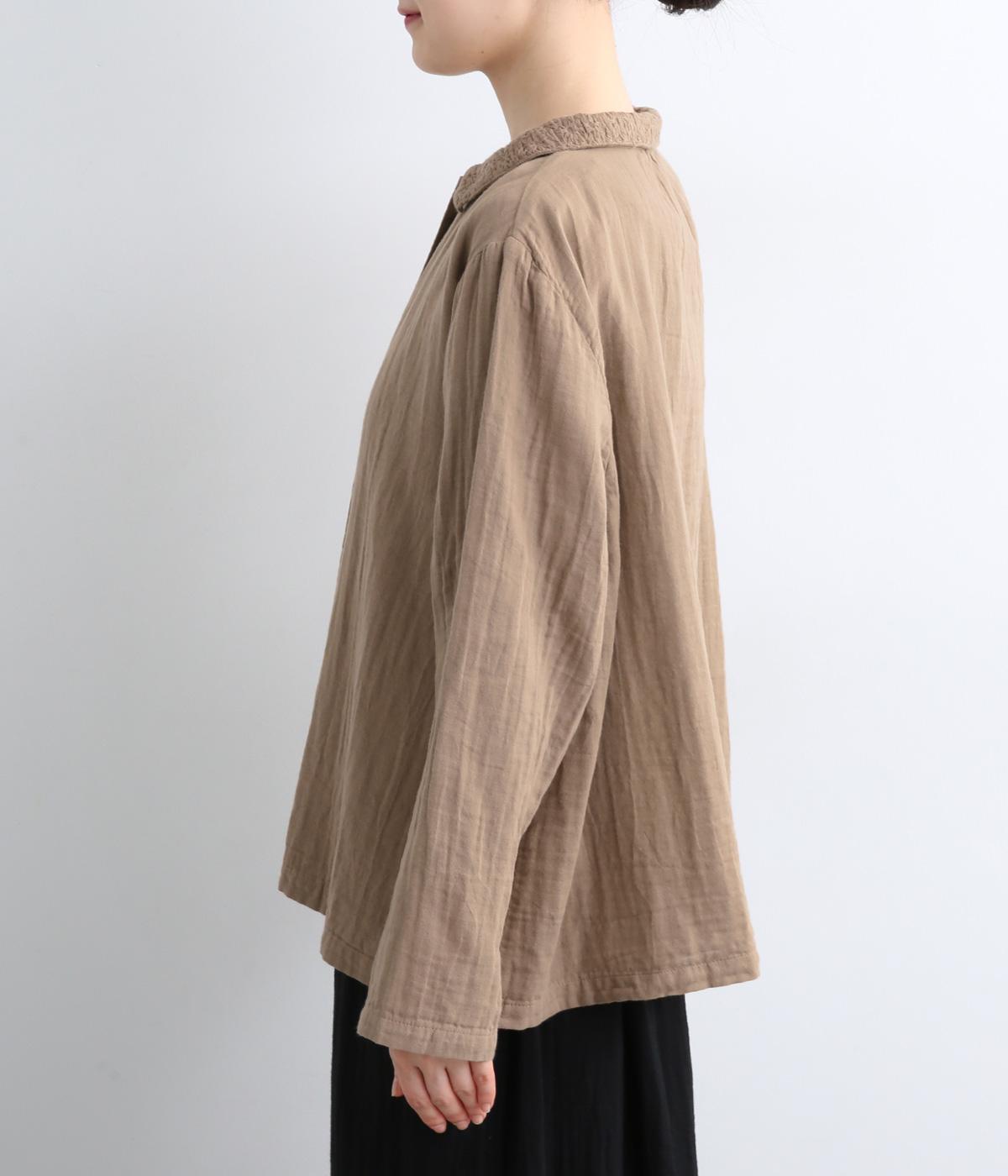 ガーゼのやさしい雰囲気にマッチした襟刺しゅうデザインが特徴的なブラウス。大人ガーリーな雰囲気に仕上がっていて、カジュアルなアイテム合わせもナチュラルにまとめてくれます。ボタンあき仕様なのであたたかな季節は羽織り使いもおすすめ。