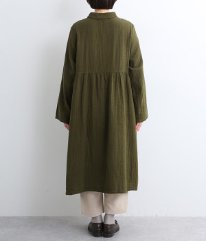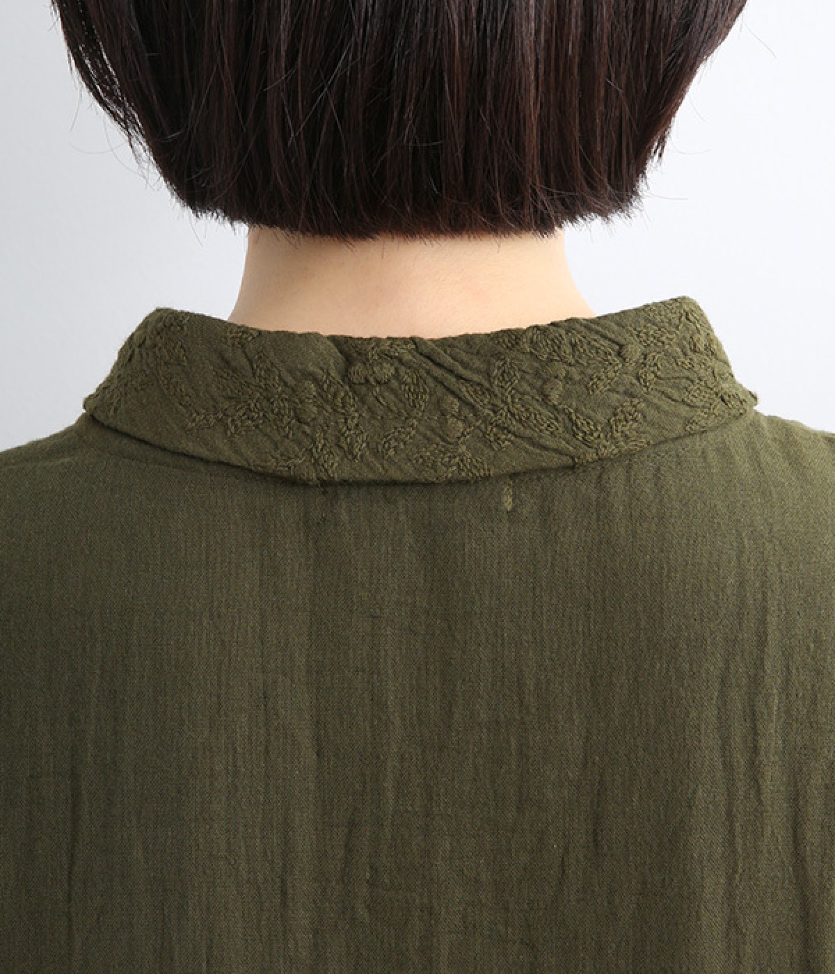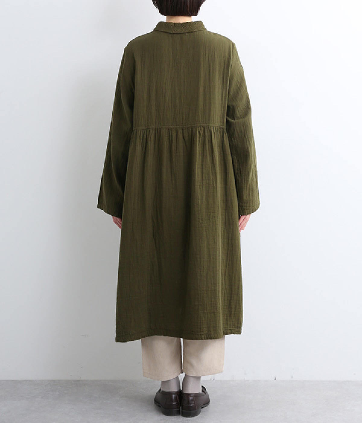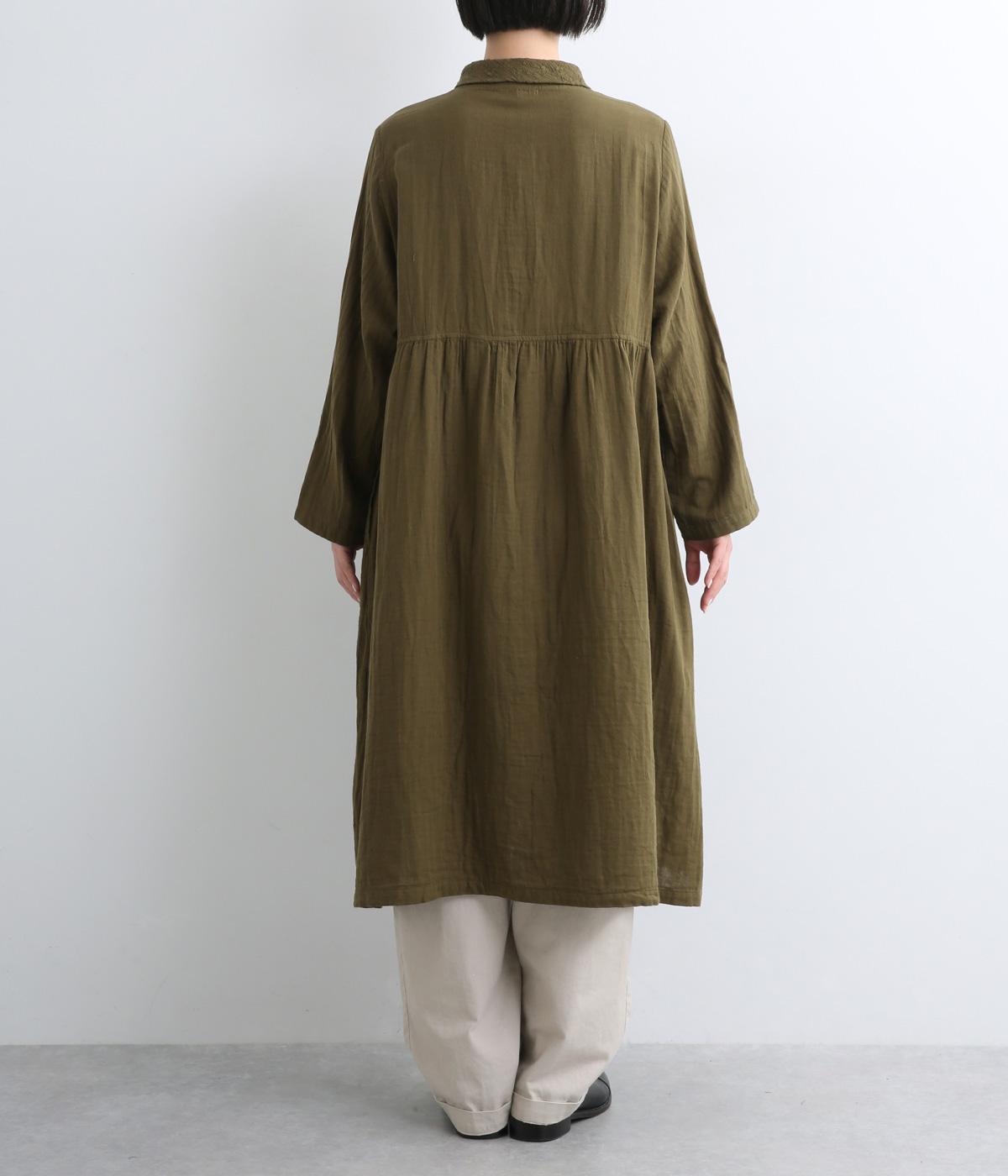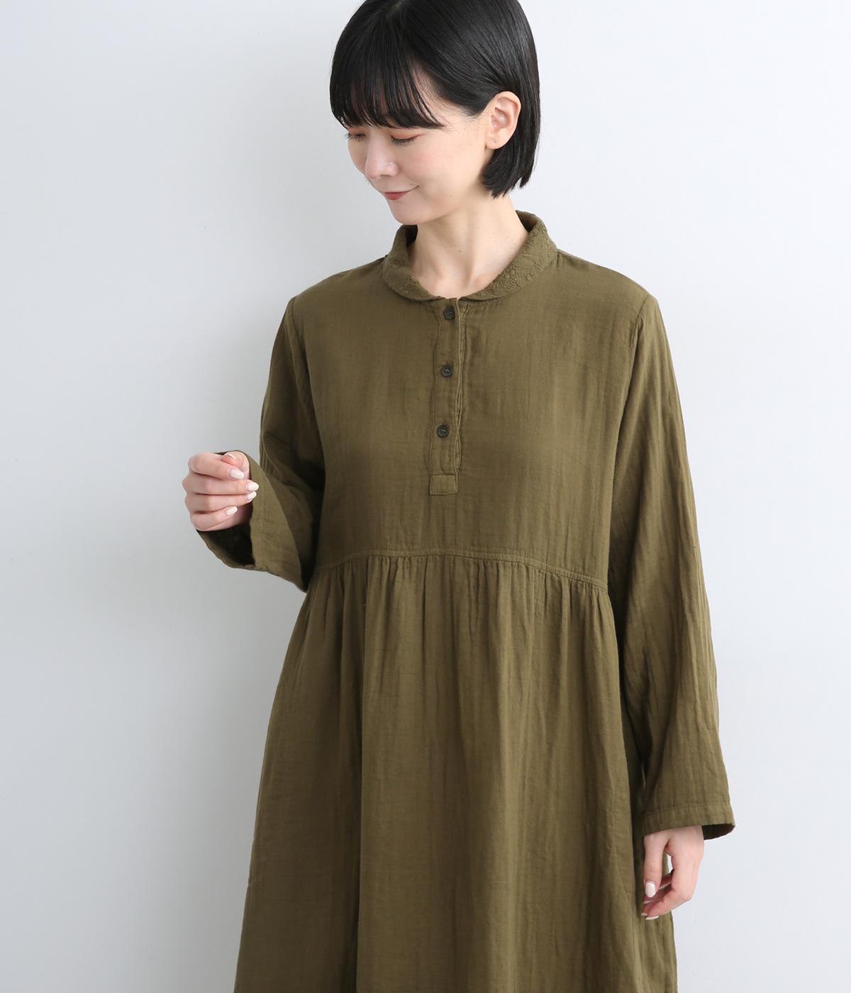 ガーゼ特有のやさしいん雰囲気を活かした、シンプルなワンピースです。小さめのショールカラーには刺しゅうをほどこしてさり気なくデザイン性をプラス。ボトムとのレイヤードがたのしめる丈感で、切り替え位置をやや高めにしているので全体のバランスも◎。