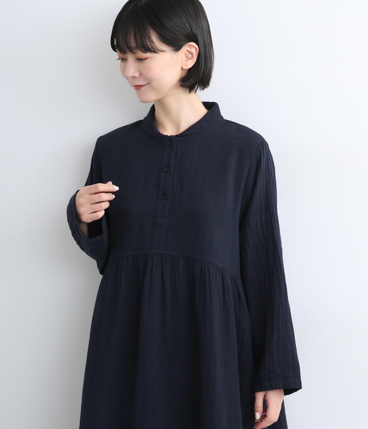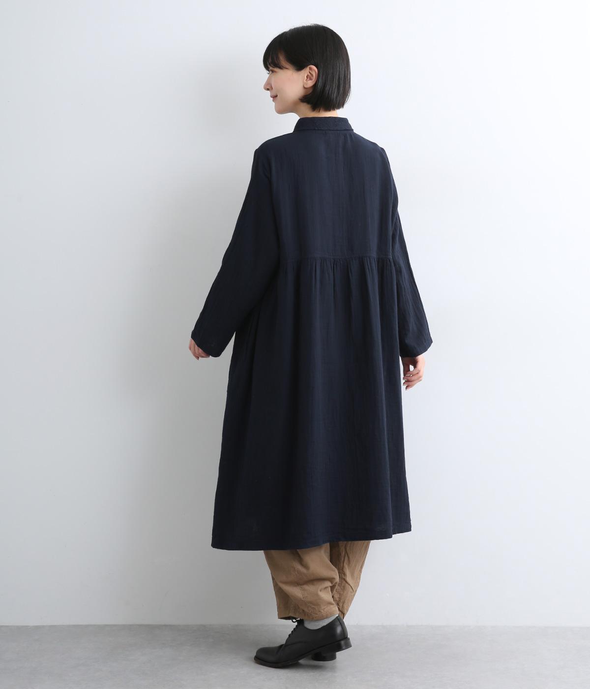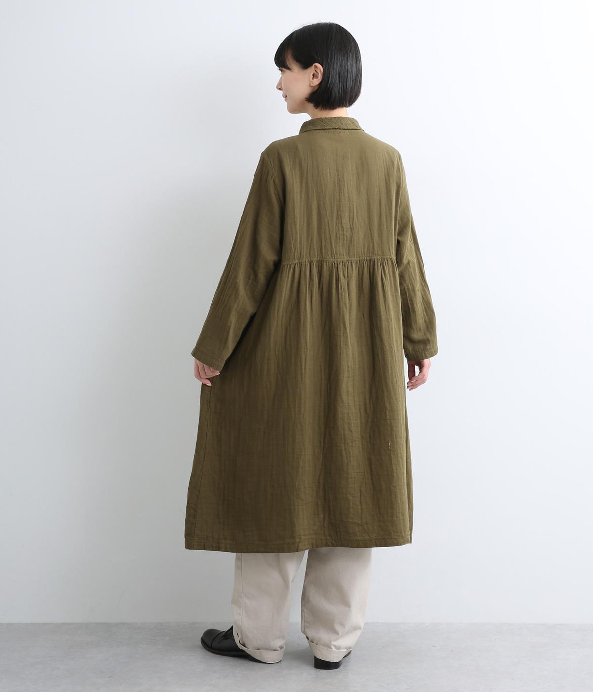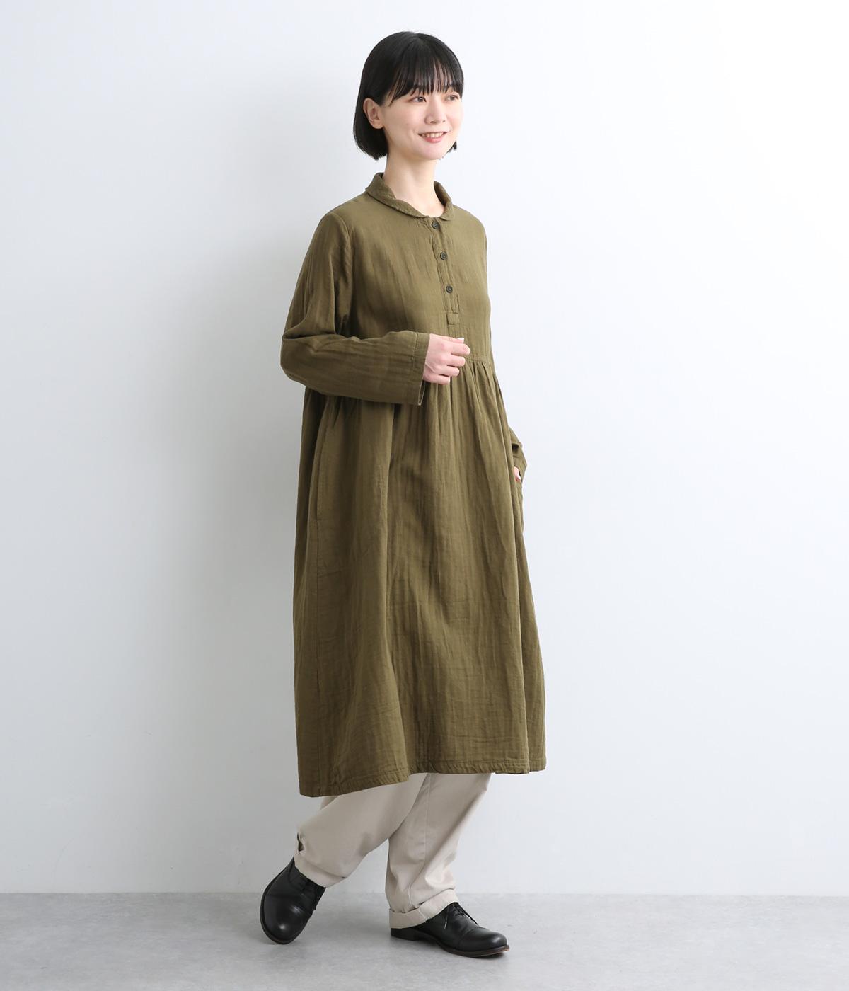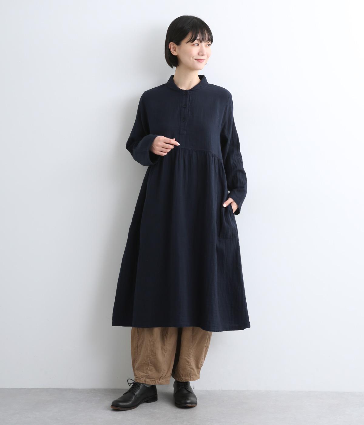 ガーゼ特有のやさしいん雰囲気を活かした、シンプルなワンピースです。小さめのショールカラーには刺しゅうをほどこしてさり気なくデザイン性をプラス。ボトムとのレイヤードがたのしめる丈感で、切り替え位置をやや高めにしているので全体のバランスも◎。