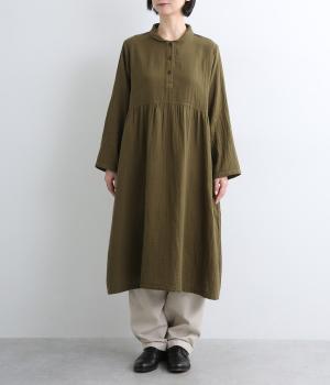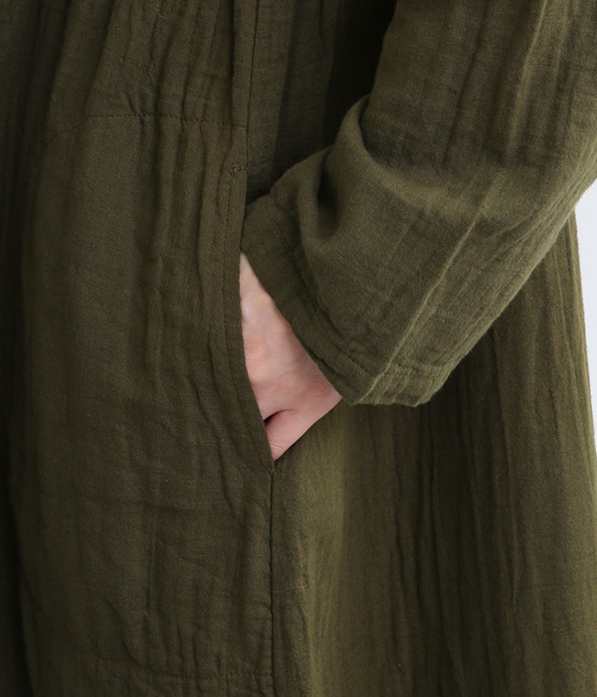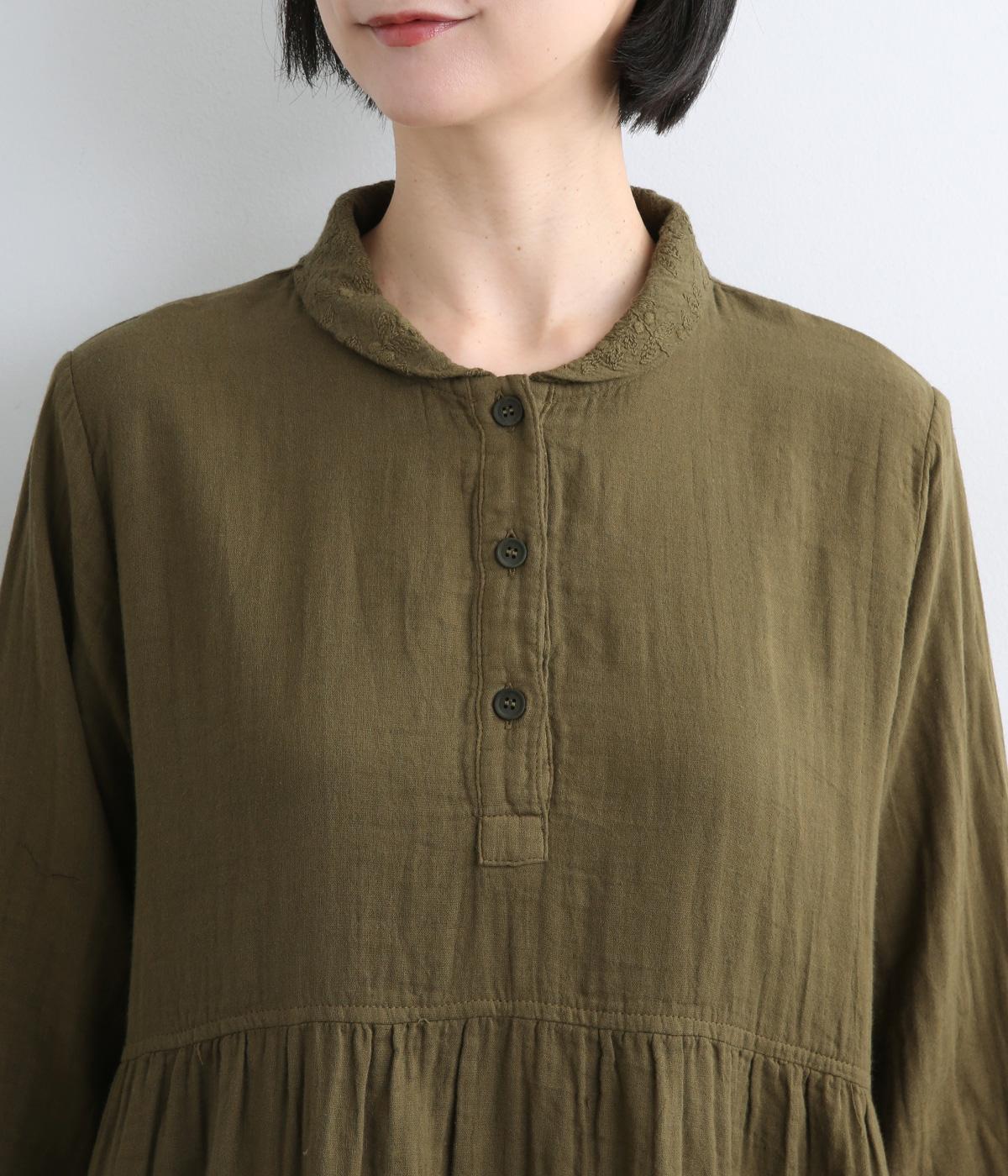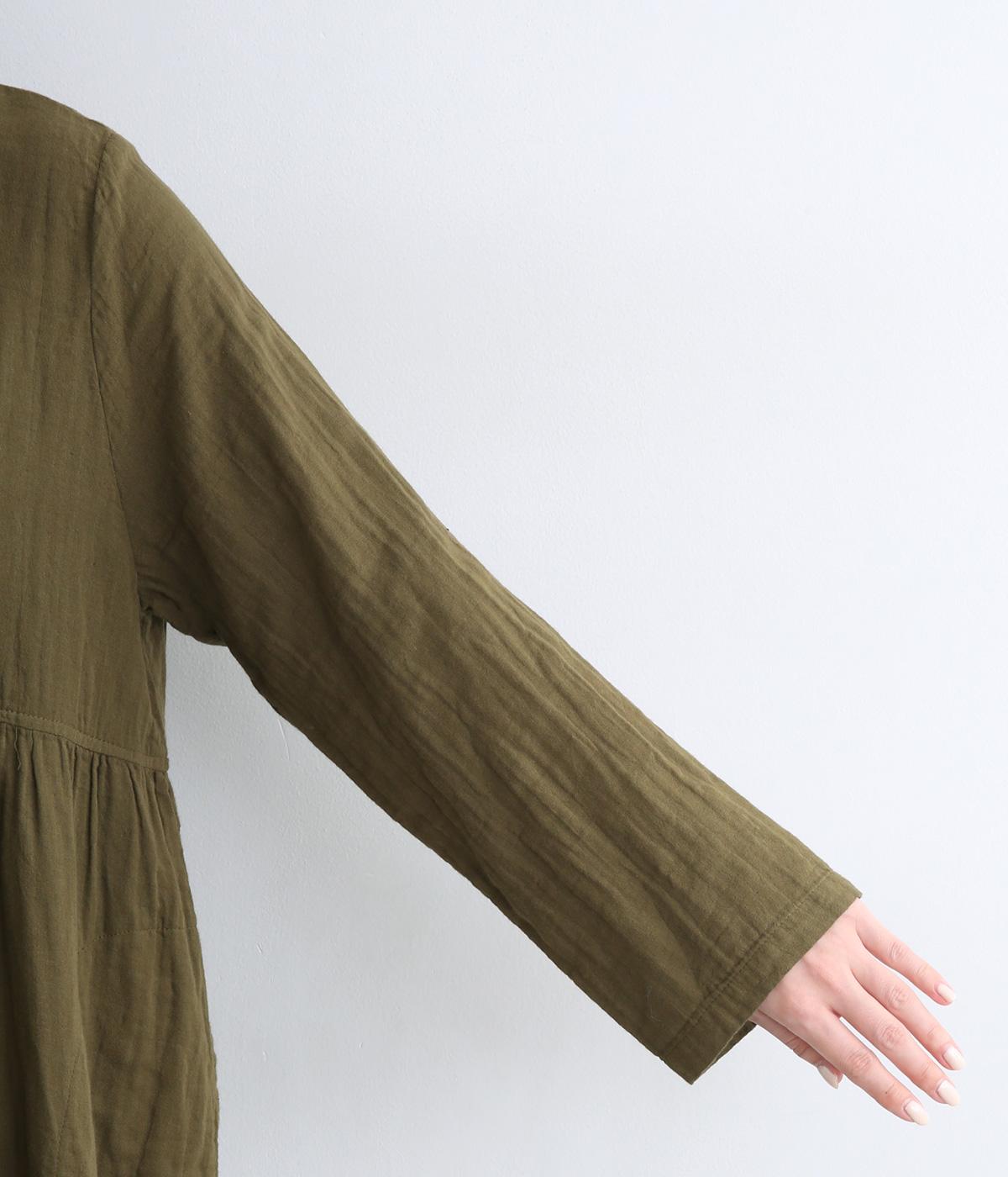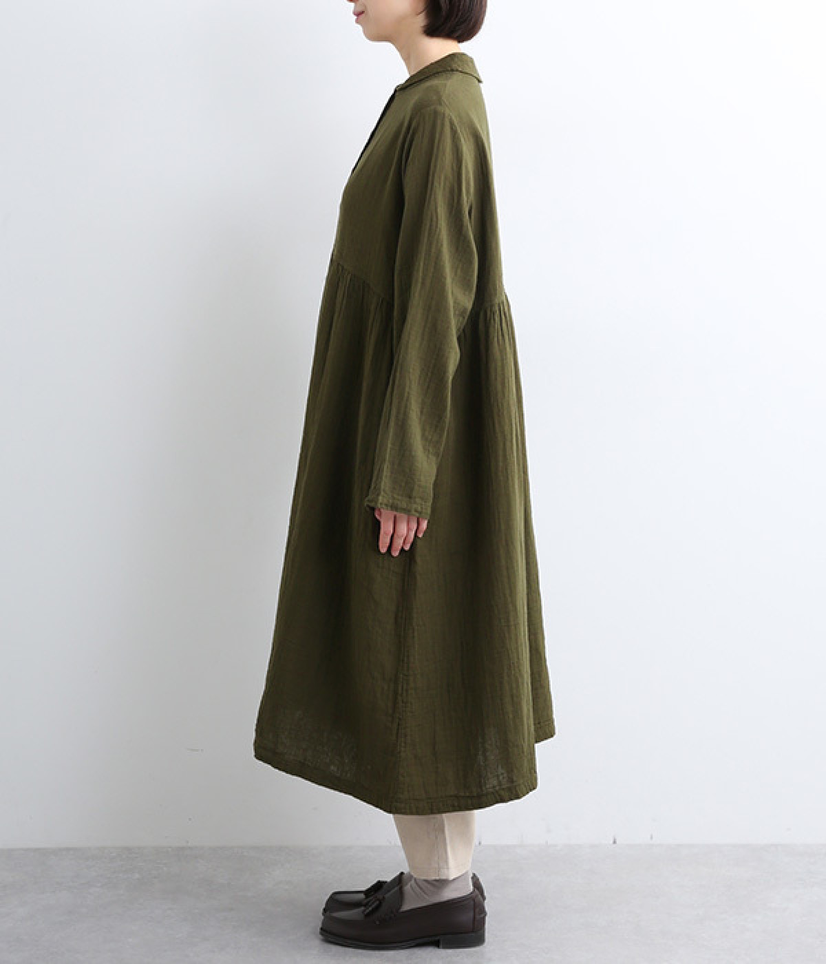 ガーゼ特有のやさしいん雰囲気を活かした、シンプルなワンピースです。小さめのショールカラーには刺しゅうをほどこしてさり気なくデザイン性をプラス。ボトムとのレイヤードがたのしめる丈感で、切り替え位置をやや高めにしているので全体のバランスも◎。