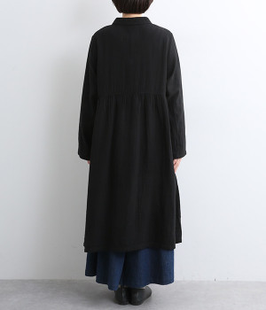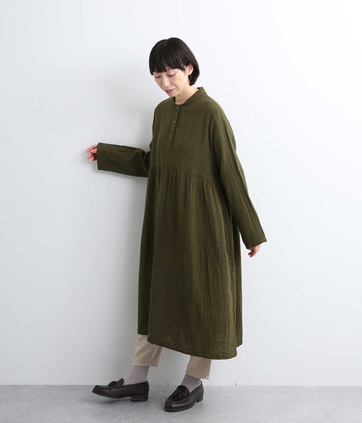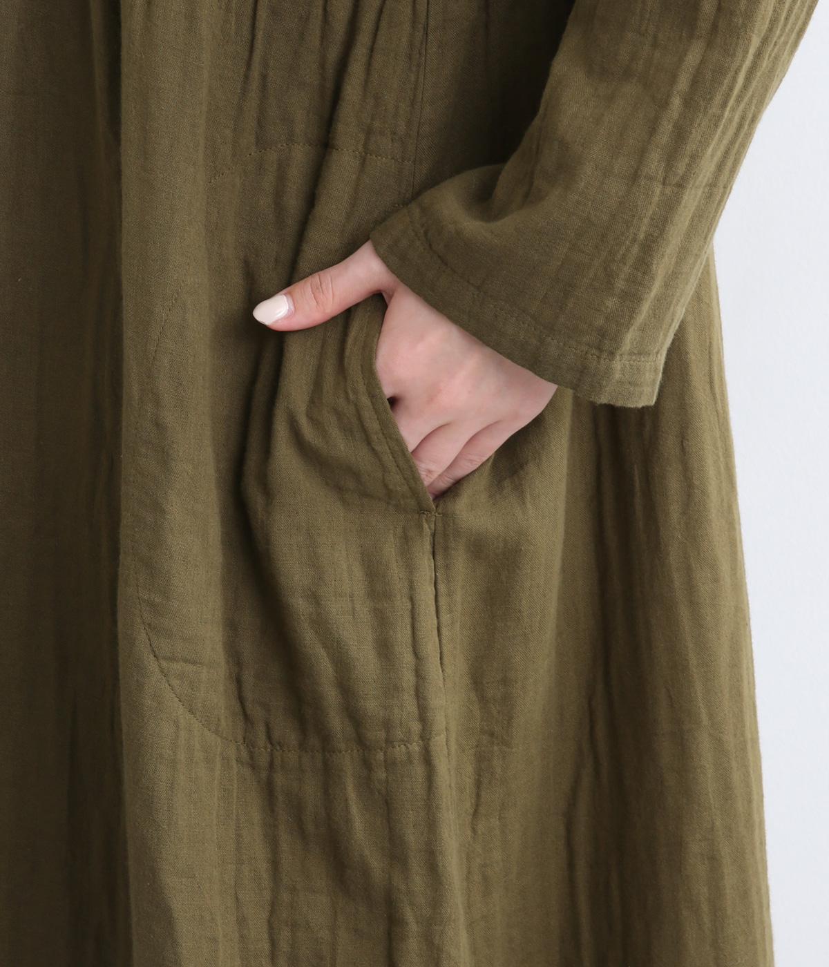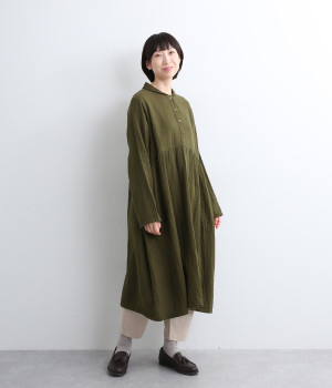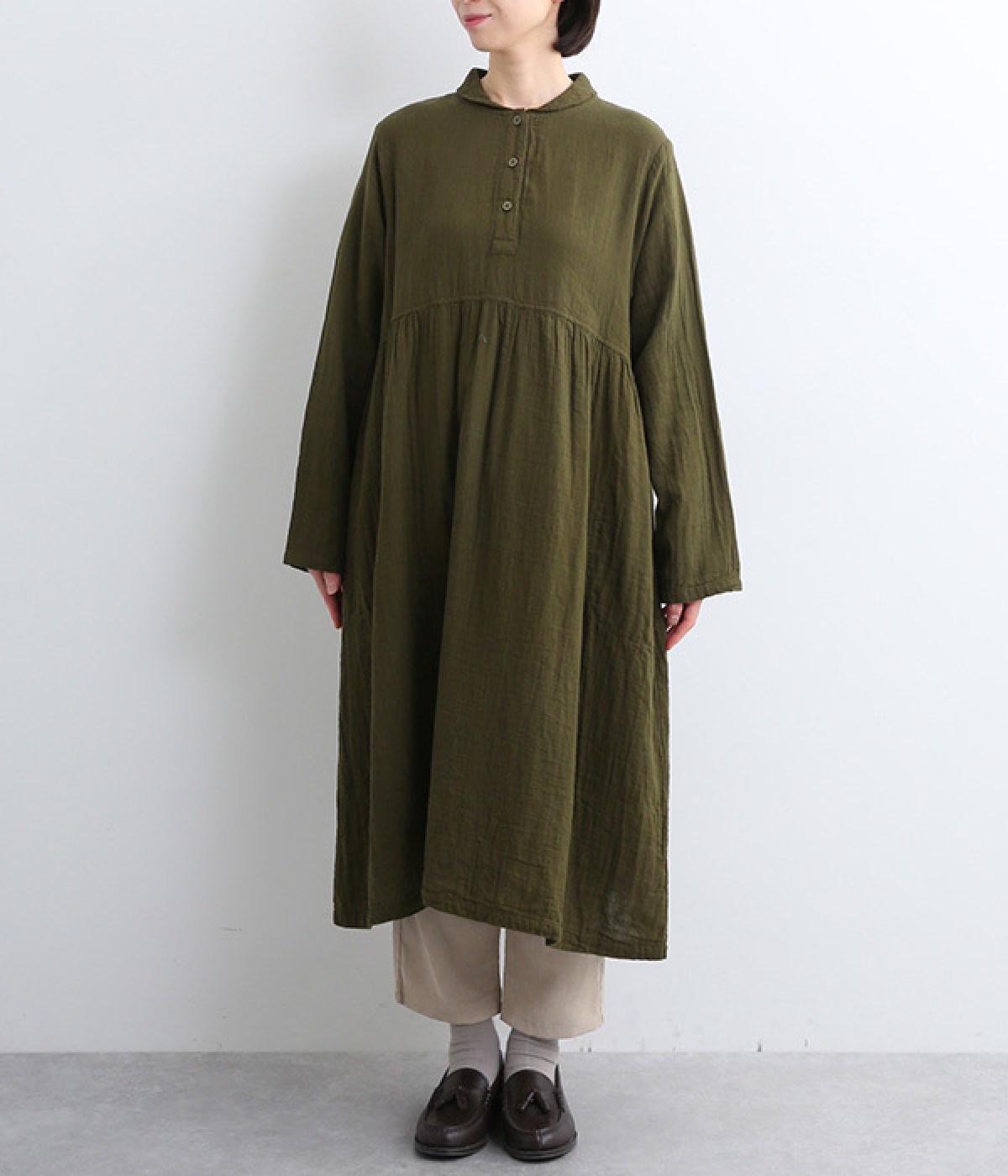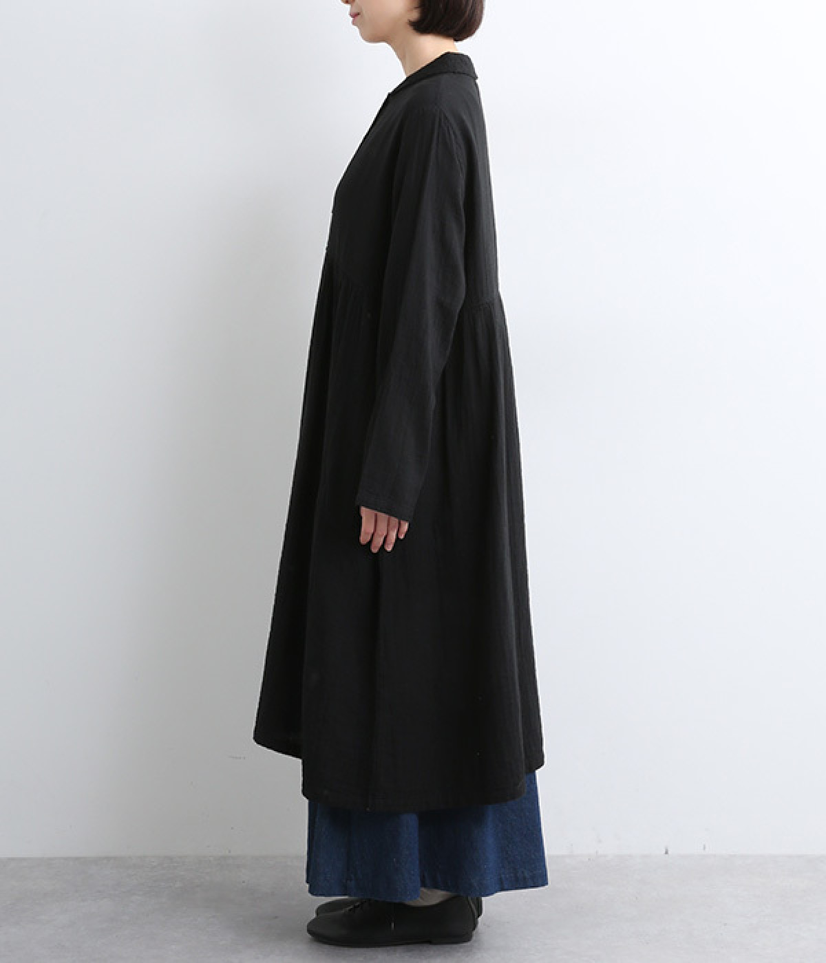 ガーゼ特有のやさしいん雰囲気を活かした、シンプルなワンピースです。小さめのショールカラーには刺しゅうをほどこしてさり気なくデザイン性をプラス。ボトムとのレイヤードがたのしめる丈感で、切り替え位置をやや高めにしているので全体のバランスも◎。