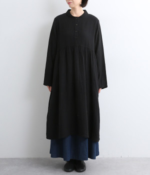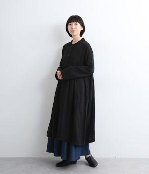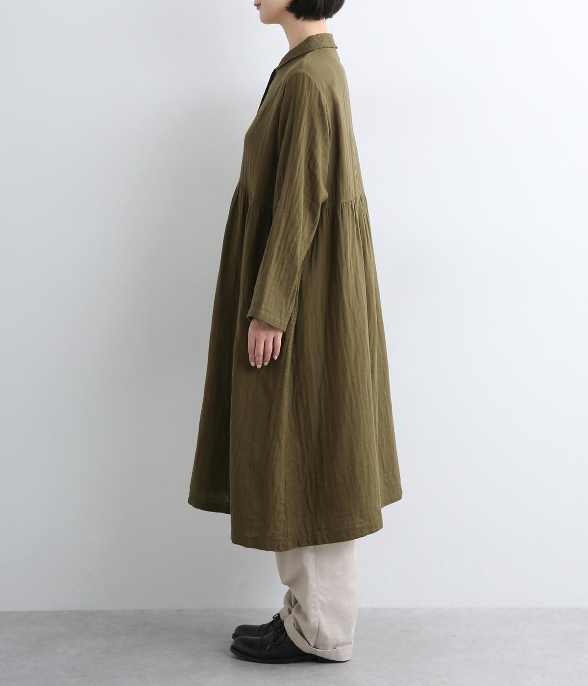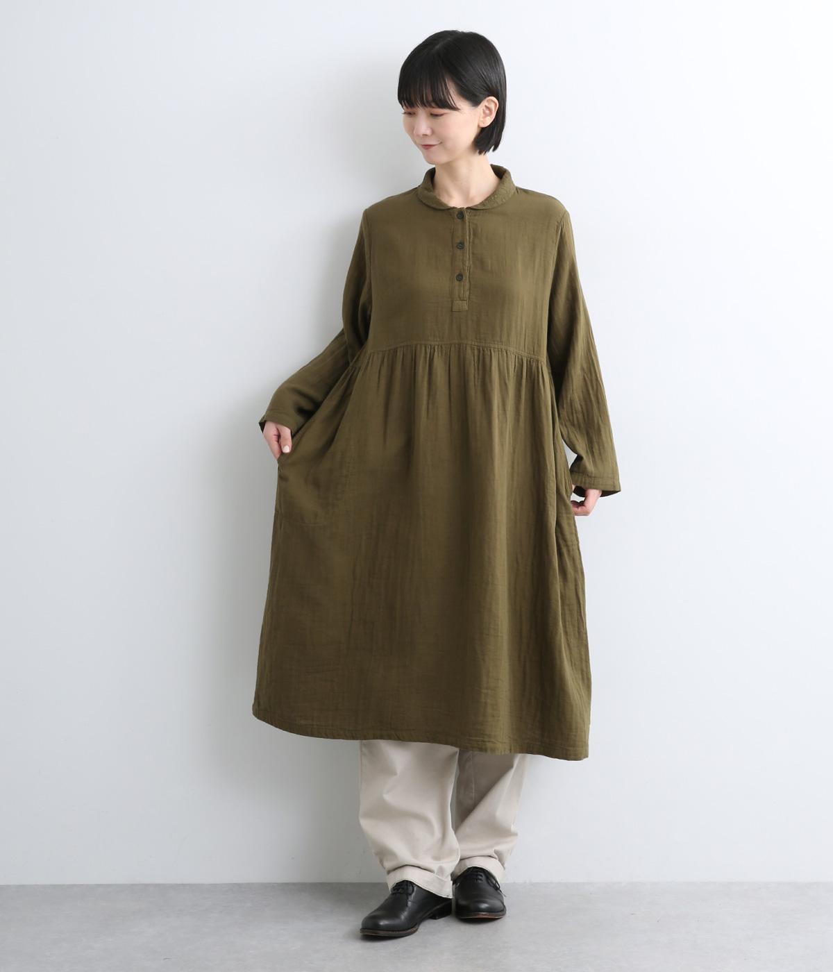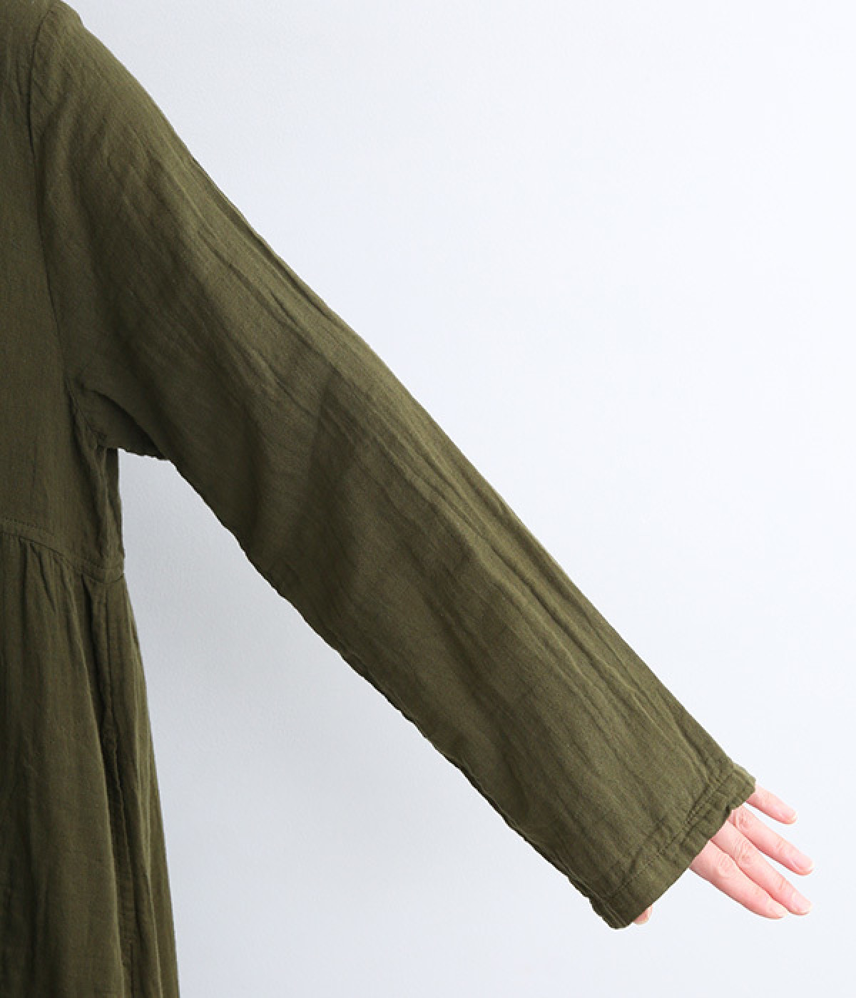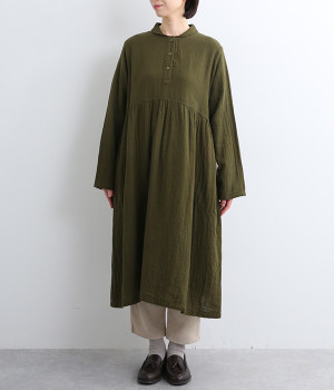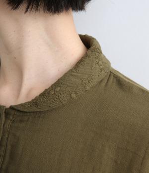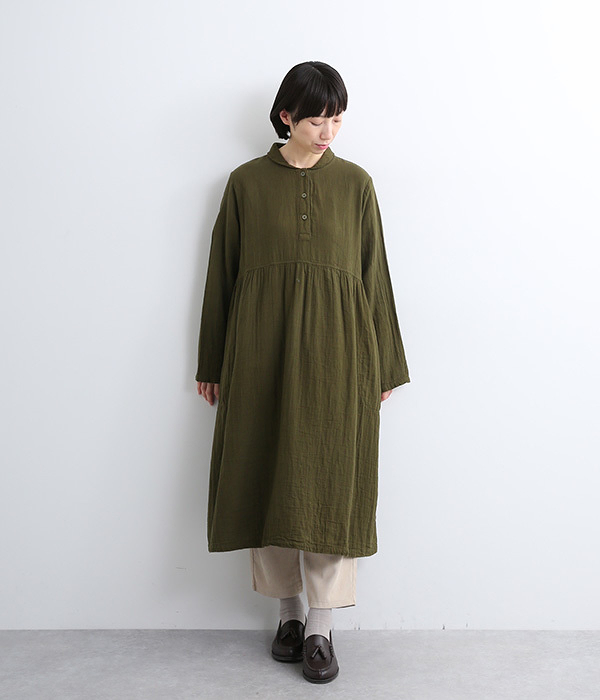 ガーゼ特有のやさしいん雰囲気を活かした、シンプルなワンピースです。小さめのショールカラーには刺しゅうをほどこしてさり気なくデザイン性をプラス。ボトムとのレイヤードがたのしめる丈感で、切り替え位置をやや高めにしているので全体のバランスも◎。