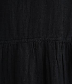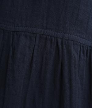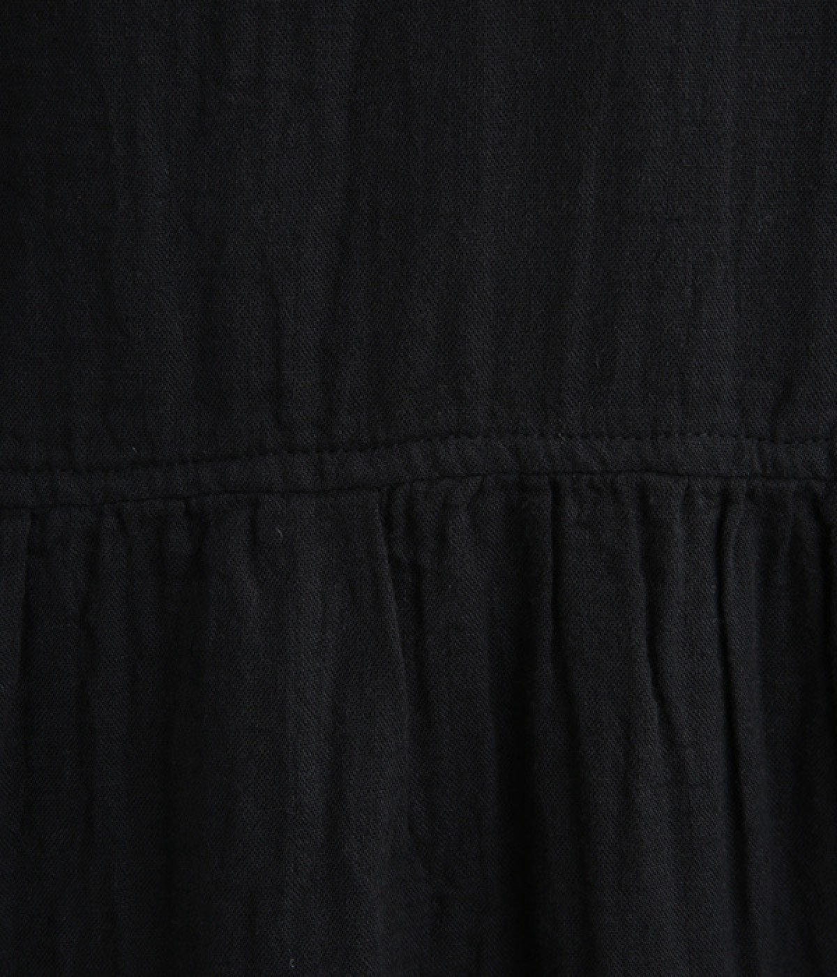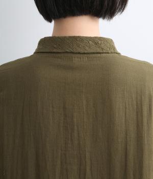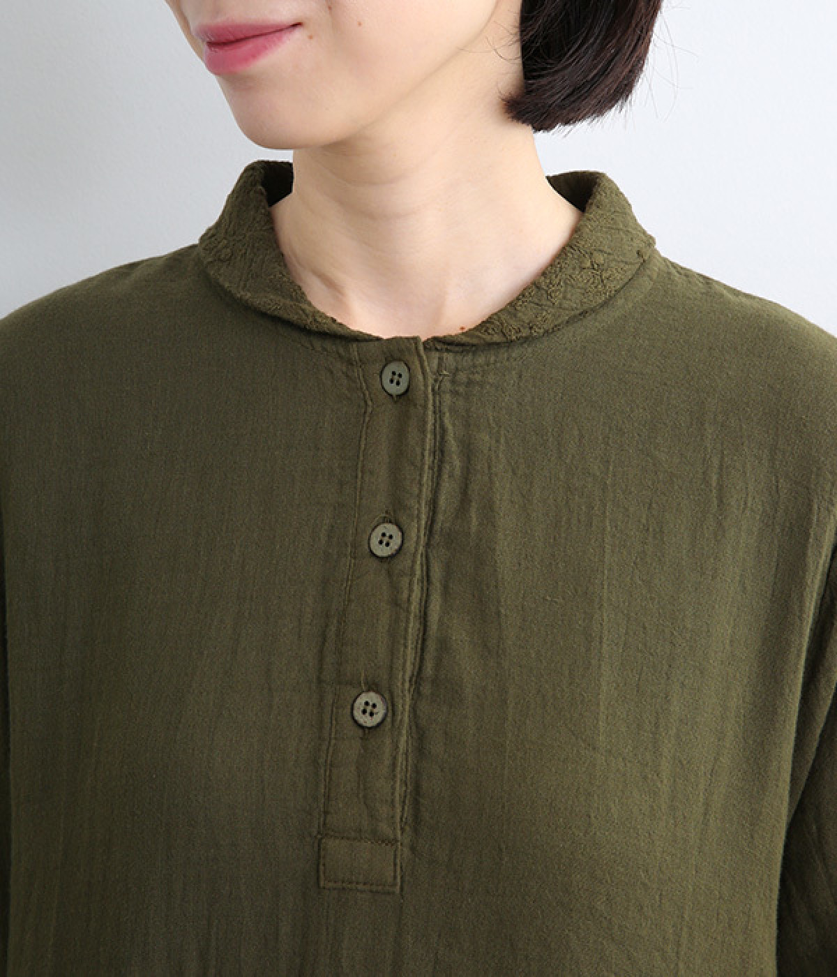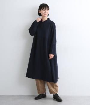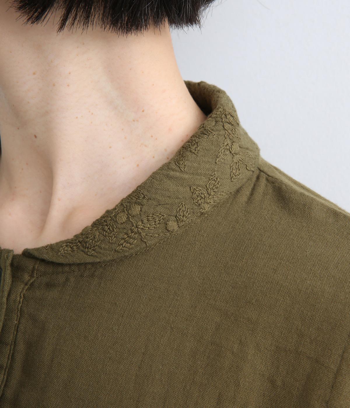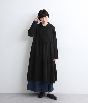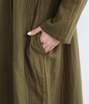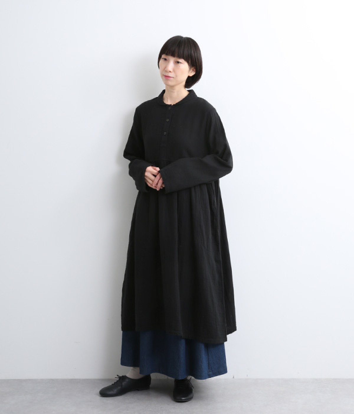 ガーゼ特有のやさしいん雰囲気を活かした、シンプルなワンピースです。小さめのショールカラーには刺しゅうをほどこしてさり気なくデザイン性をプラス。ボトムとのレイヤードがたのしめる丈感で、切り替え位置をやや高めにしているので全体のバランスも◎。