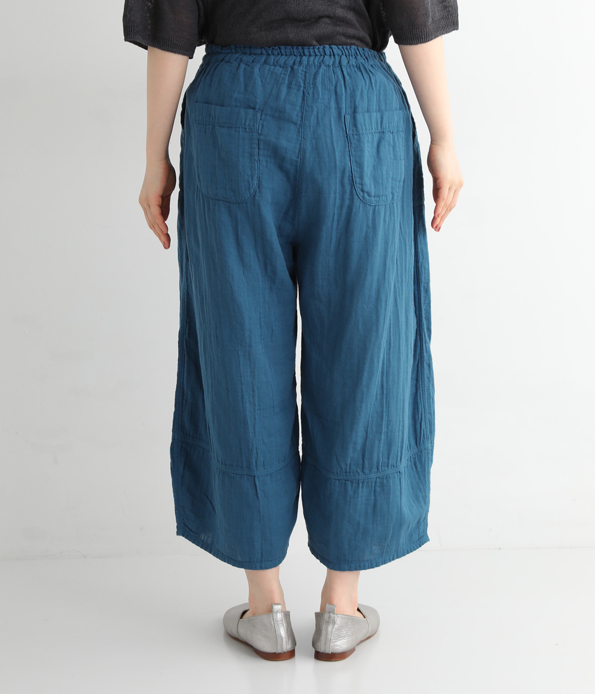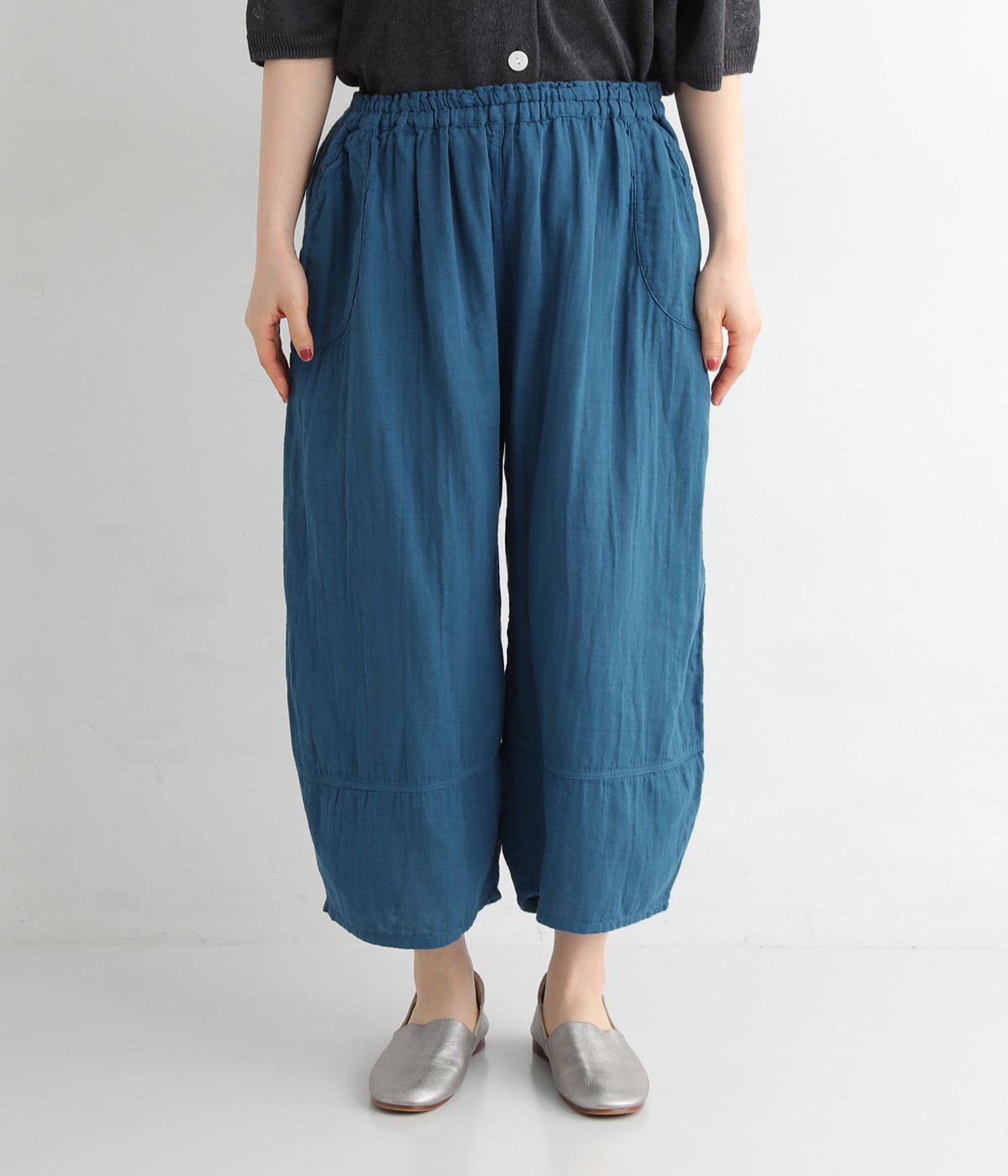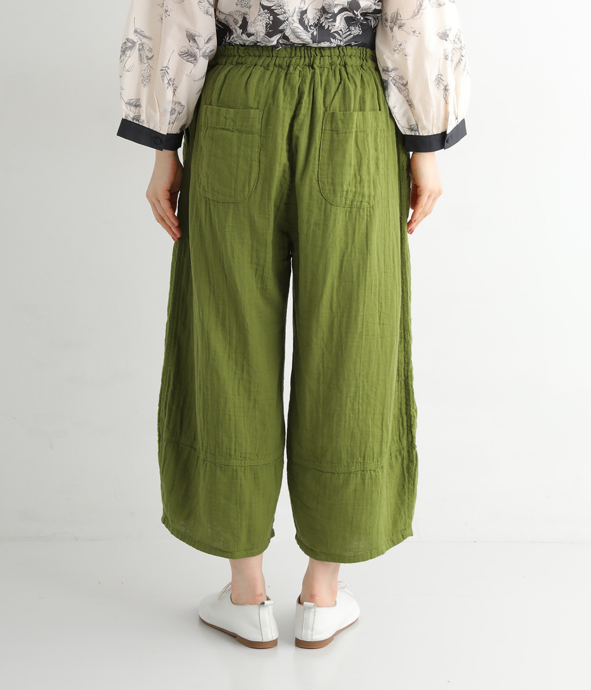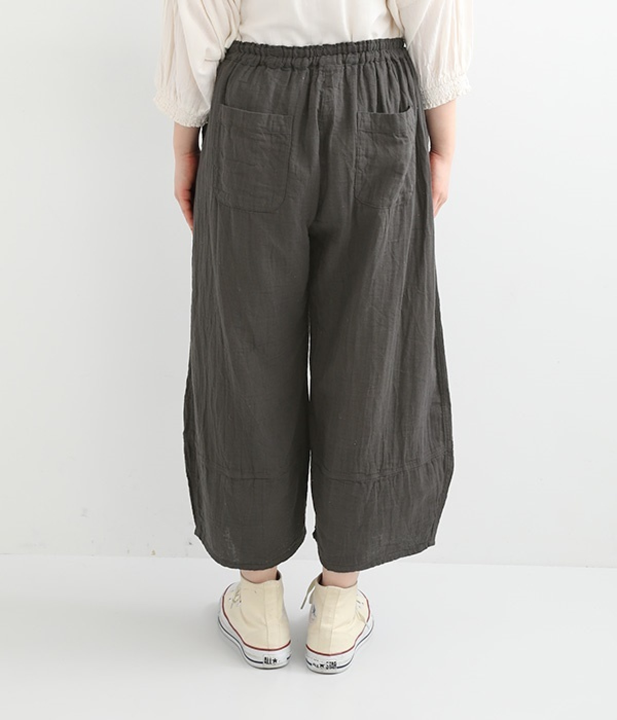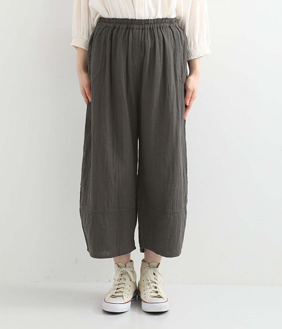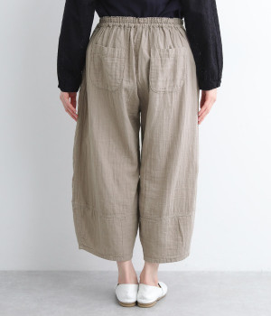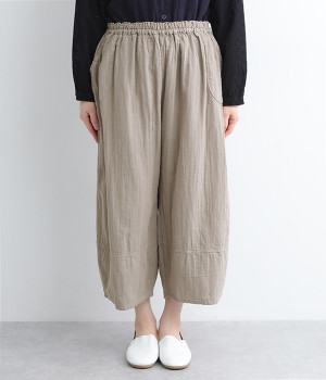 ダブルガーゼを使用した、丸みのあるリラックスシルエットがかわいいピエロパンツです。ガーゼ生地を2枚重ねているので軽やかながらもしっかりとしたはき心地が嬉しい一着。ウエストにはゴムをぐるりと入れて、腰まわりをやさしいフィットに。丈はやや短めに設定しているため、シューズやソックスの選び方により足元の雰囲気を変えられます。