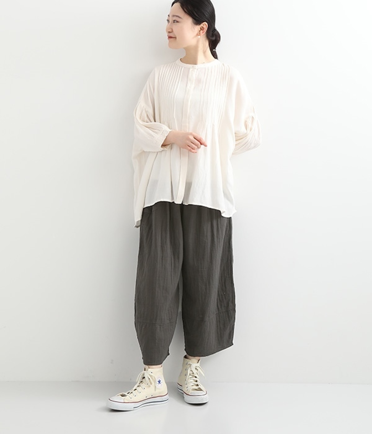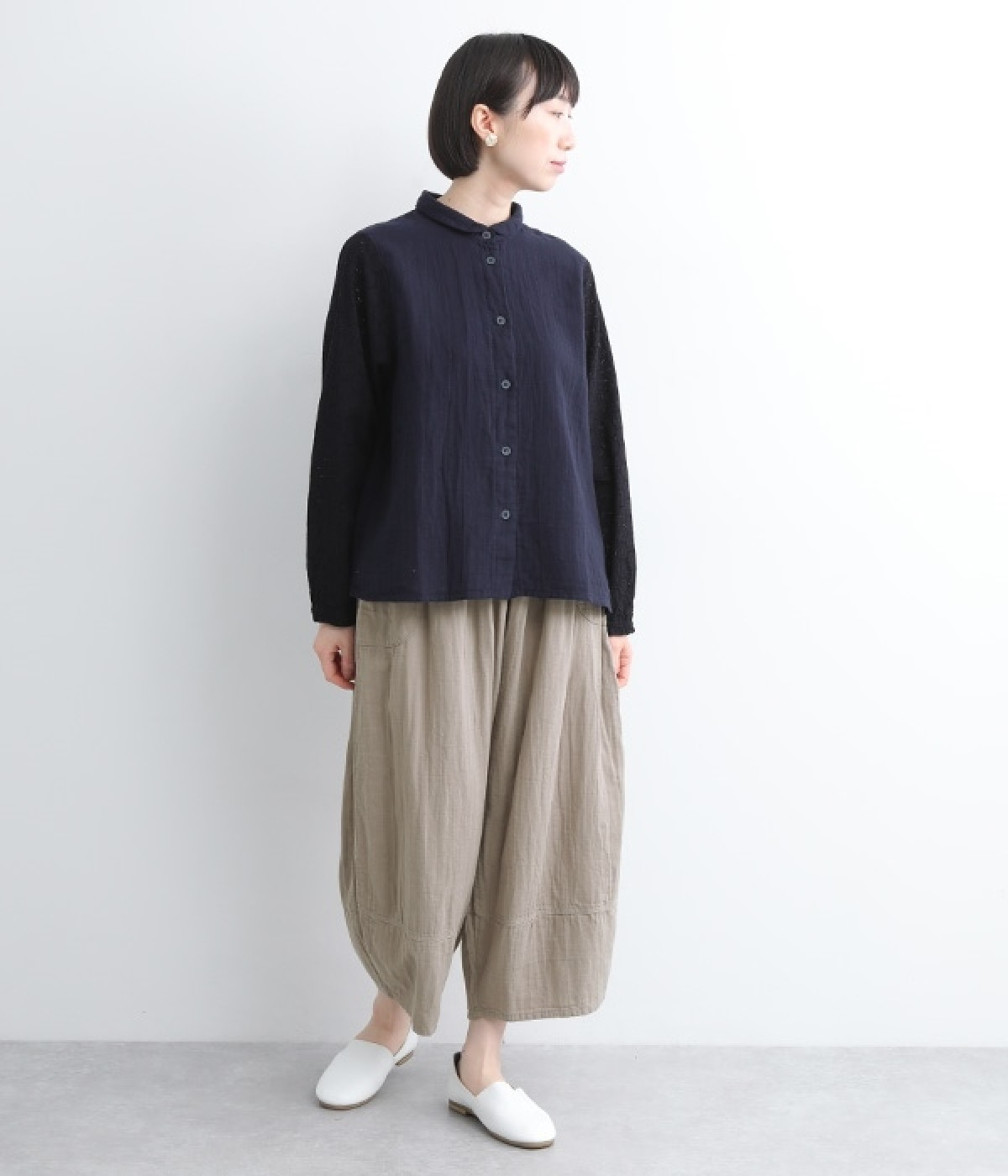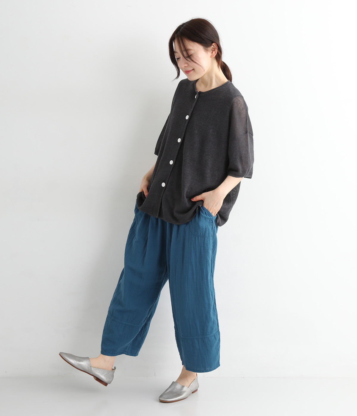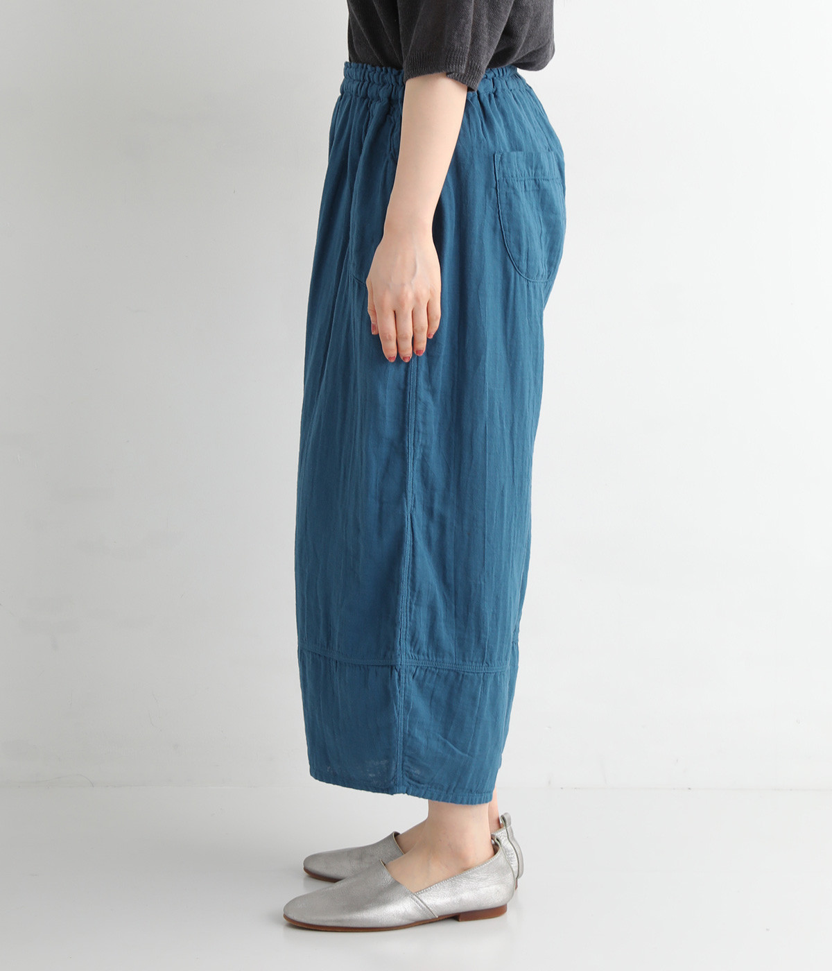ダブルガーゼを使用した、丸みのあるリラックスシルエットがかわいいピエロパンツです。ガーゼ生地を2枚重ねているので軽やかながらもしっかりとしたはき心地が嬉しい一着。ウエストにはゴムをぐるりと入れて、腰まわりをやさしいフィットに。丈はやや短めに設定しているため、シューズやソックスの選び方により足元の雰囲気を変えられます。