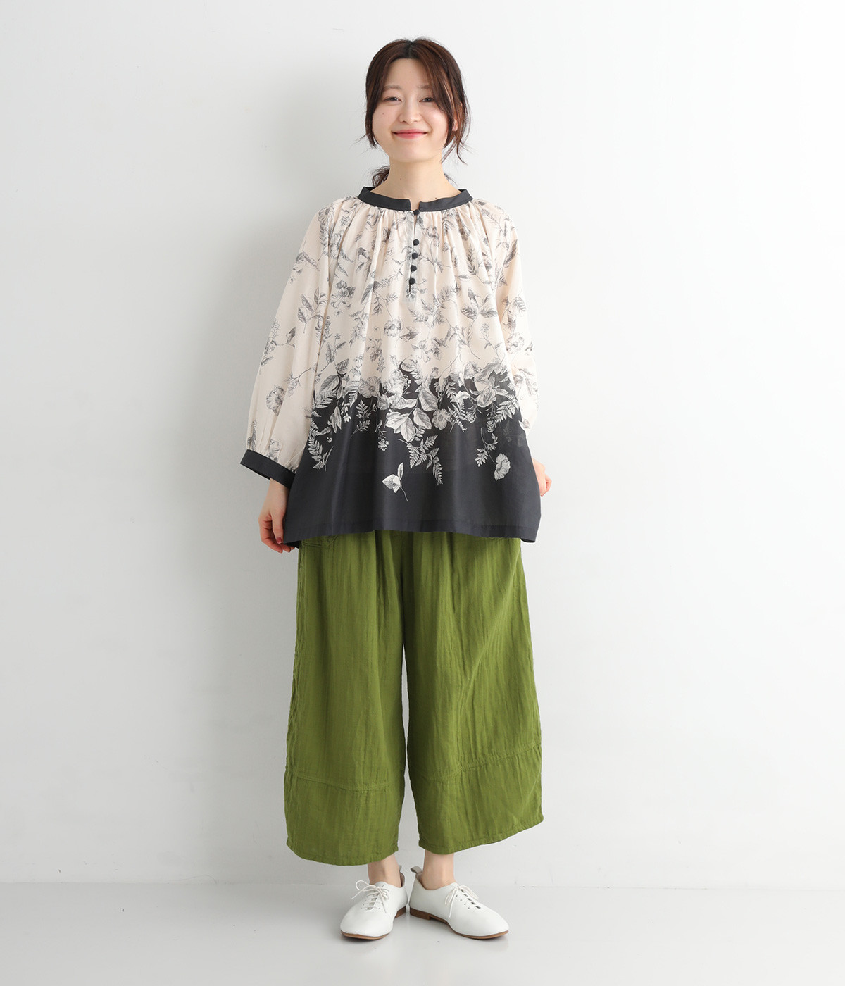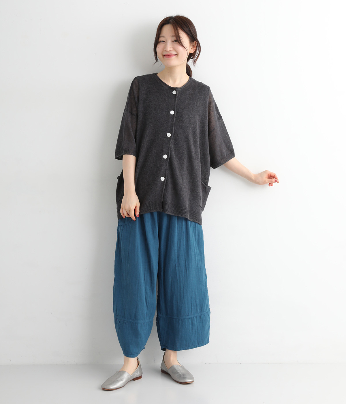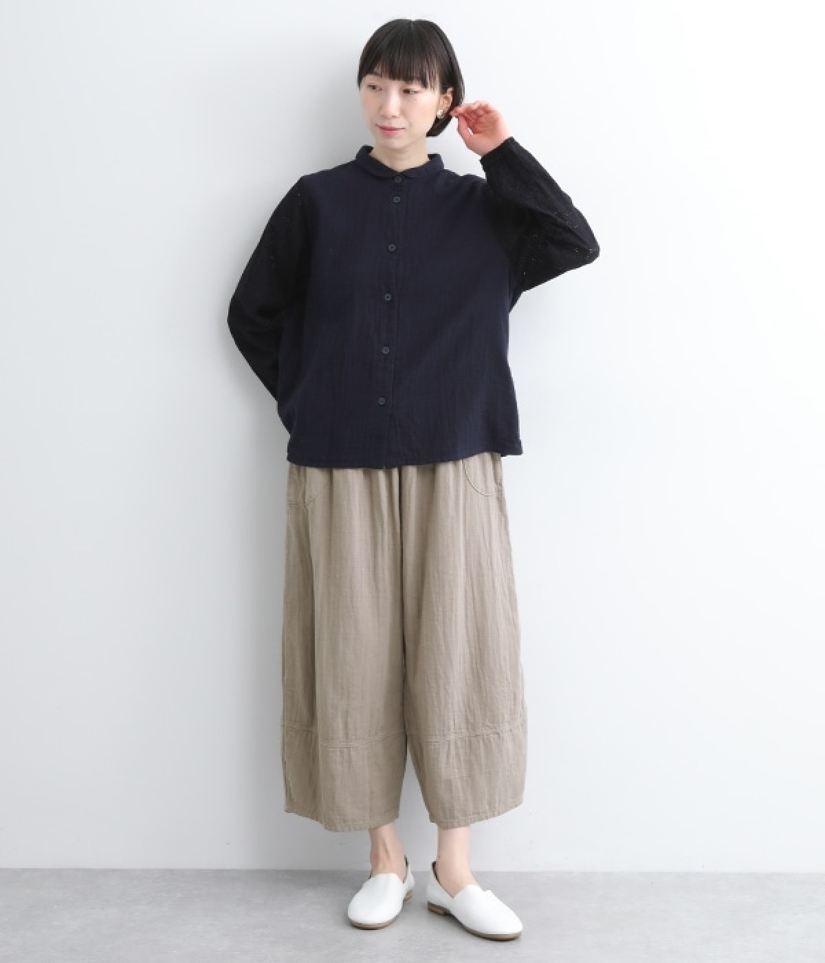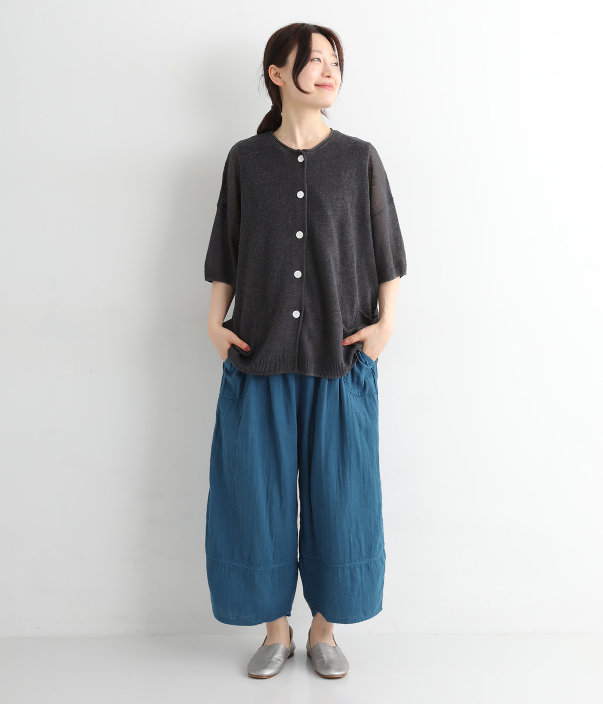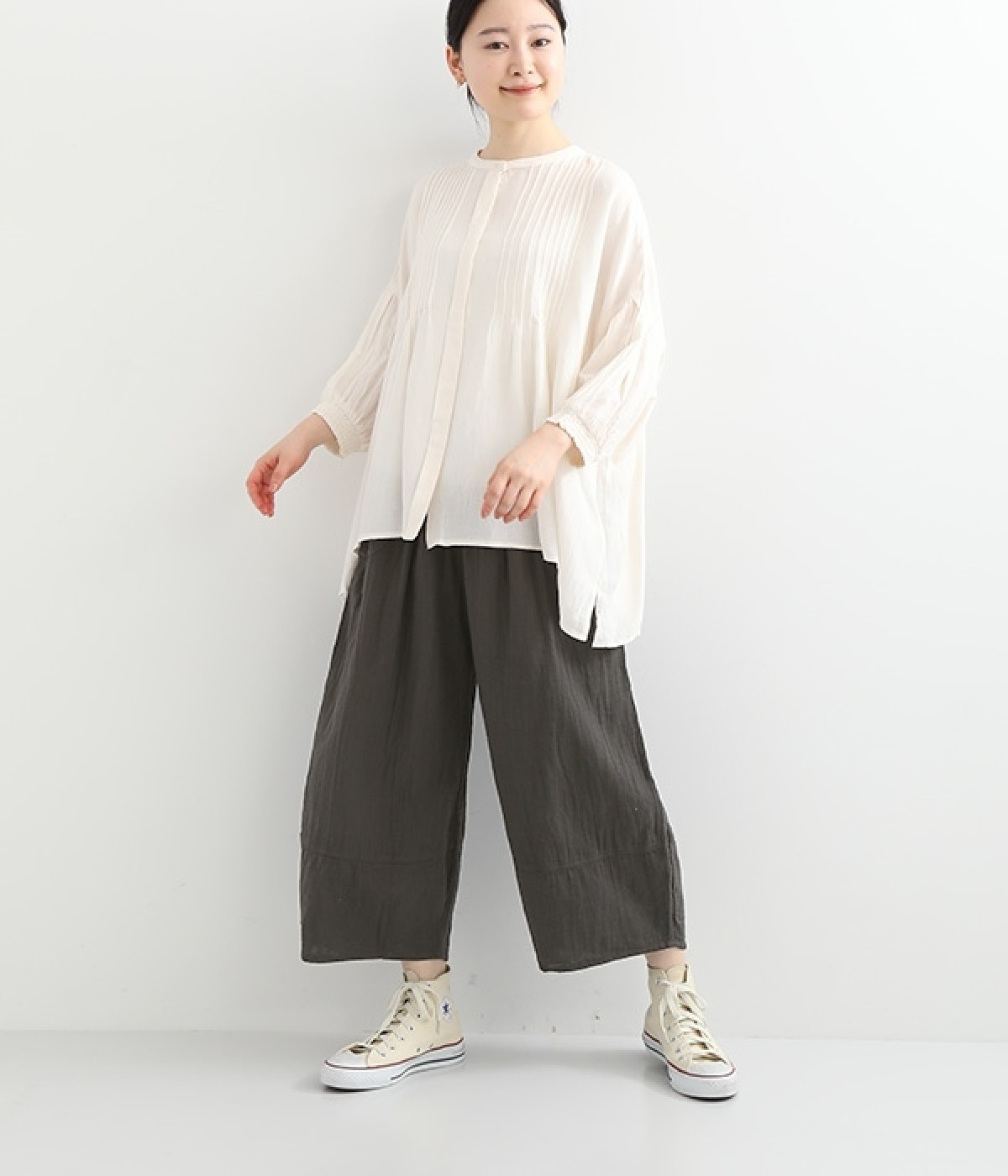 ダブルガーゼを使用した、丸みのあるリラックスシルエットがかわいいピエロパンツです。ガーゼ生地を2枚重ねているので軽やかながらもしっかりとしたはき心地が嬉しい一着。ウエストにはゴムをぐるりと入れて、腰まわりをやさしいフィットに。丈はやや短めに設定しているため、シューズやソックスの選び方により足元の雰囲気を変えられます。