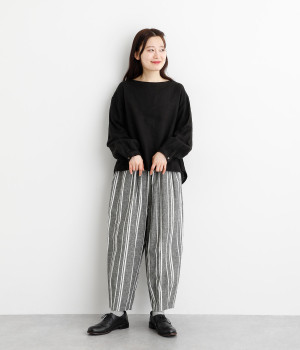 ワタリをたっぷり取ったボリューム感のあるテーパードパンツです。ヒップまわりにゆとりを持たせているので体のラインも拾いにくく、リラックスムードにもなじむ一本。ウエストは安定感のある総ゴムでストレスフリーです。