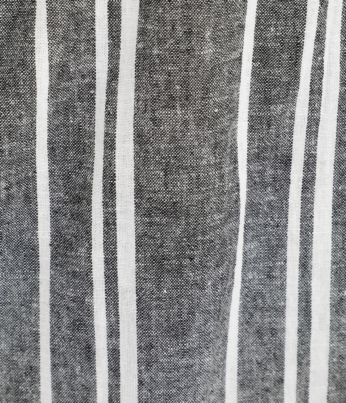 ランダムなストライプ柄が特徴で落ち着いた配色がスタイリングしやすい生地感です。肌へのまとわりが少ないドライタッチな綿麻生地で、あたたかな季節まで快適に着用できます。