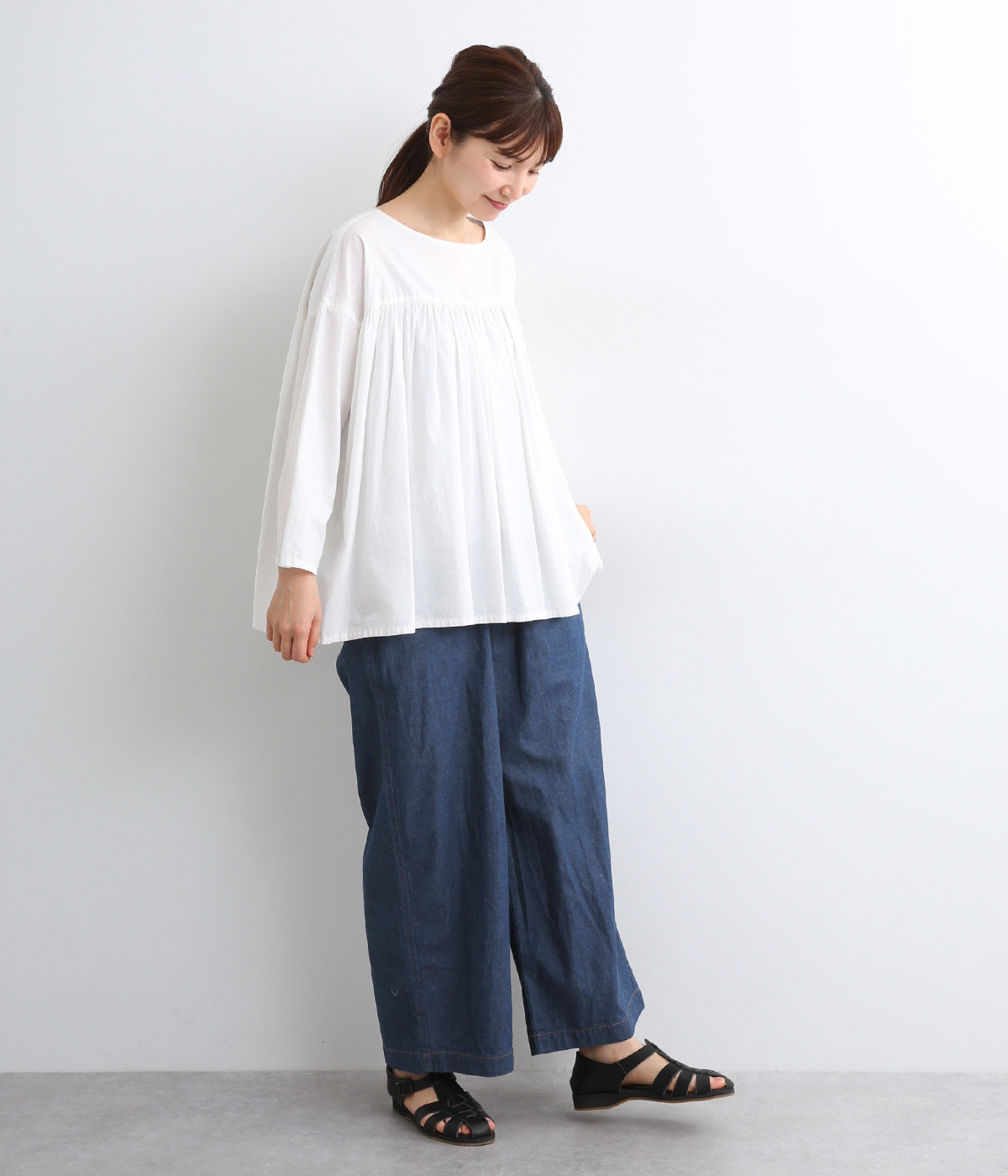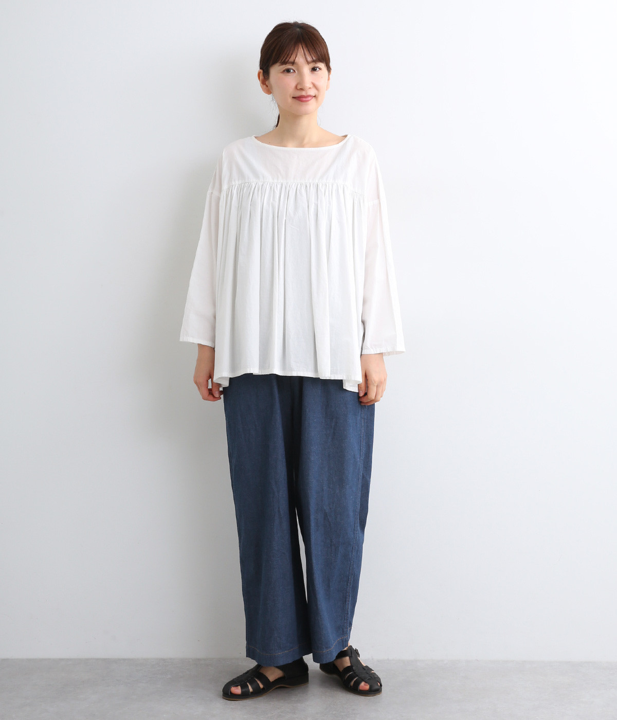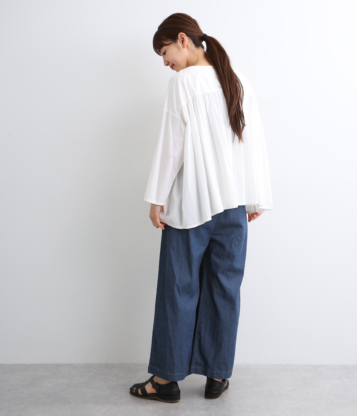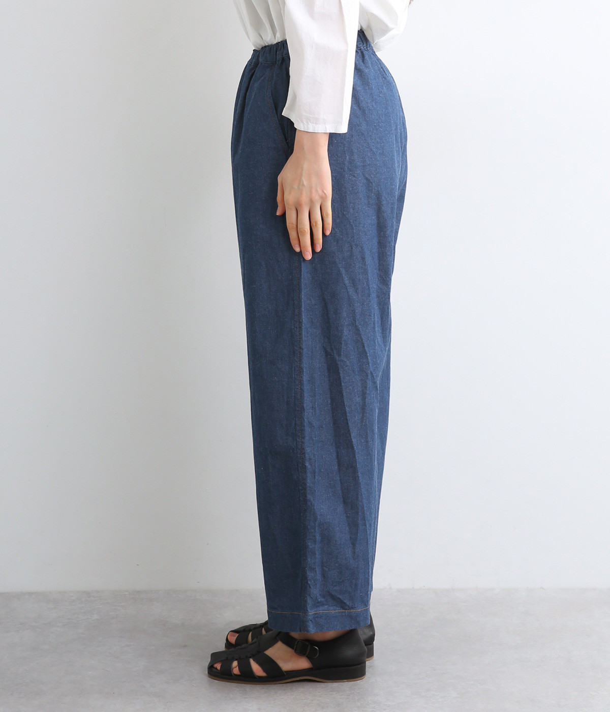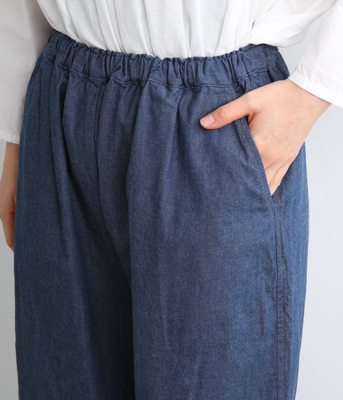 薄め中厚手のやわらかいコットンデニム生地を使用しました。着用初期からごわつきにくくはきやすい生地感で、他の素材にはないデニム特有の色落ちも味わえます。