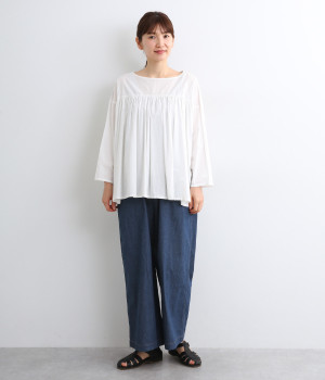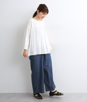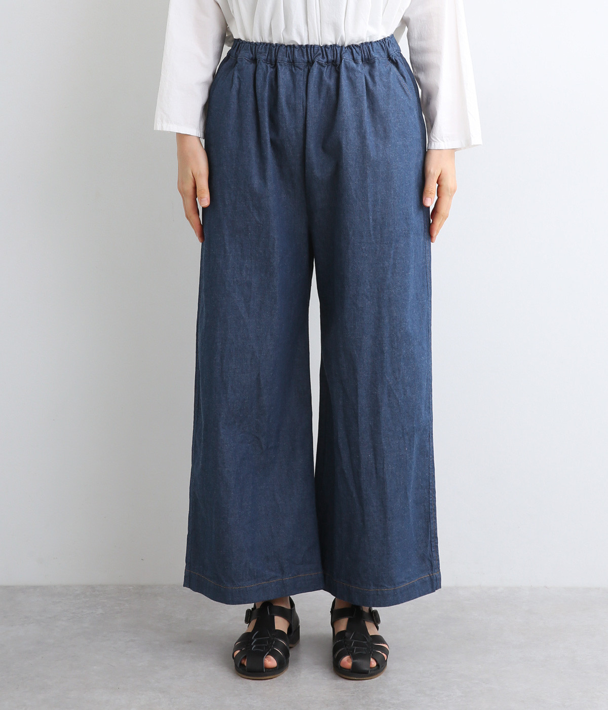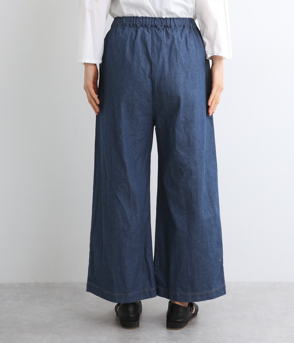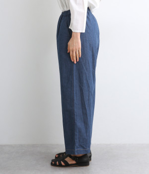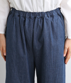 すとんとしたストレートラインがスタイリングしやすいワイドパンツです。ヒップポケットはあえてつけず、すっきり仕立てることでチュニックやワンピースなどとのレイヤードにも活躍します。ウエスト総ゴムのリラックス仕様です。
