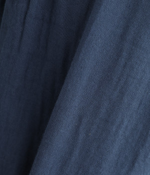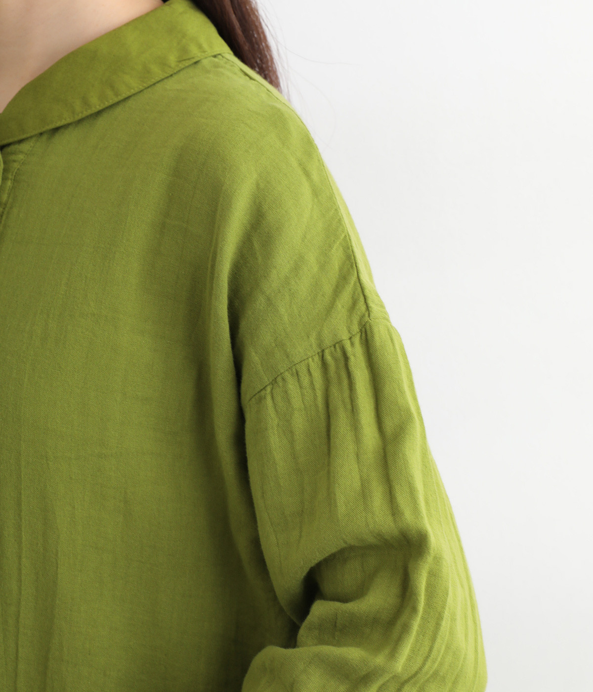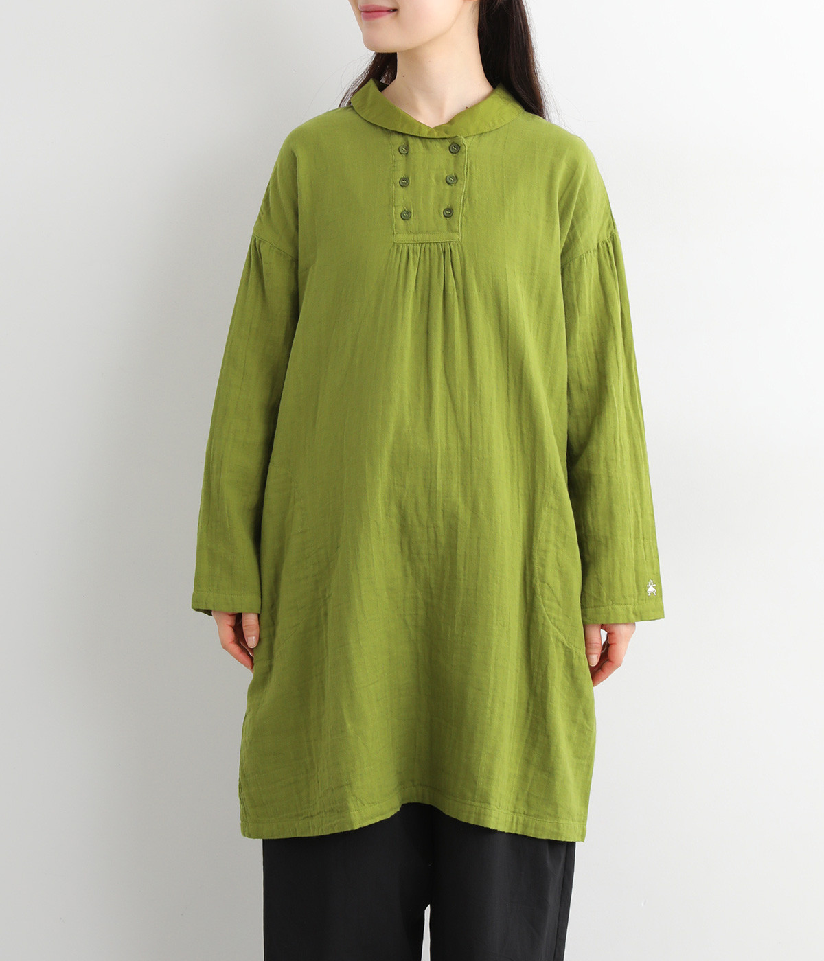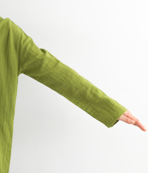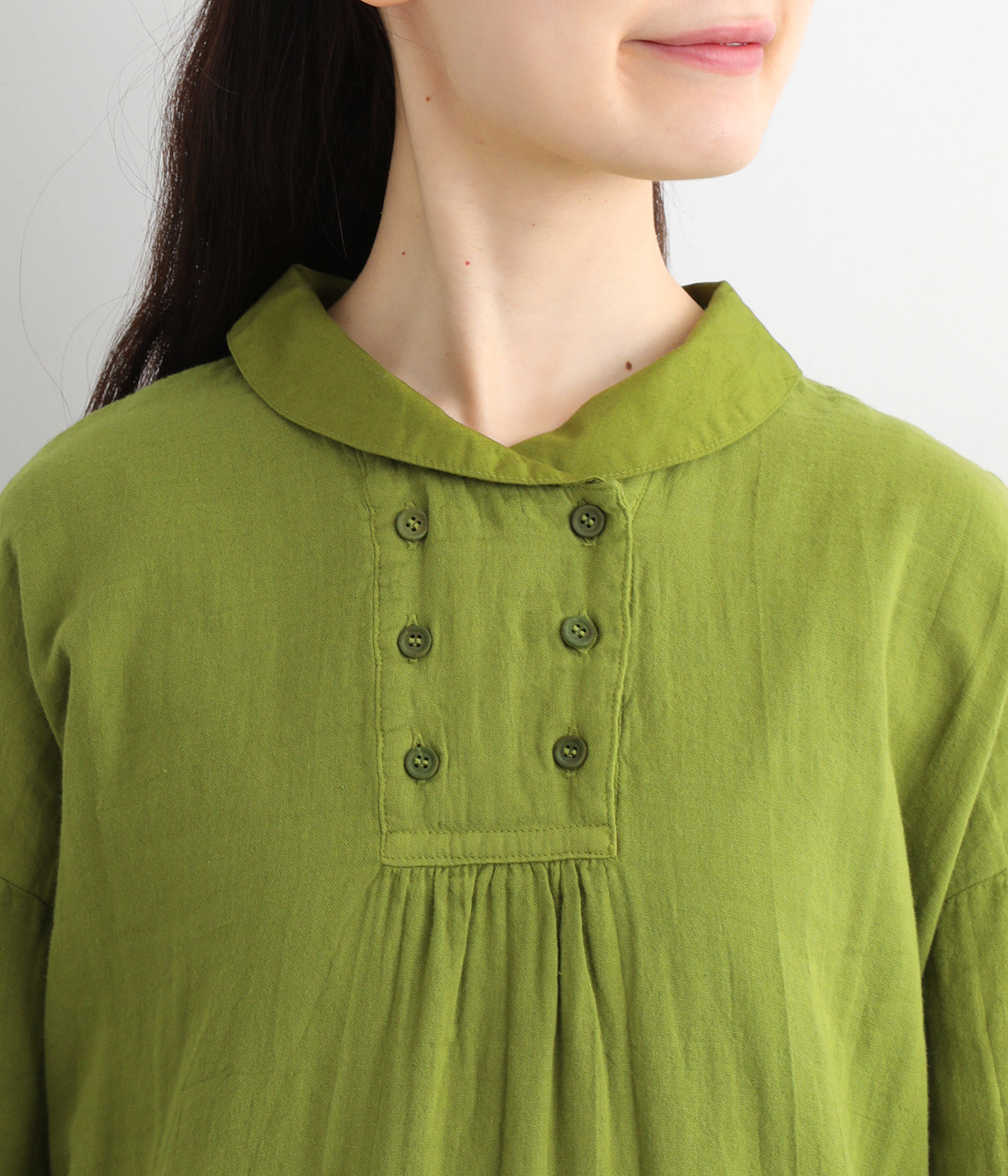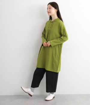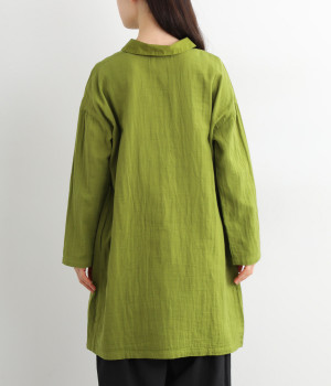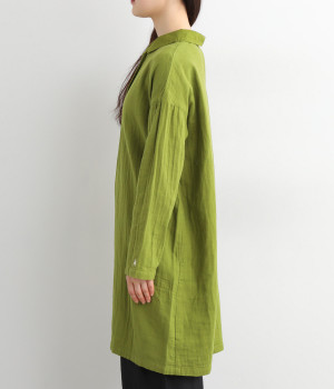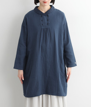 素肌に着たくなるようなソフトな風合いのコットンガーゼ素材。お出かけ着としてはもちろん、自宅でリラックスして過ごしたい日にもぴったりです。襟と前ボタン部分は同色の綿ブロードの生地で切り替えています。