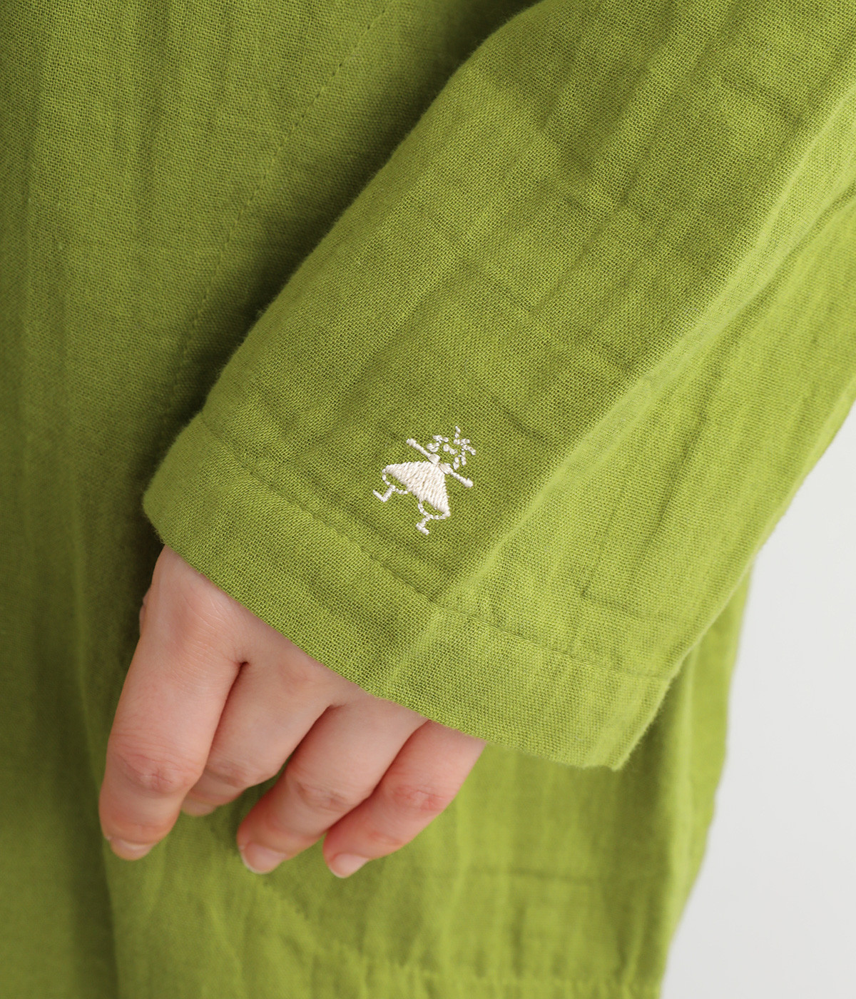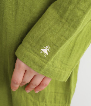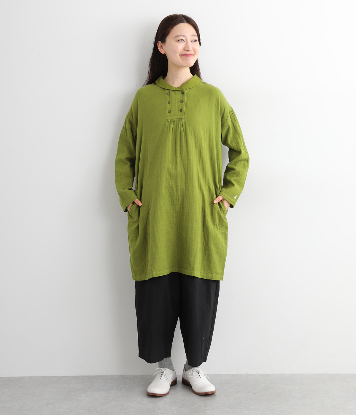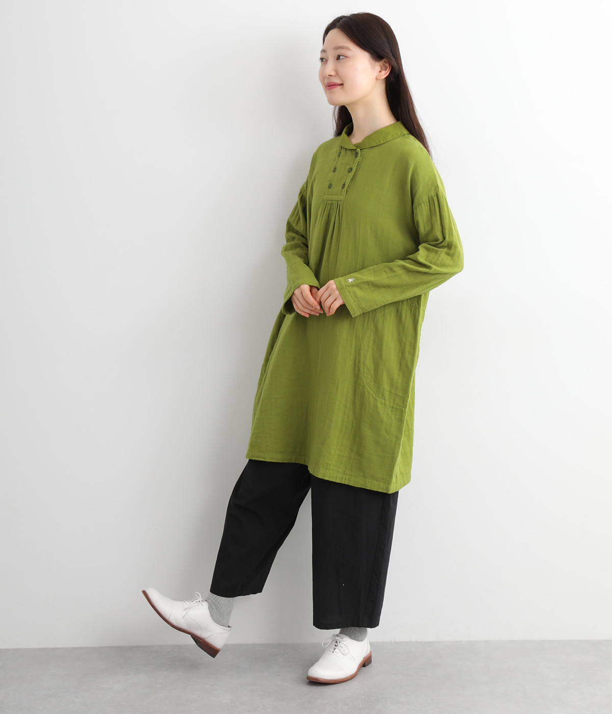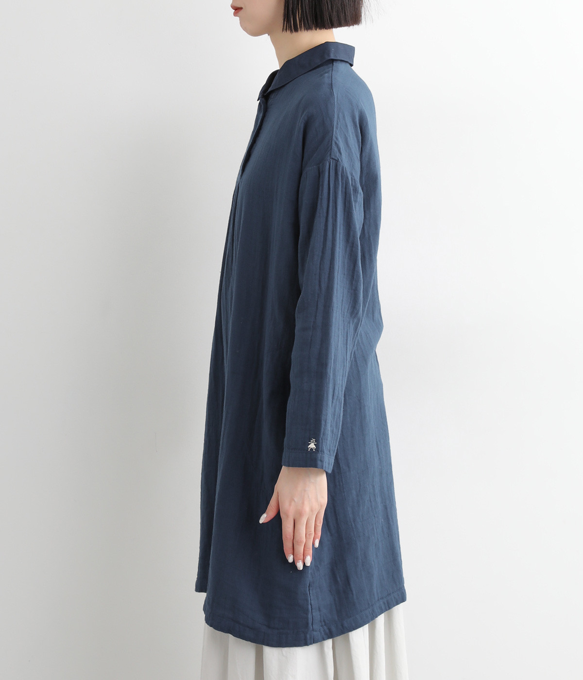 素肌に着たくなるようなソフトな風合いのコットンガーゼ素材。お出かけ着としてはもちろん、自宅でリラックスして過ごしたい日にもぴったりです。襟と前ボタン部分は同色の綿ブロードの生地で切り替えています。