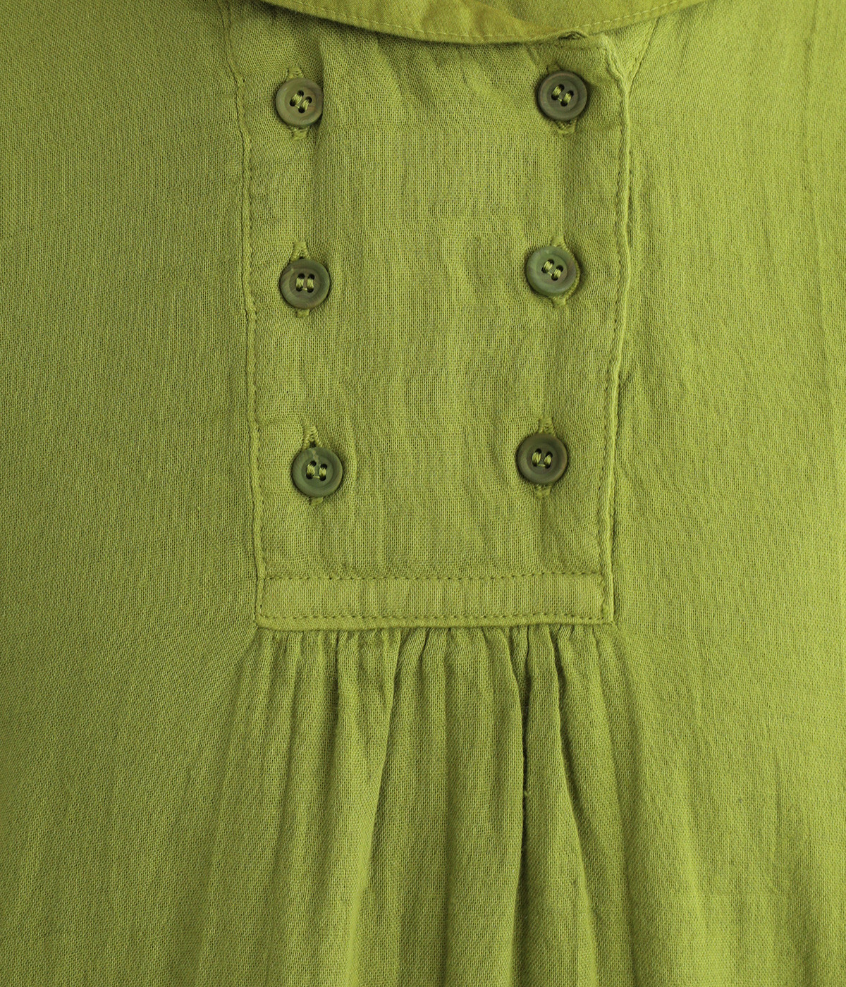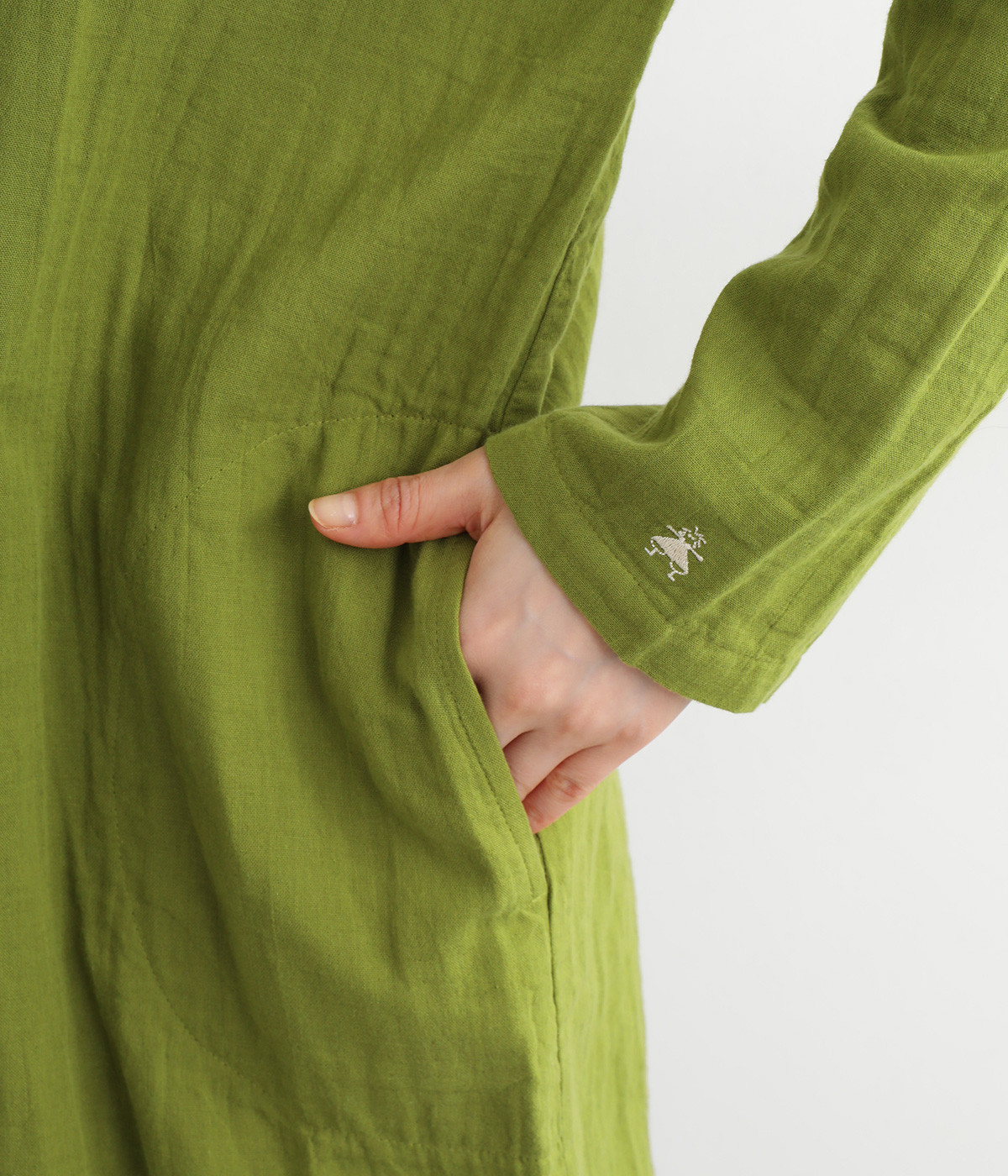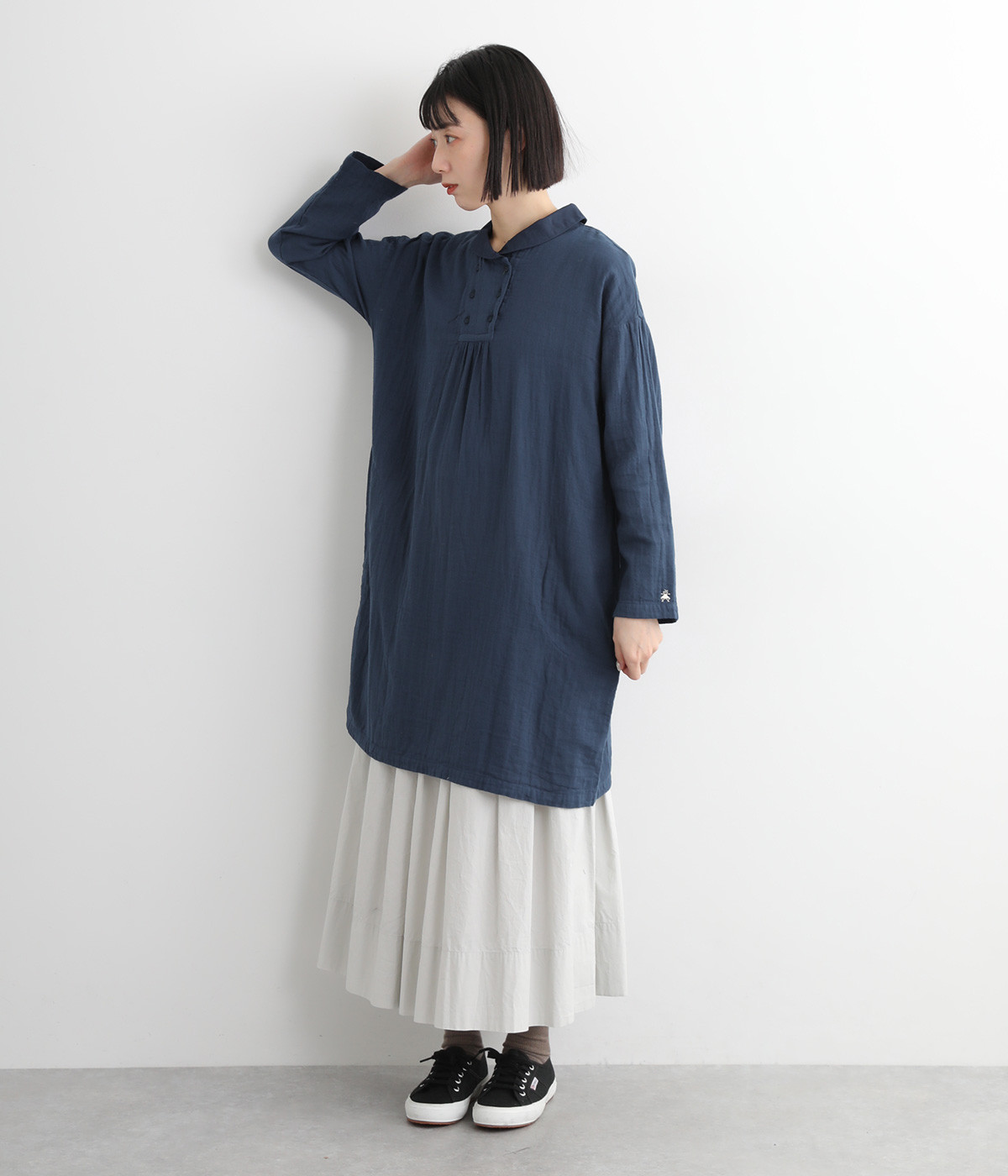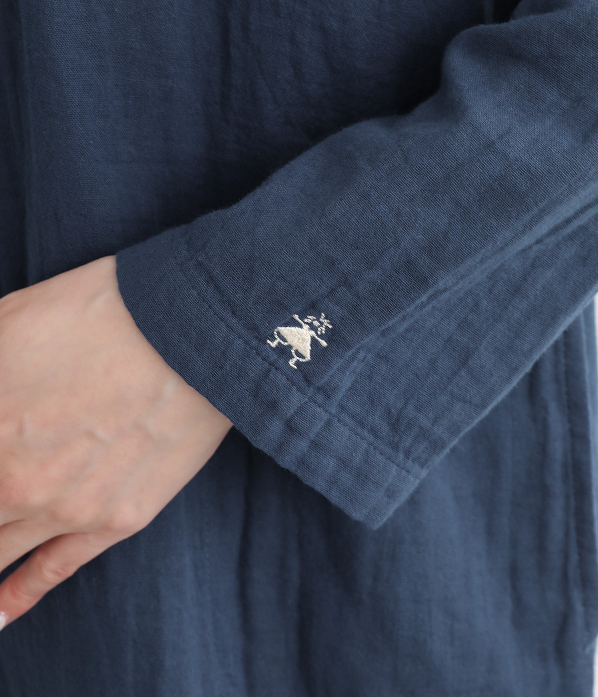 素肌に着たくなるようなソフトな風合いのコットンガーゼ素材。お出かけ着としてはもちろん、自宅でリラックスして過ごしたい日にもぴったりです。襟と前ボタン部分は同色の綿ブロードの生地で切り替えています。