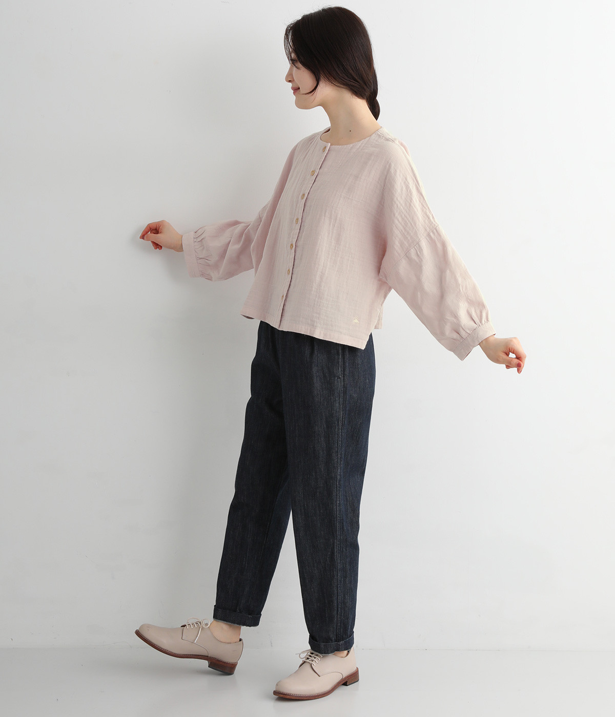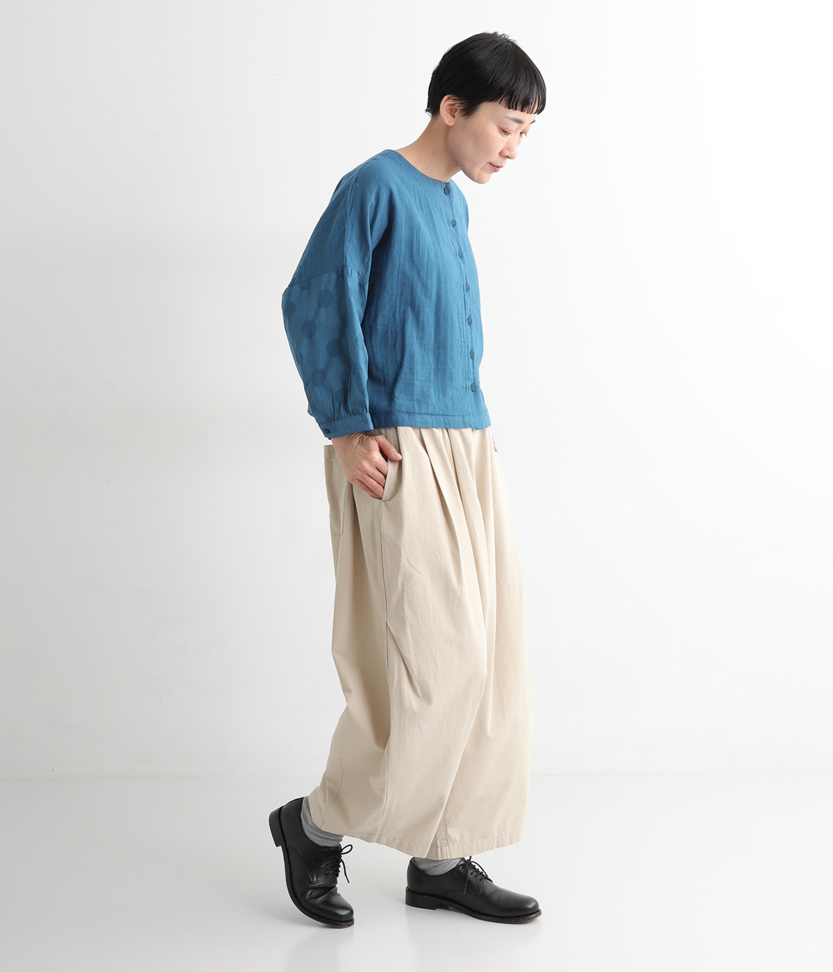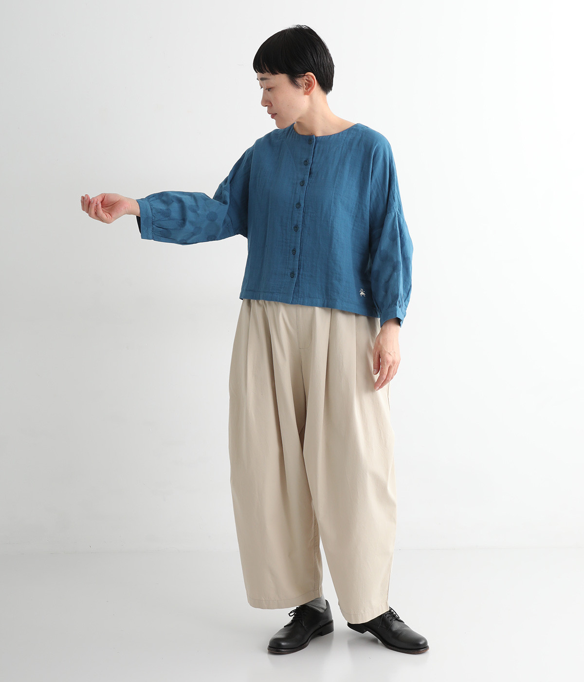 ショート丈×ワイドな身幅がかわいいブラウスです。ドロップショルダーのリラックスしたシルエット。少しだけ手首がのぞく袖丈が、抜け感をプラスします。前開きタイプなので、カーディガン感覚で羽織りとして取り入れても◎。