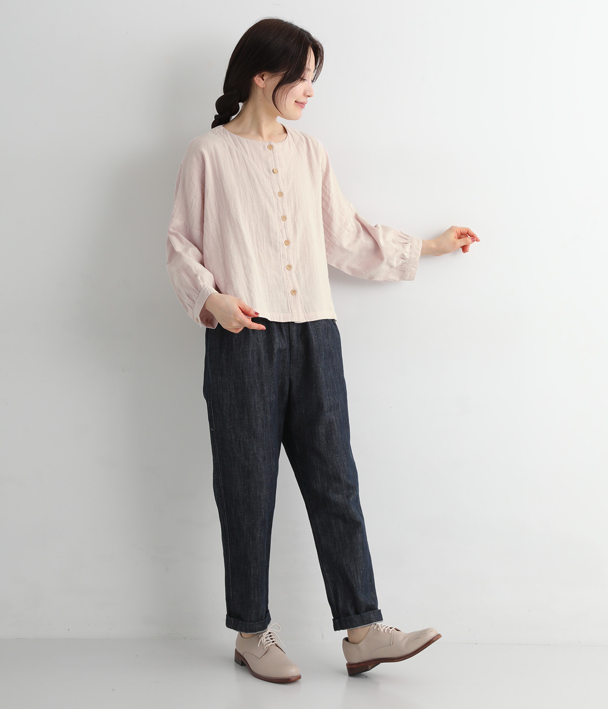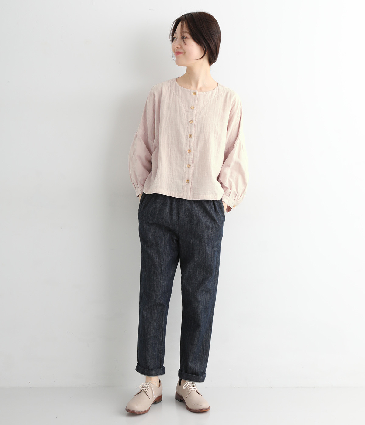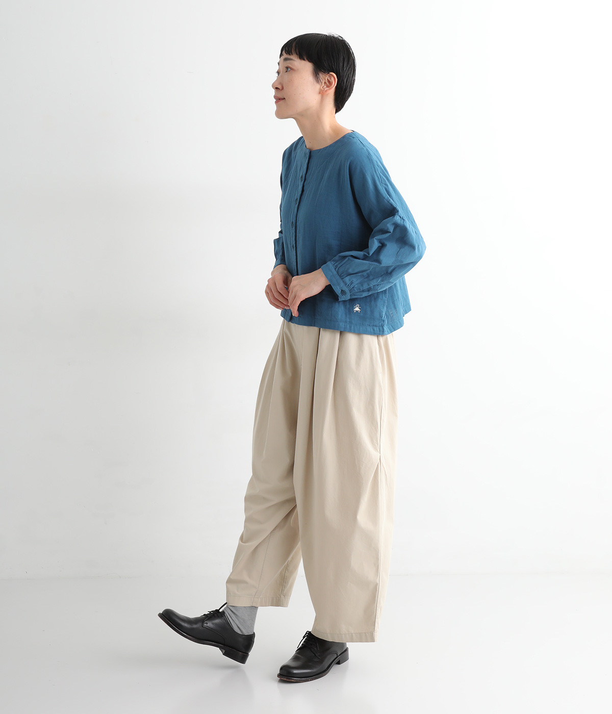 ショート丈×ワイドな身幅がかわいいブラウスです。ドロップショルダーのリラックスしたシルエット。少しだけ手首がのぞく袖丈が、抜け感をプラスします。前開きタイプなので、カーディガン感覚で羽織りとして取り入れても◎。