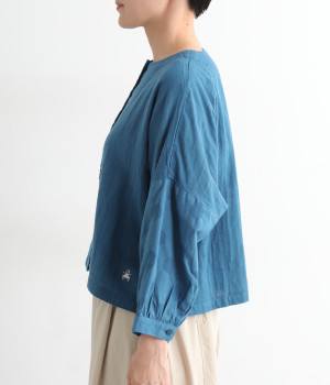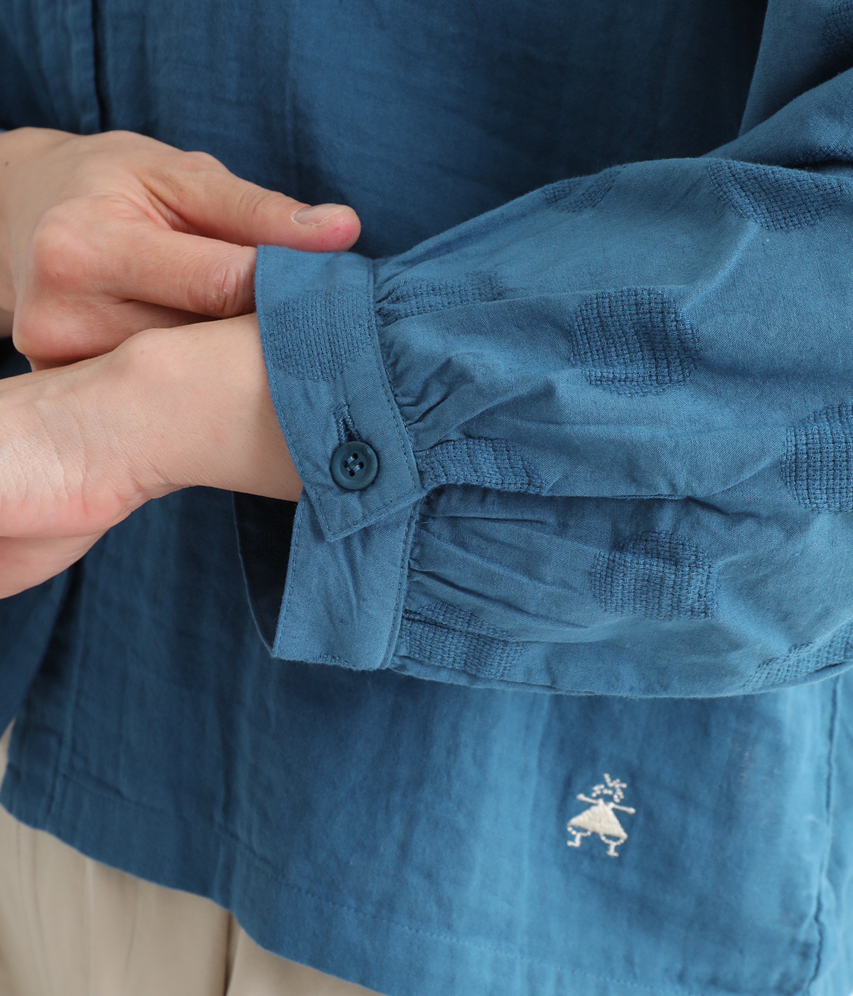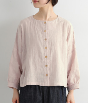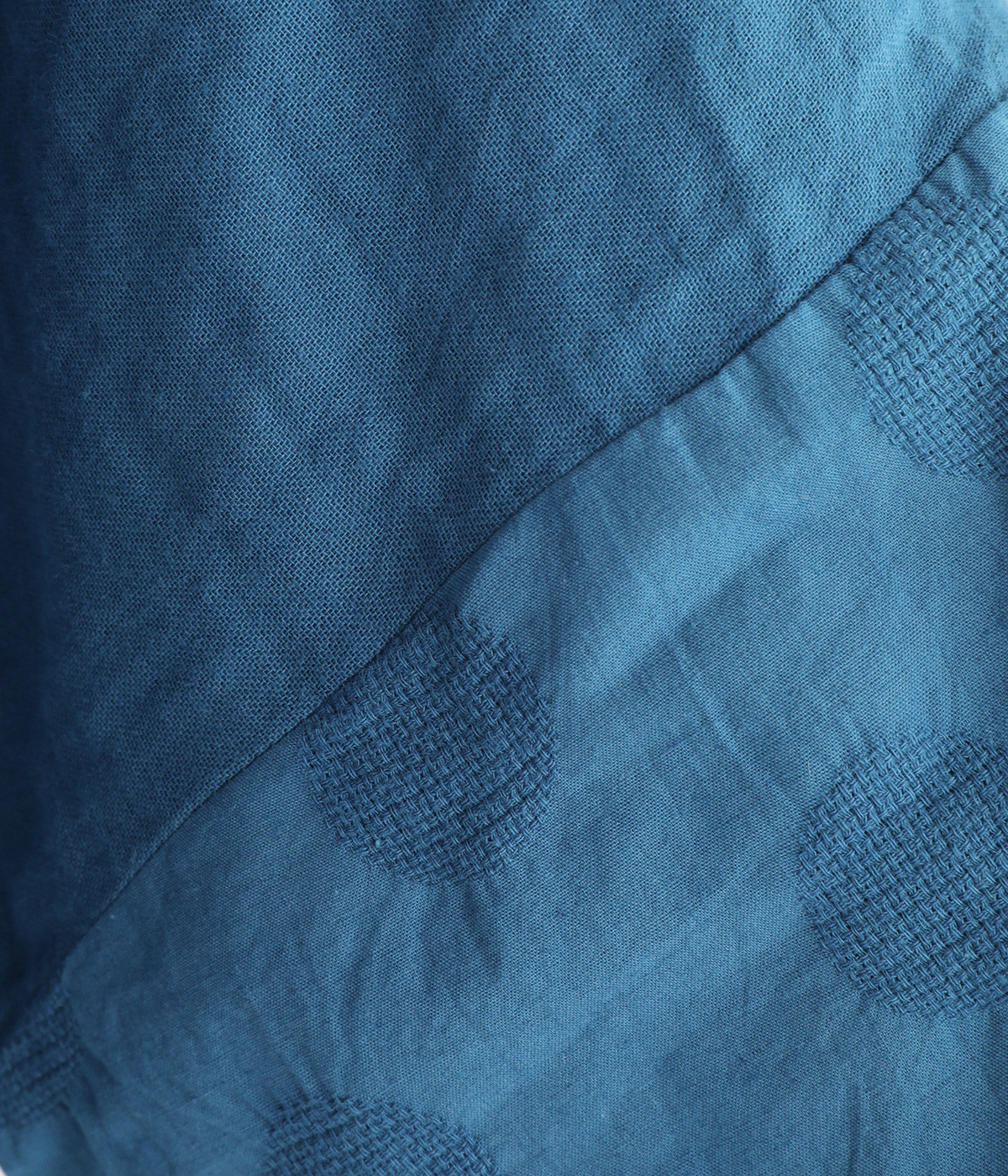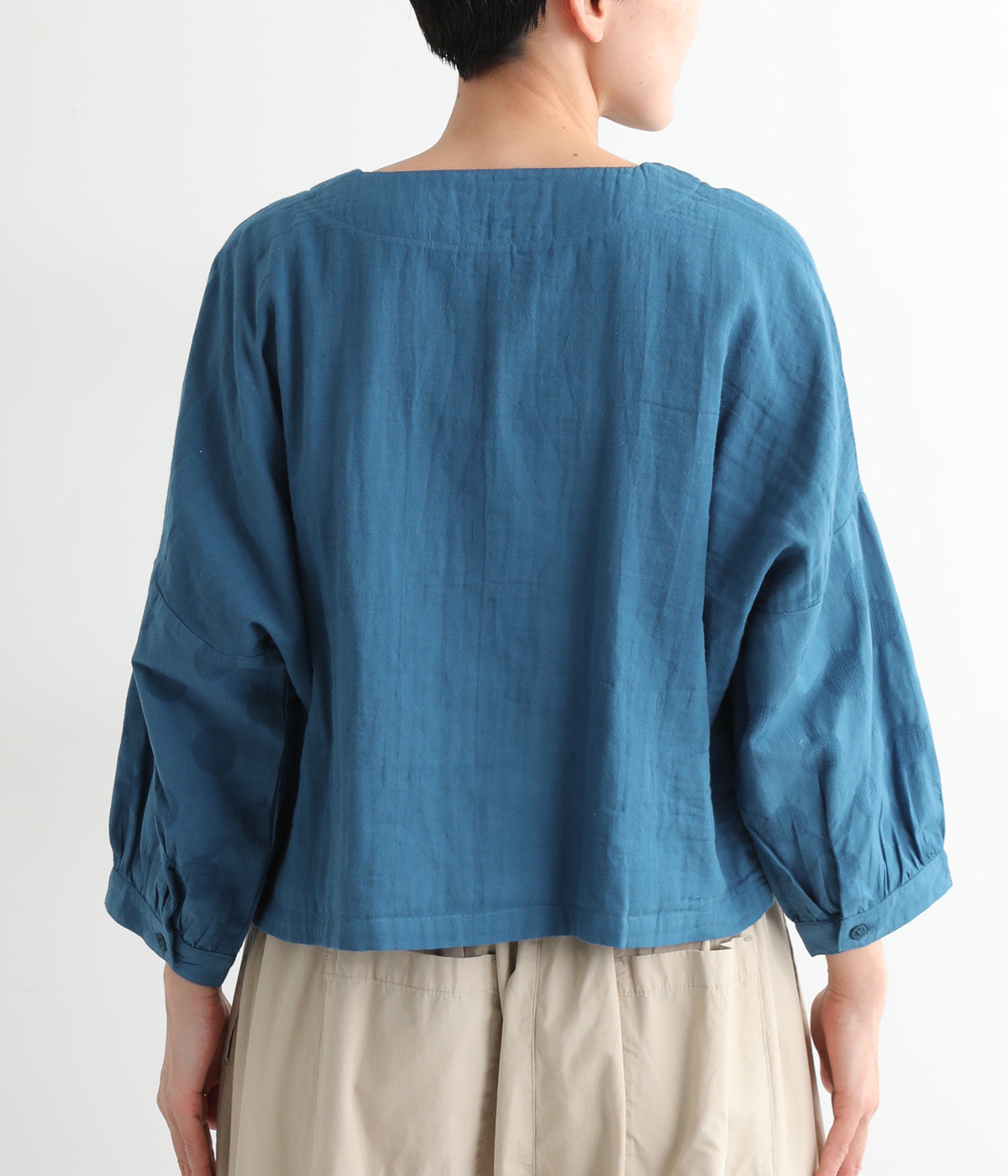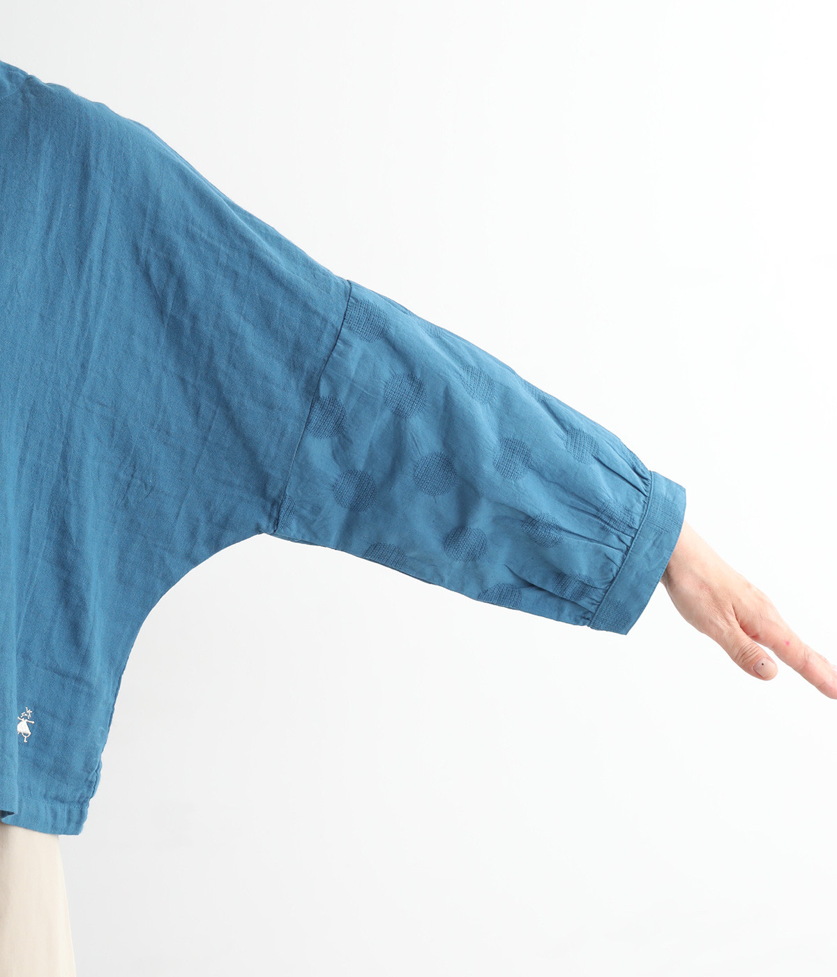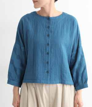 コットンダブルガーゼのやわらかな風合いが魅力。着続けるほどにさらに肌になじんでいきます。袖部分にはドット柄の綿麻ジャカード生地を使用。