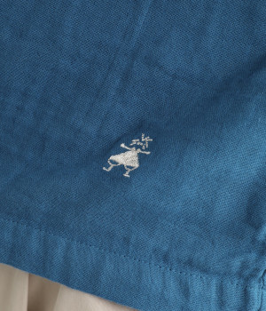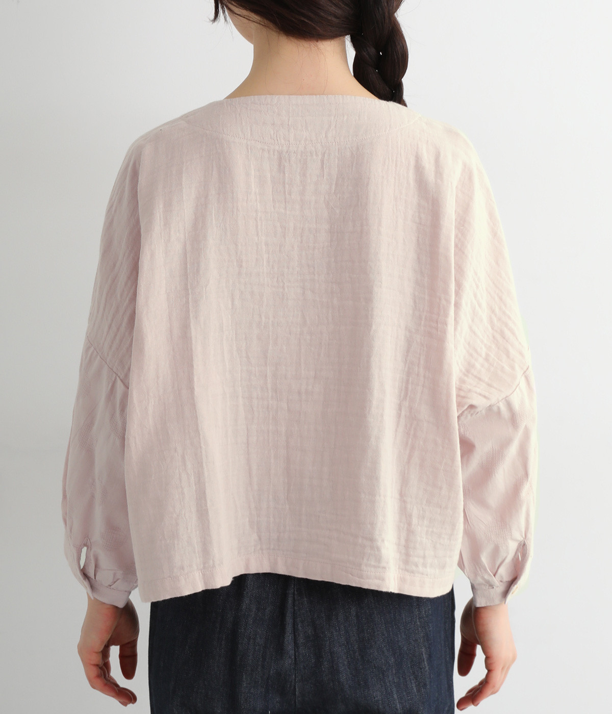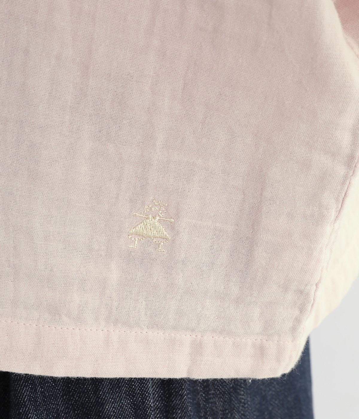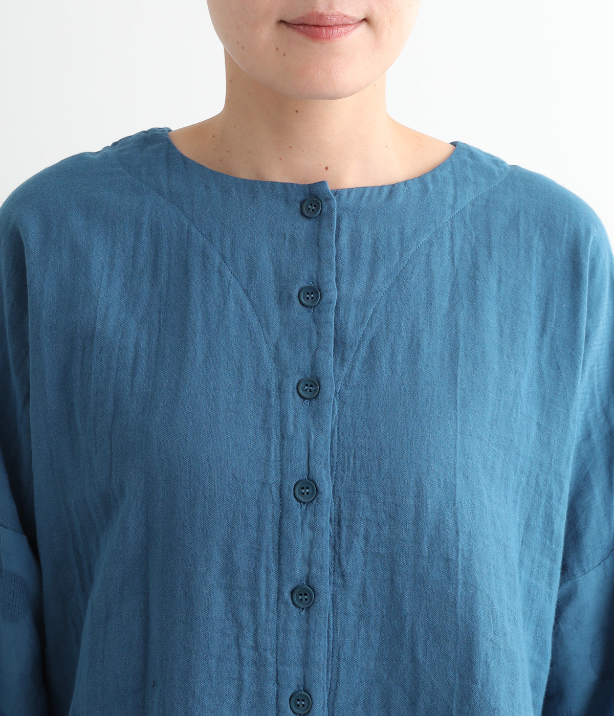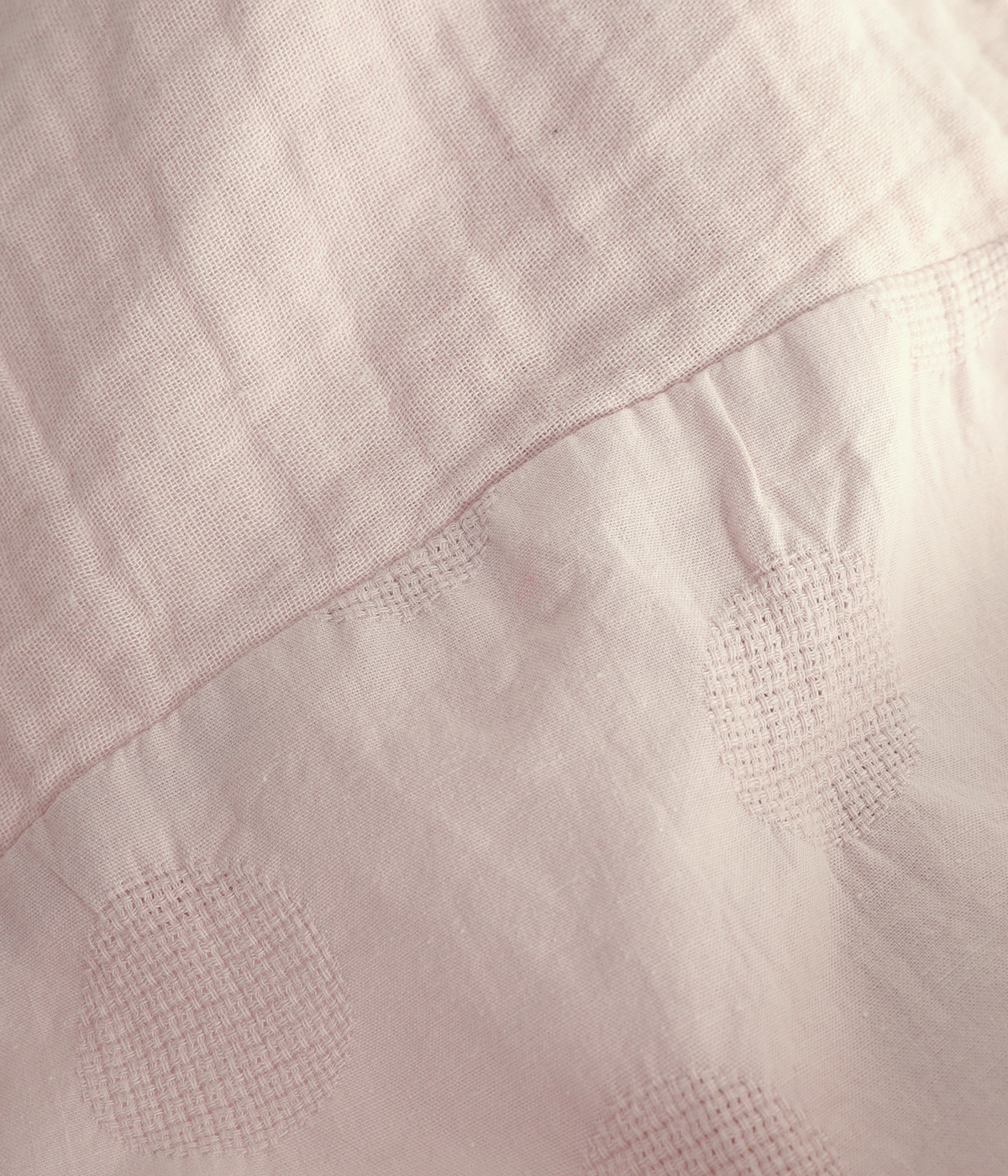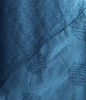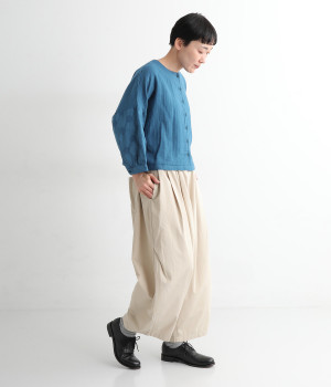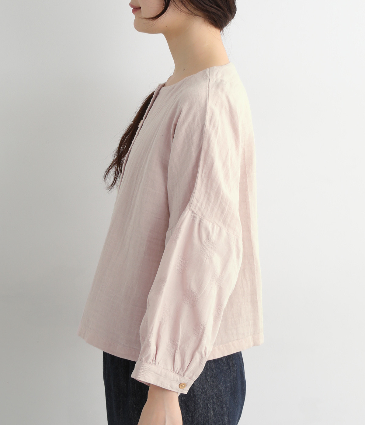 コットンダブルガーゼのやわらかな風合いが魅力。着続けるほどにさらに肌になじんでいきます。袖部分にはドット柄の綿麻ジャカード生地を使用。