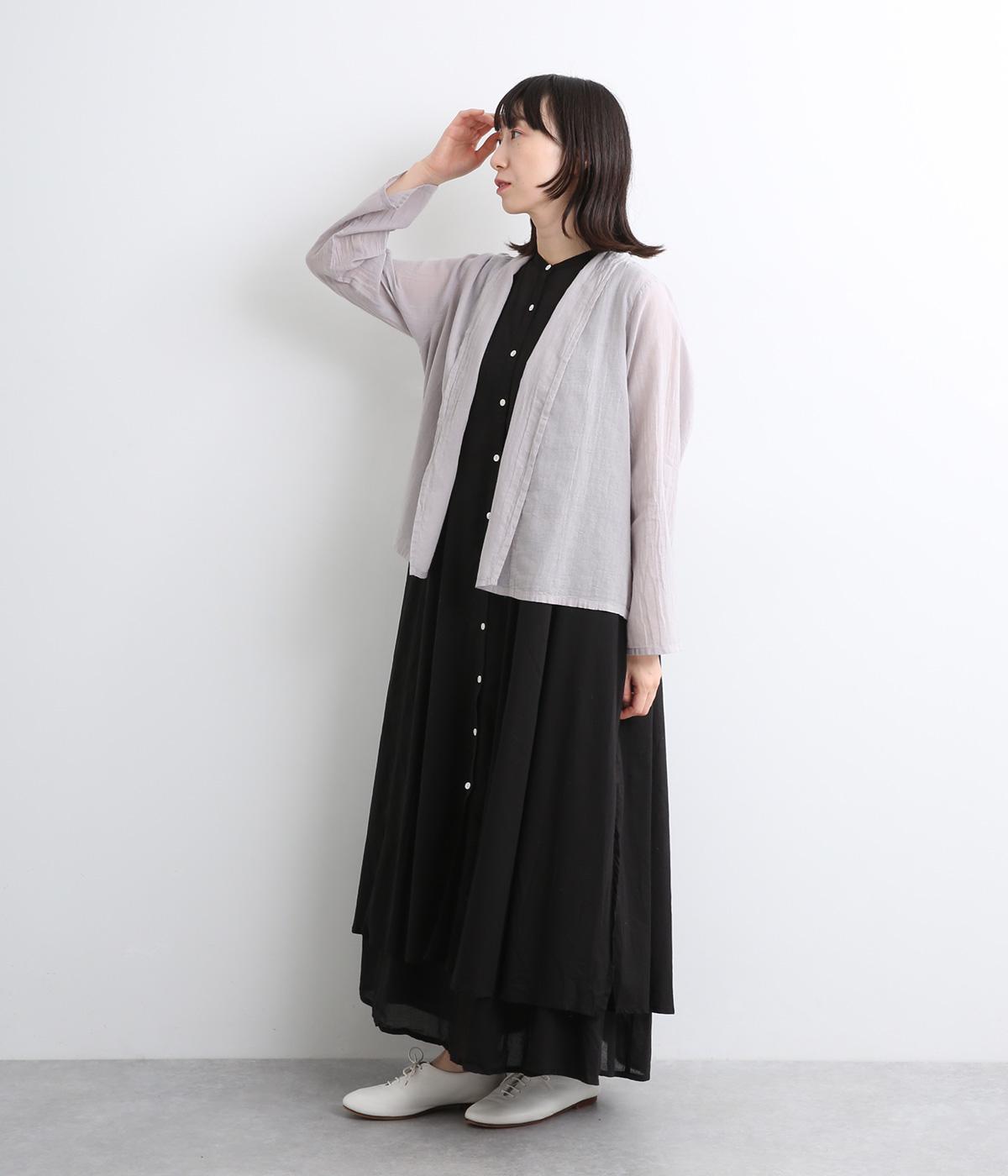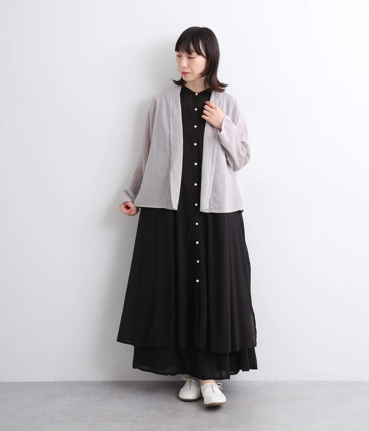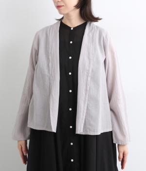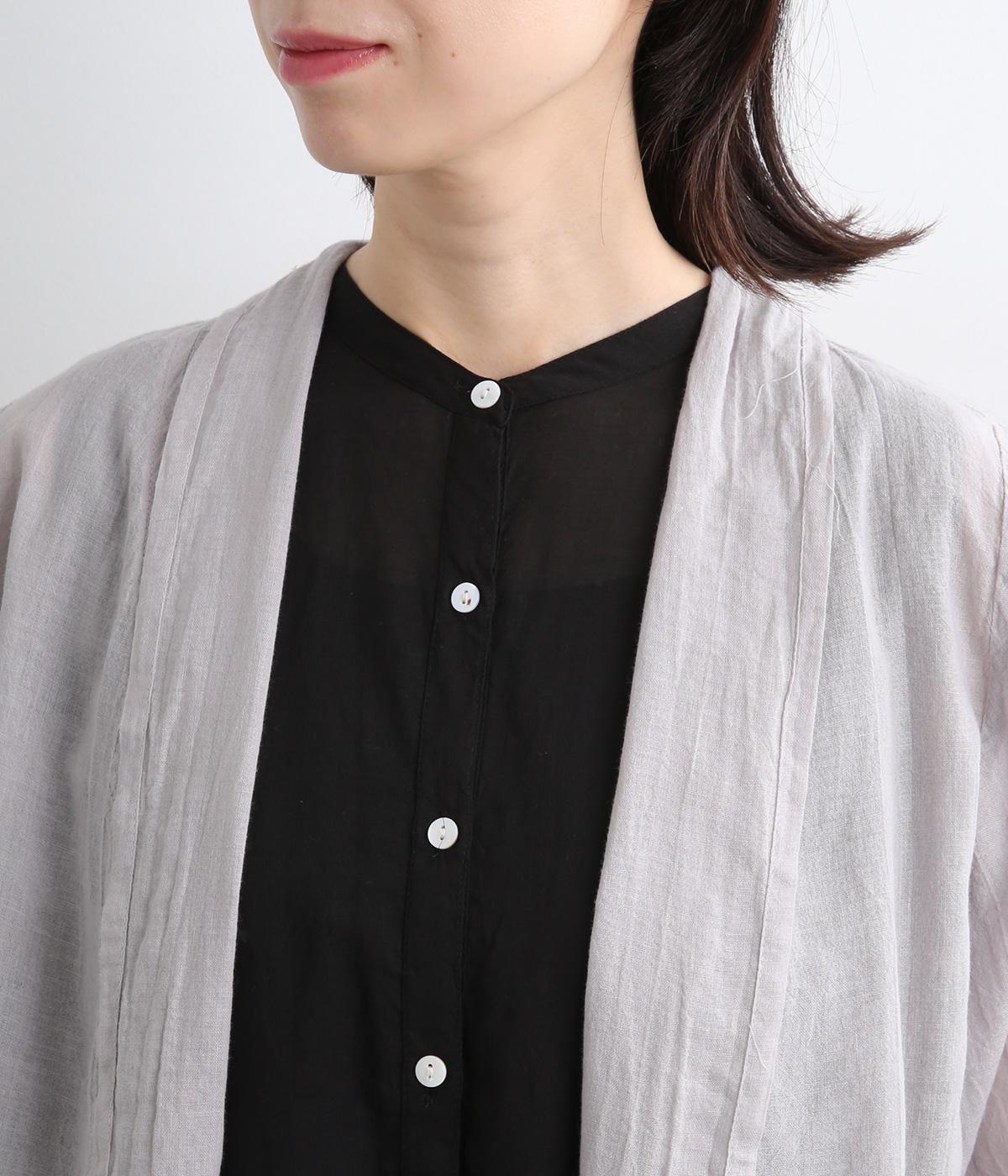 カーディガン感覚でさっとラフに羽織りやすいオープンタイプのブラウスです。襟元から前身頃中心に切り替えを入れて帯状に生地を足すことで、首後ろを少し隠して陽射しから守ったり、動きのあるデザインポイントにしました。シンプルで使い勝手も抜群です。