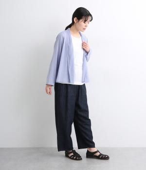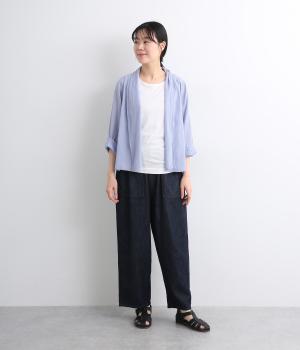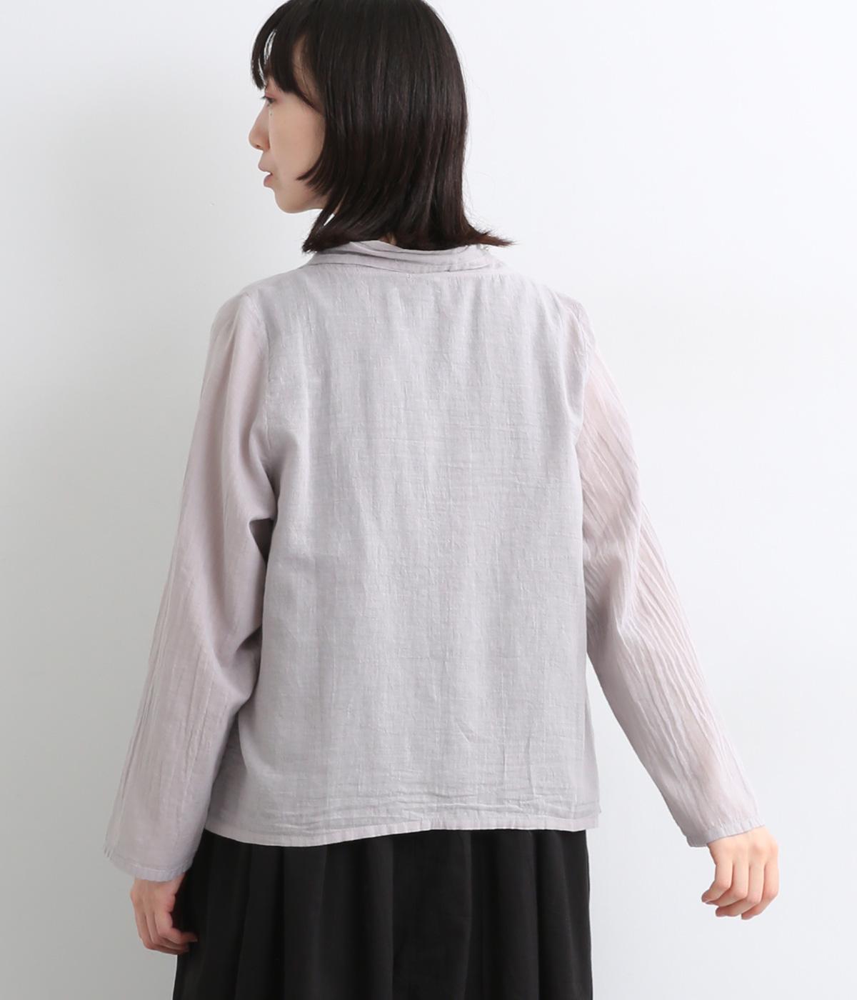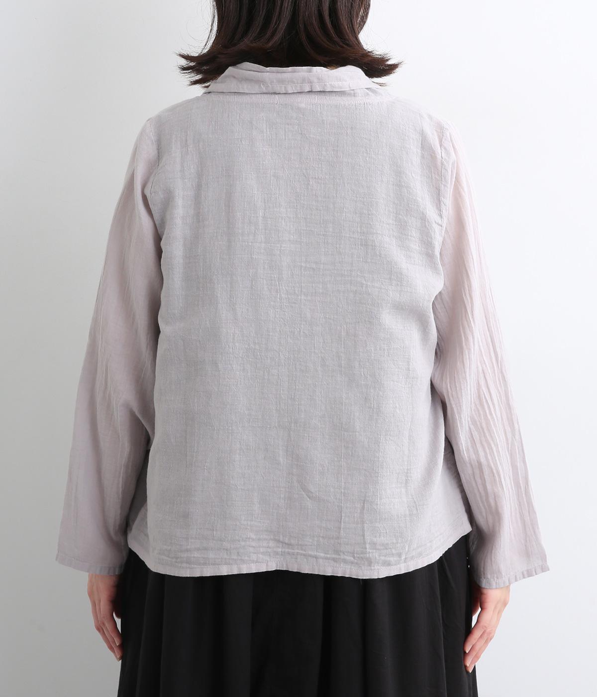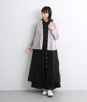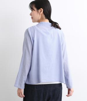 カーディガン感覚でさっとラフに羽織りやすいオープンタイプのブラウスです。襟元から前身頃中心に切り替えを入れて帯状に生地を足すことで、首後ろを少し隠して陽射しから守ったり、動きのあるデザインポイントにしました。シンプルで使い勝手も抜群です。