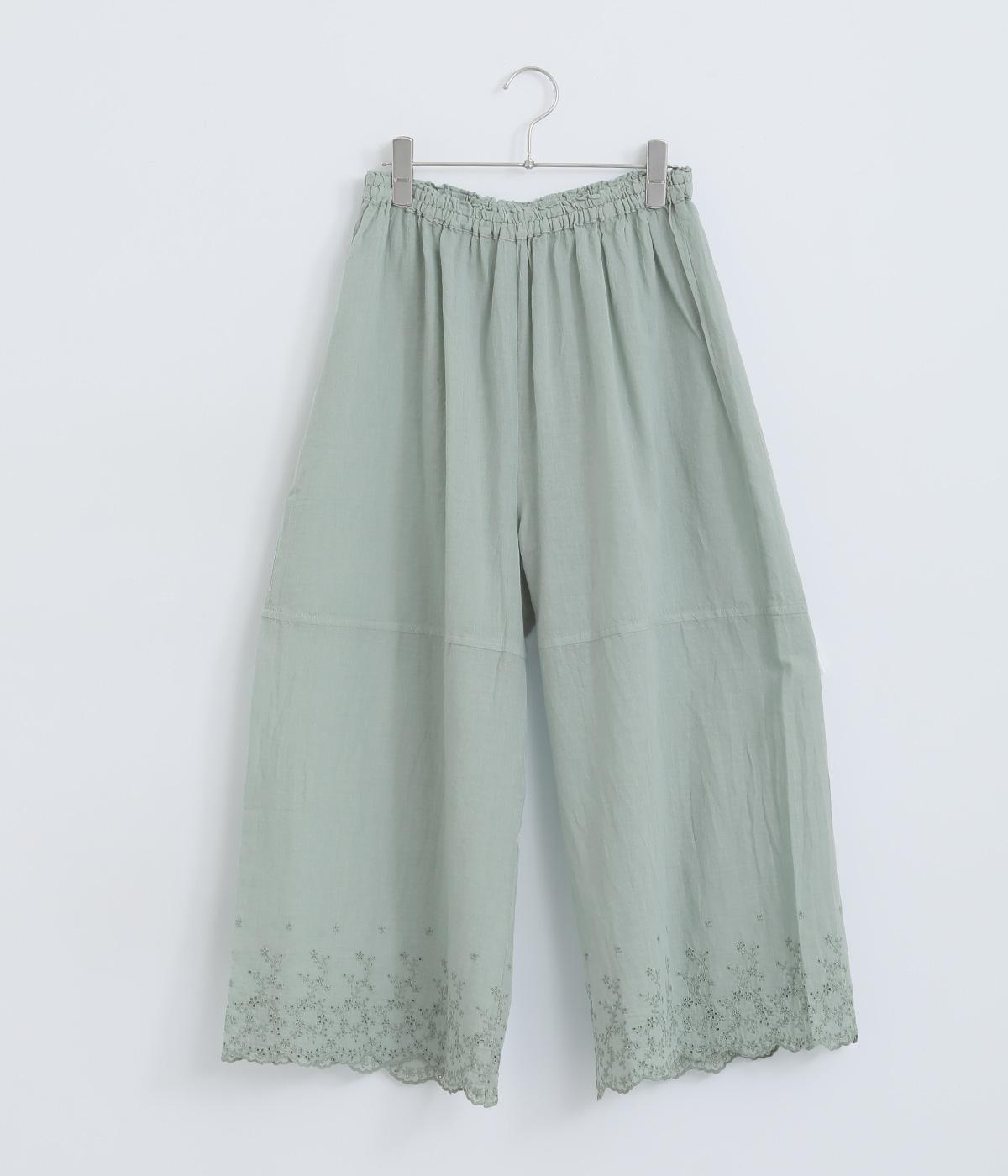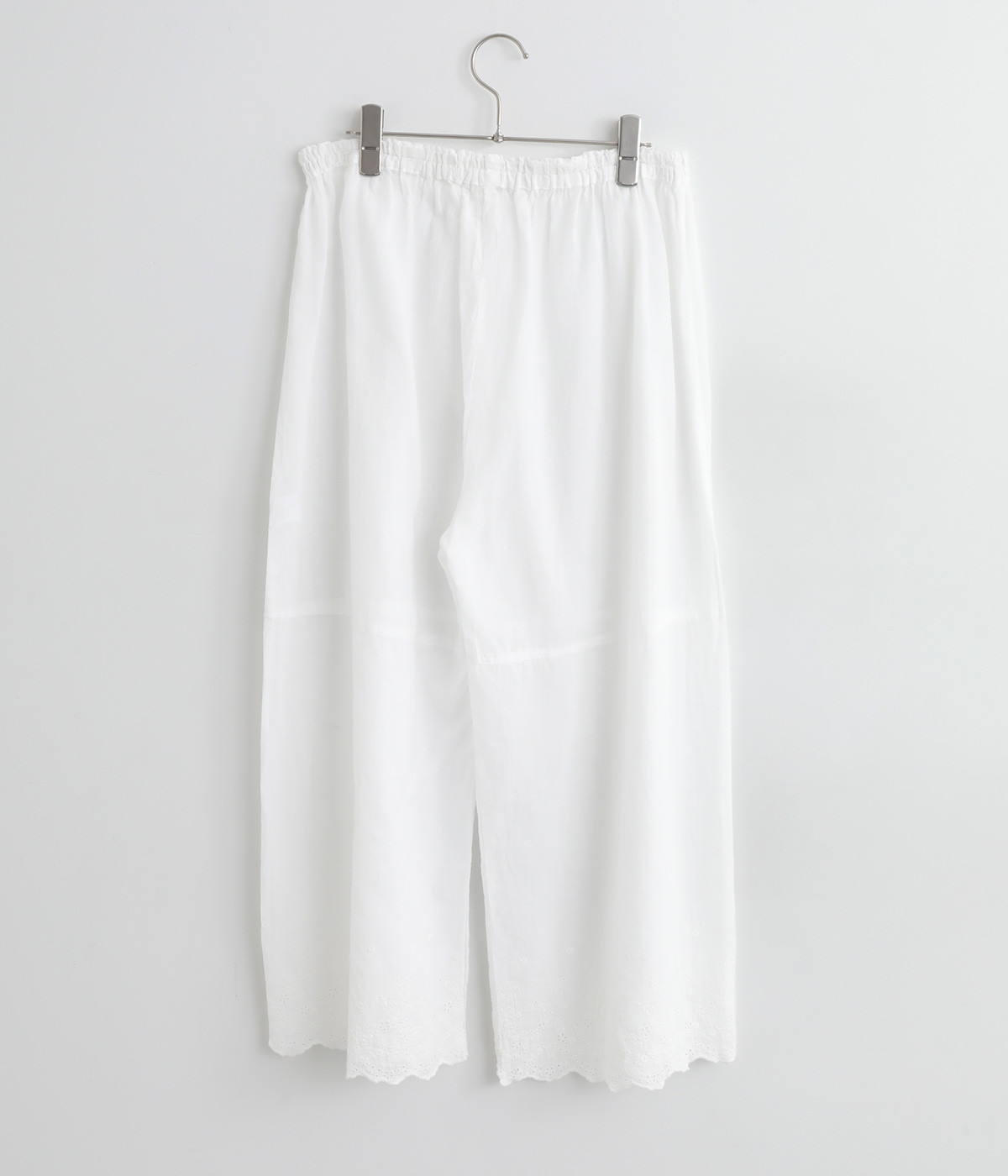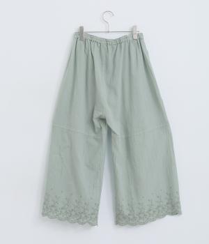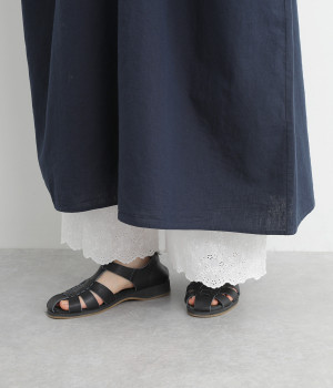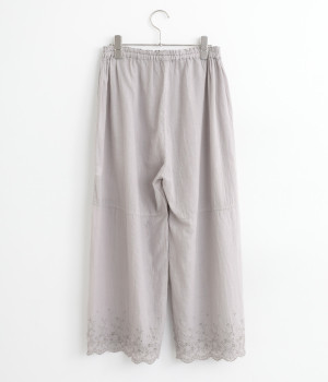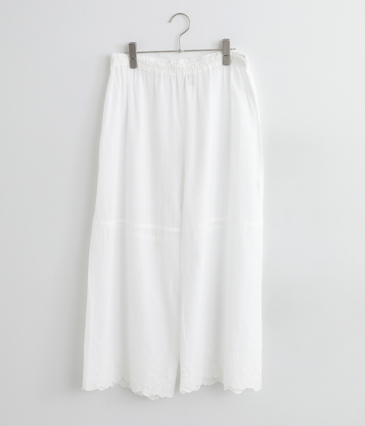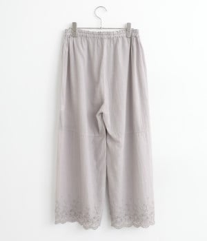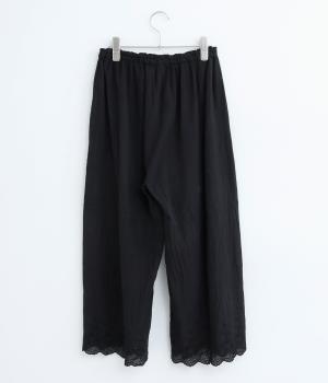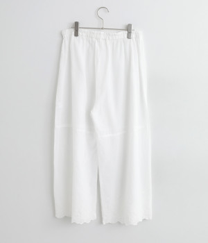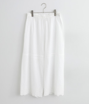 スカートやワンピースの下にはくペチパンツ。裾のスカラップとアイレット刺しゅうでデザイン性を持たせました。ゆとりのあるワイドシルエットと軽い素材感ではき心地は快適。ボトムの裾からちらりと見せてもおしゃれです。