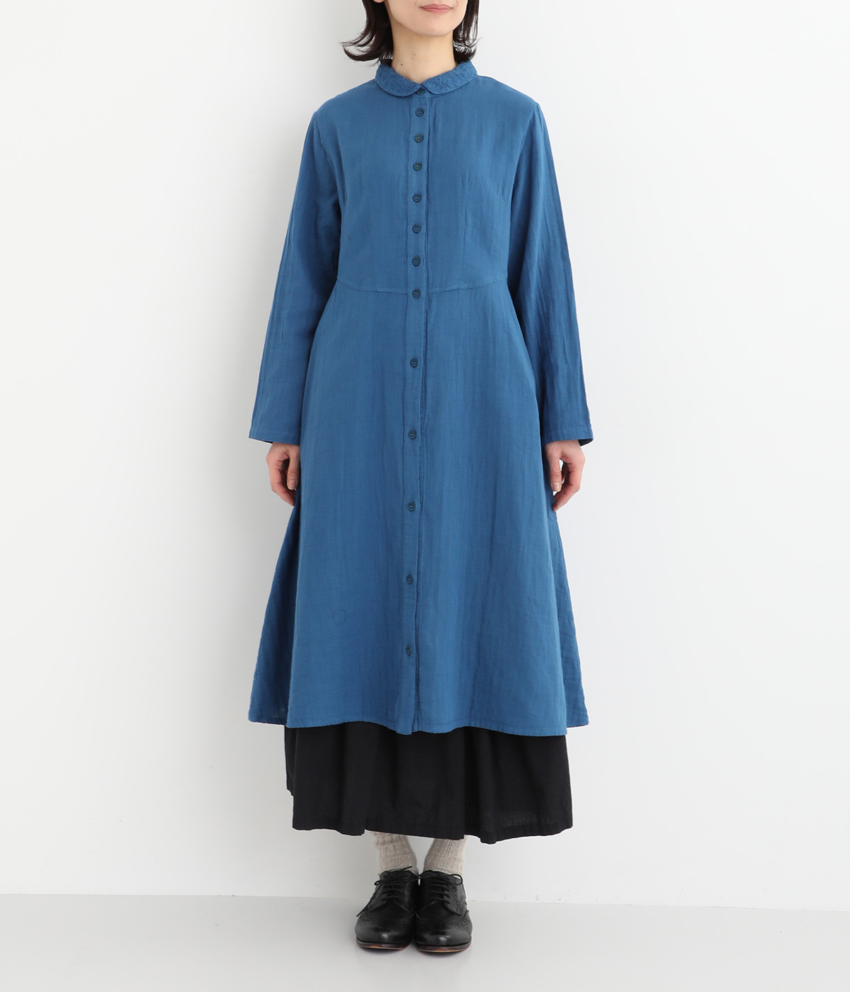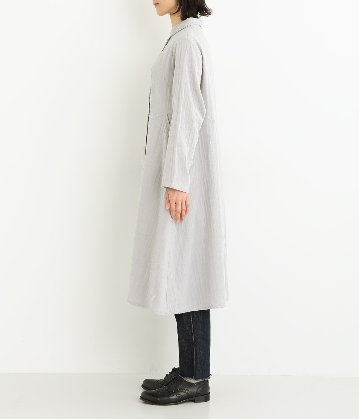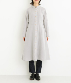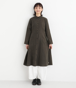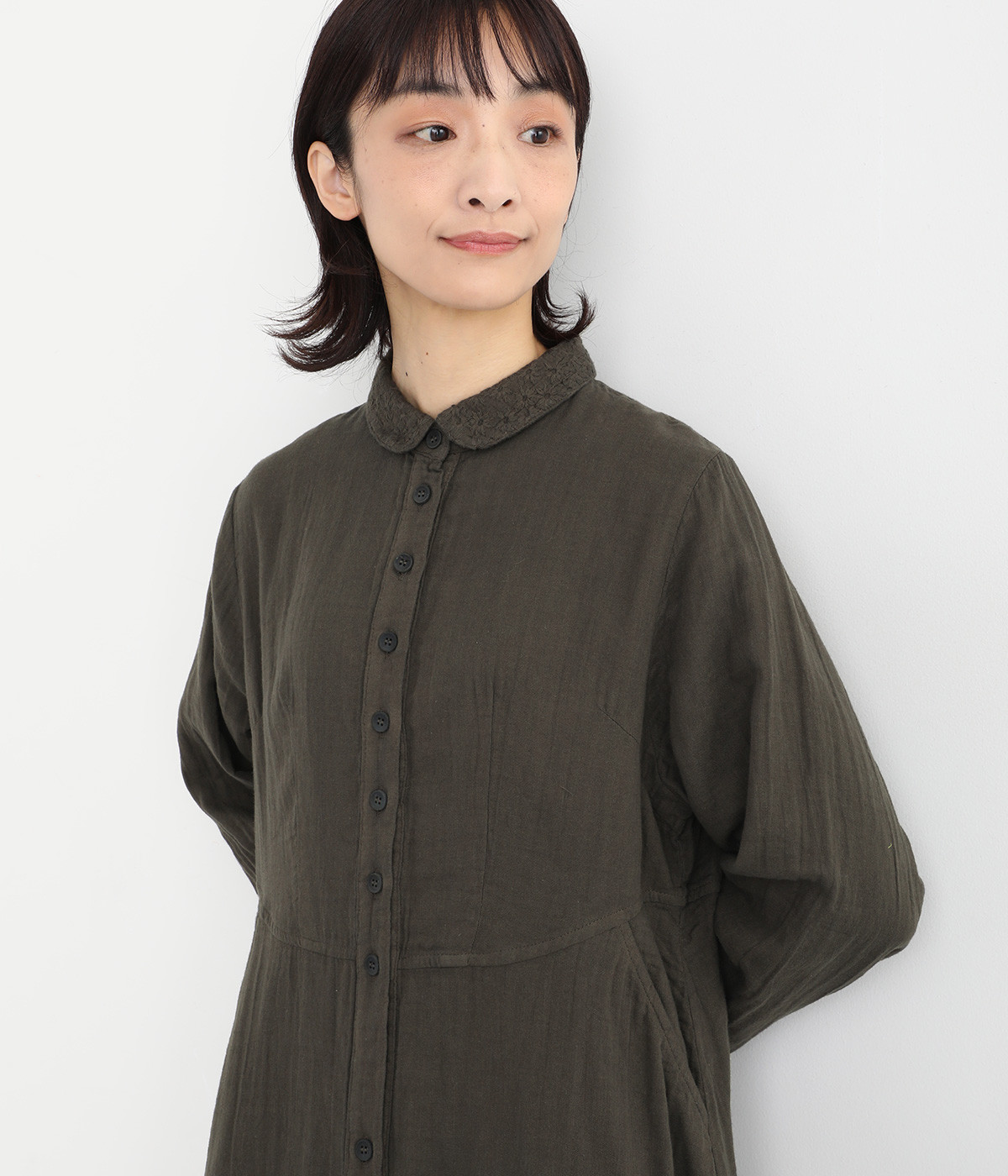 刺しゅうをあしらった生地を襟にポイント使いしたワンピースです。ウエストのカーブしたシルエットが特徴的で、すっきりとしたシルエットに仕上がっています。羽織りものとしても重宝する一枚です。