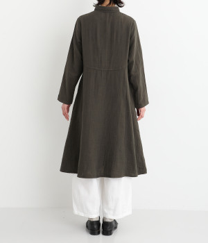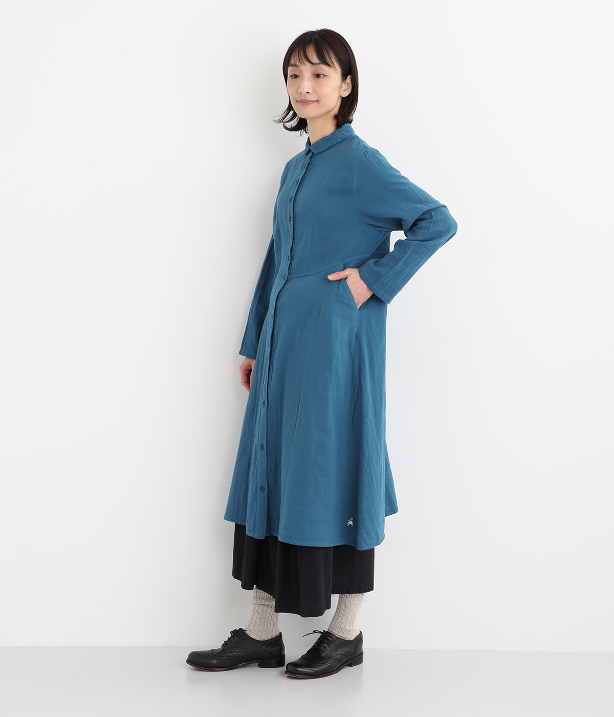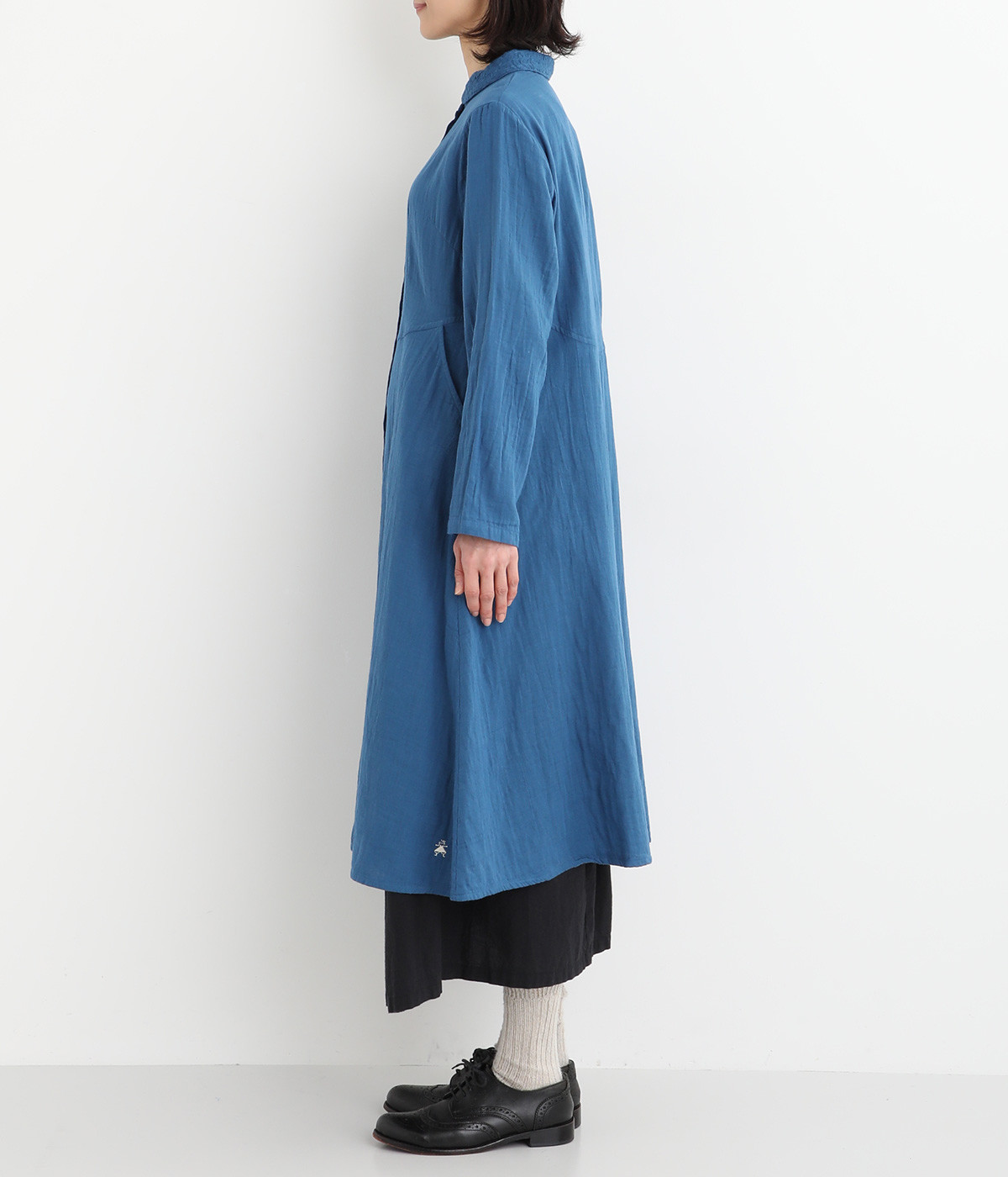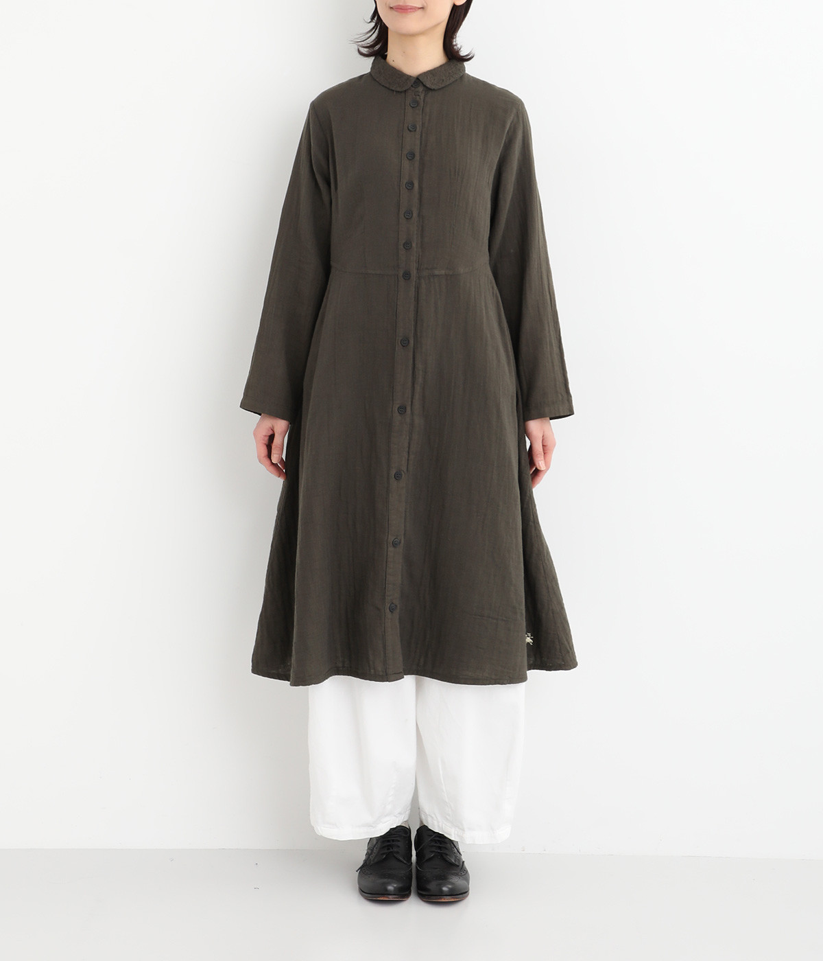 刺しゅうをあしらった生地を襟にポイント使いしたワンピースです。ウエストのカーブしたシルエットが特徴的で、すっきりとしたシルエットに仕上がっています。羽織りものとしても重宝する一枚です。