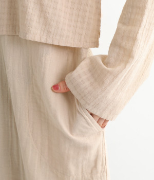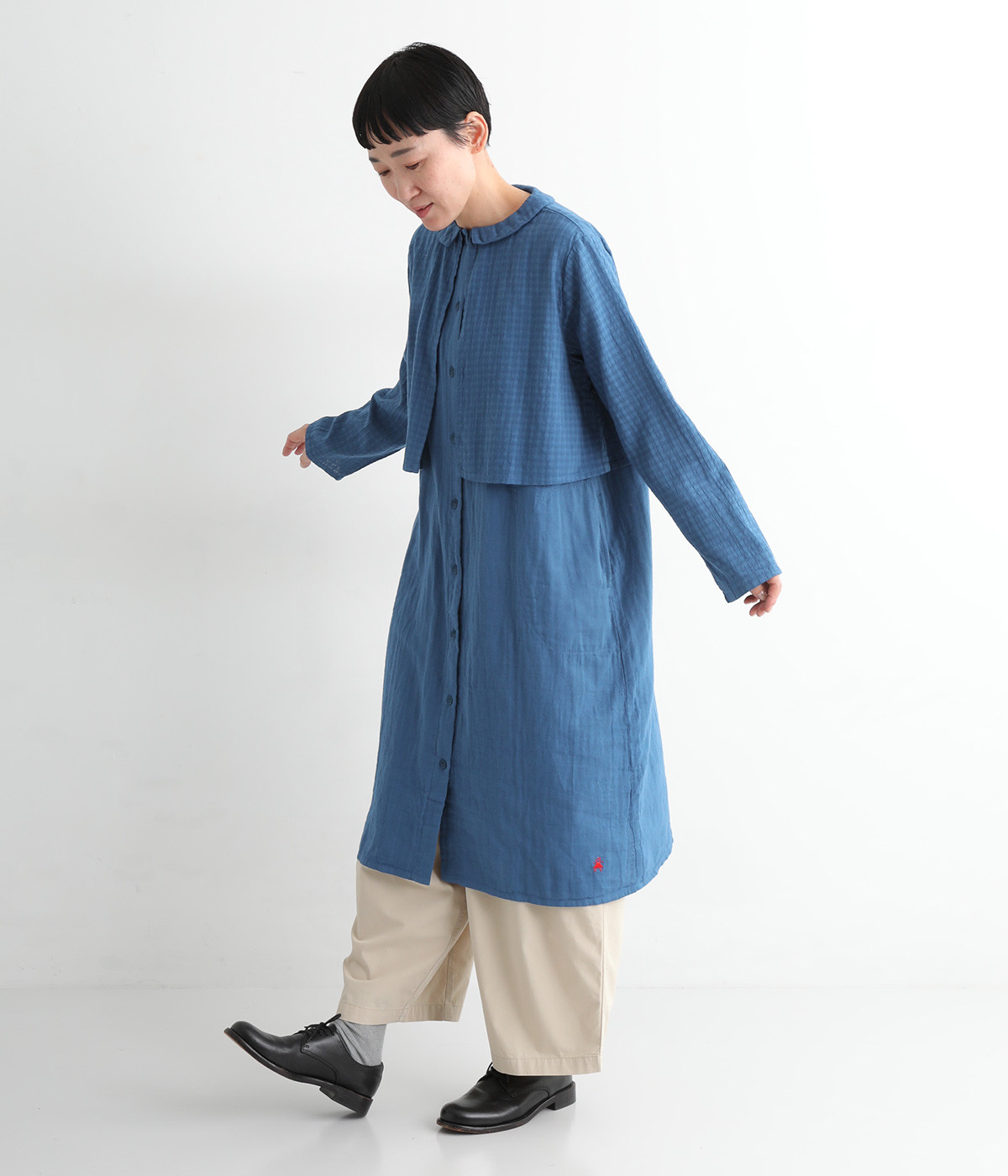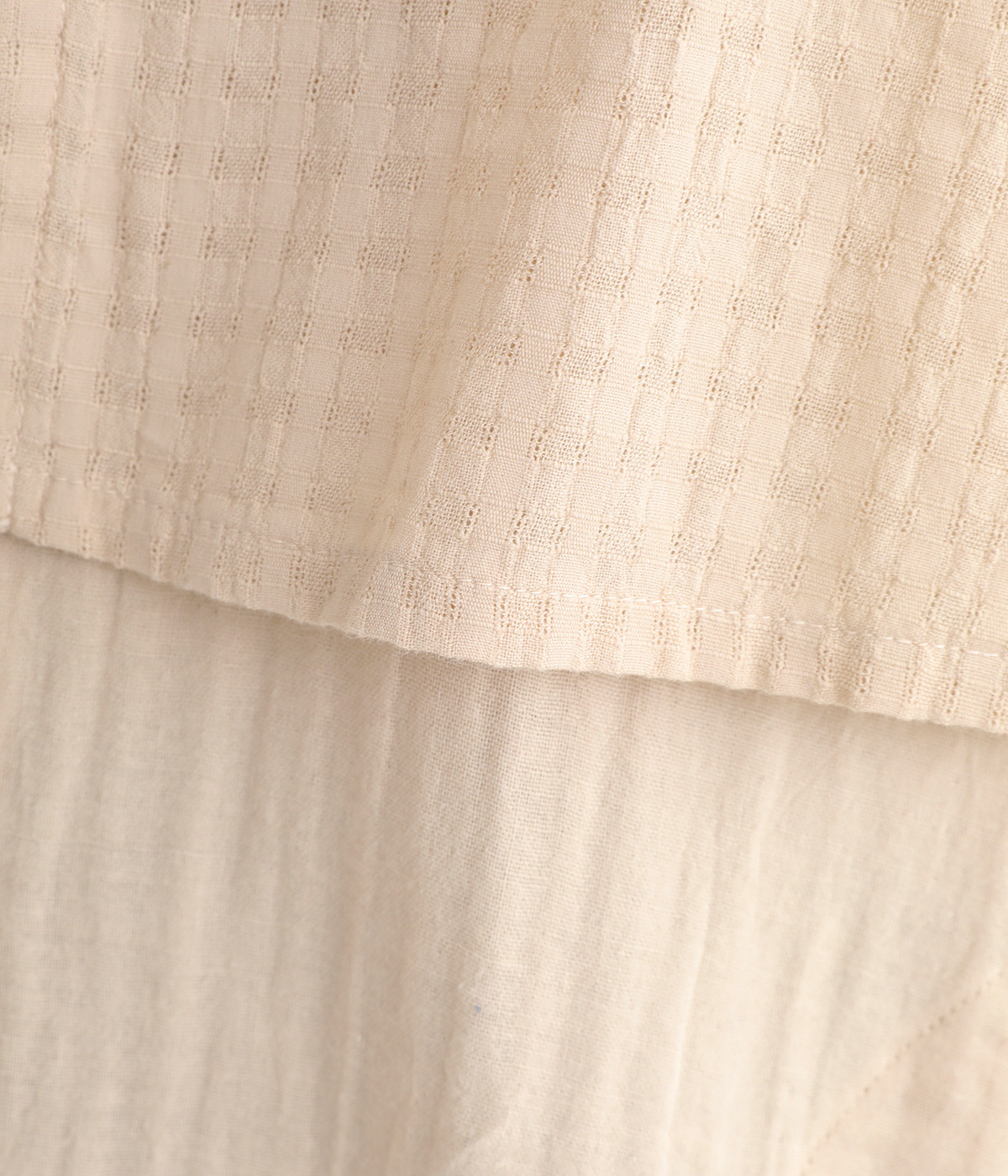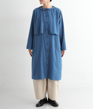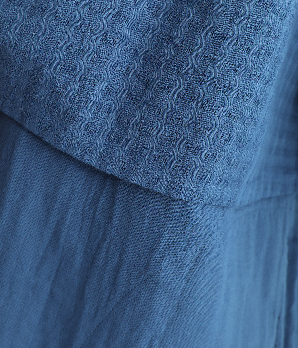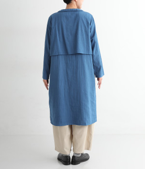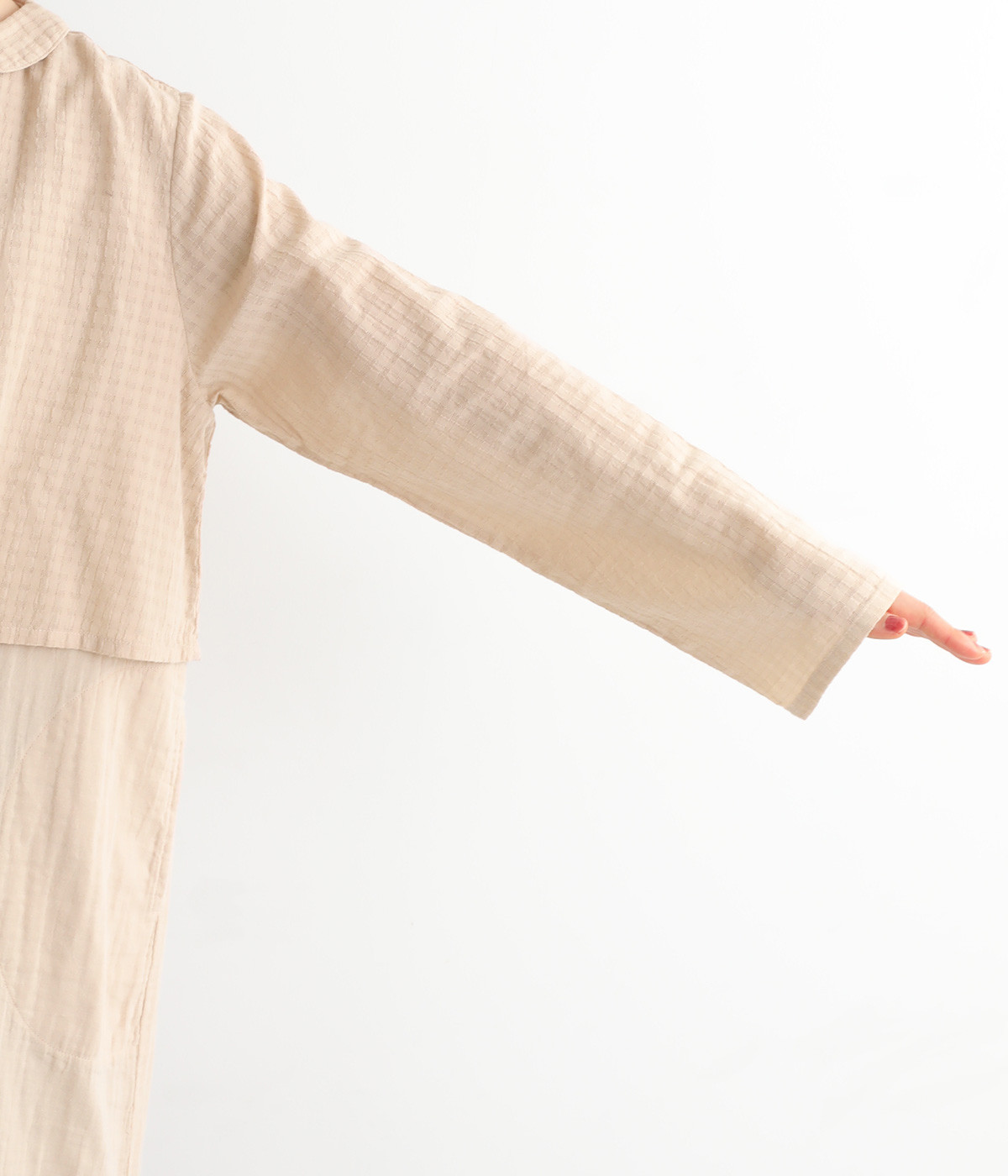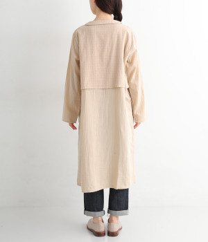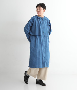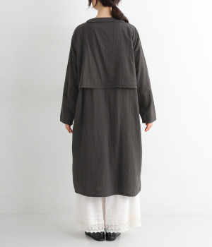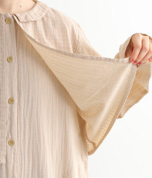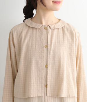 コットンダブルガーゼのやわらかな風合いが魅力。着続けるほどにさらに肌になじんでいきます。ボレロ部分には格子柄に織った表情のある生地を使用。