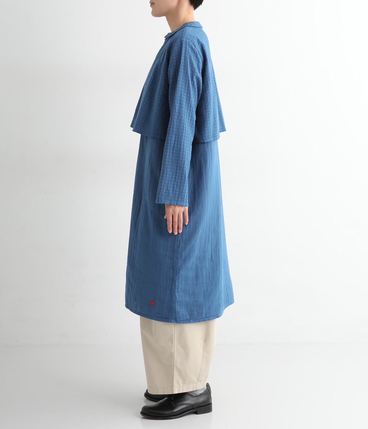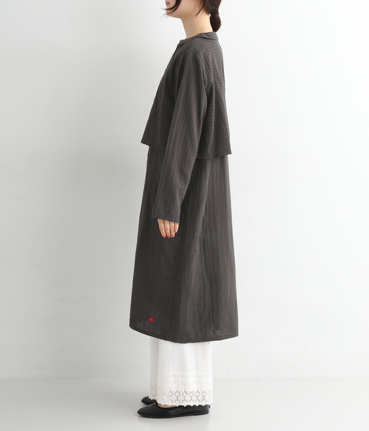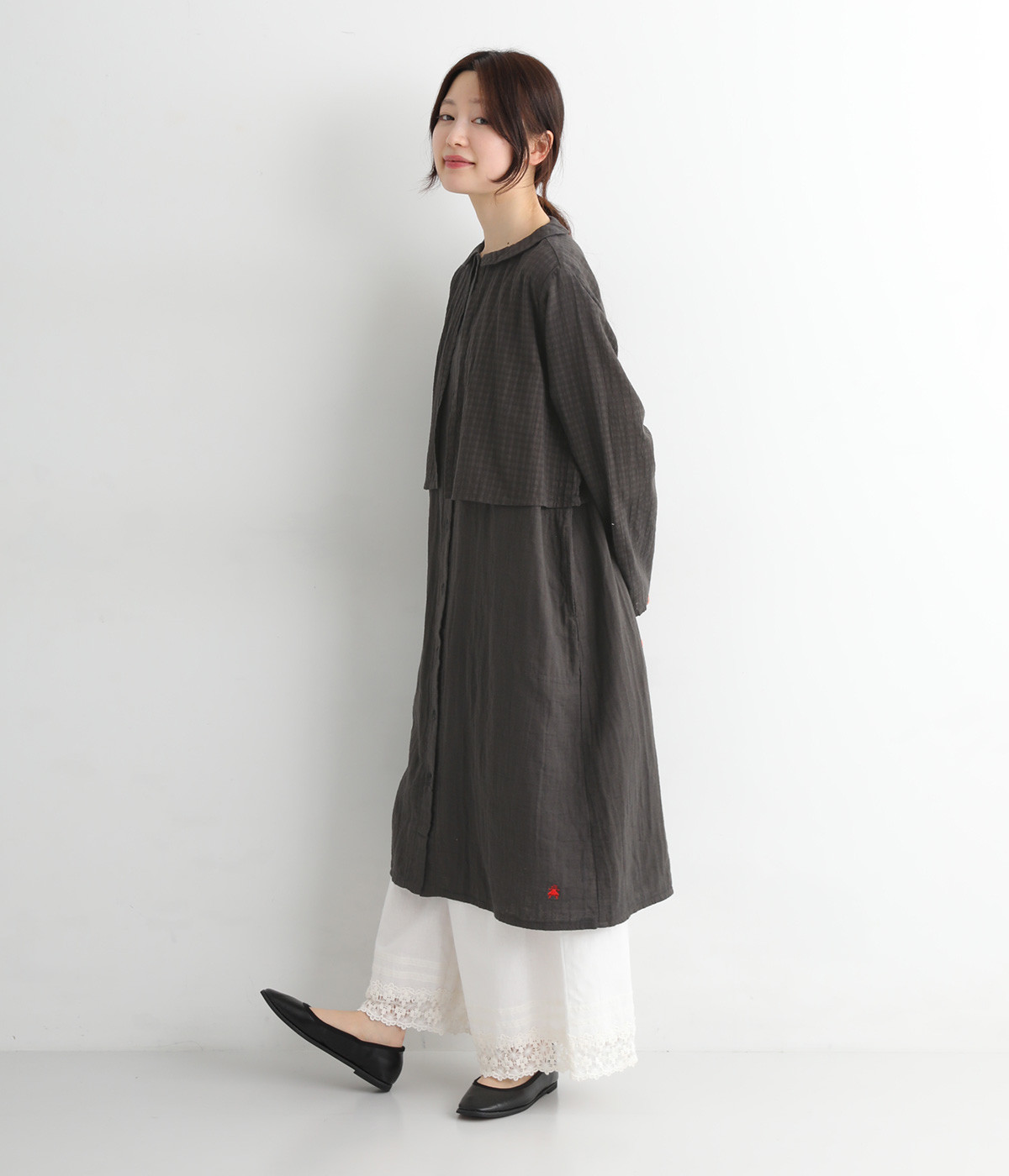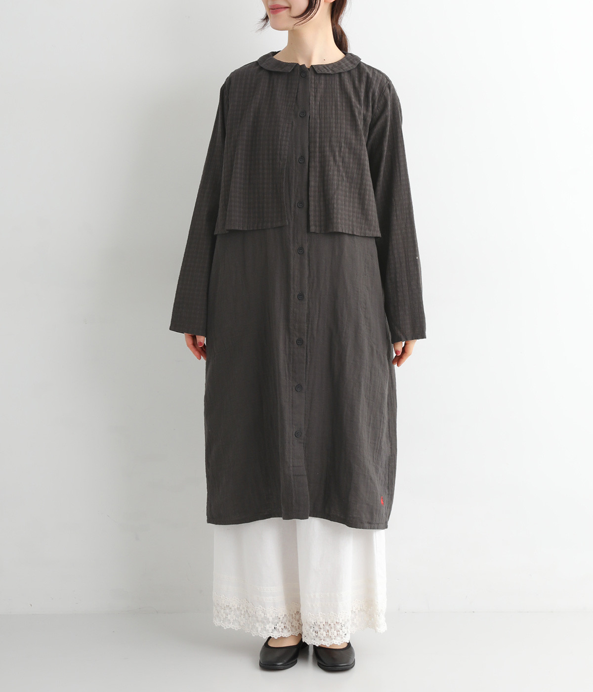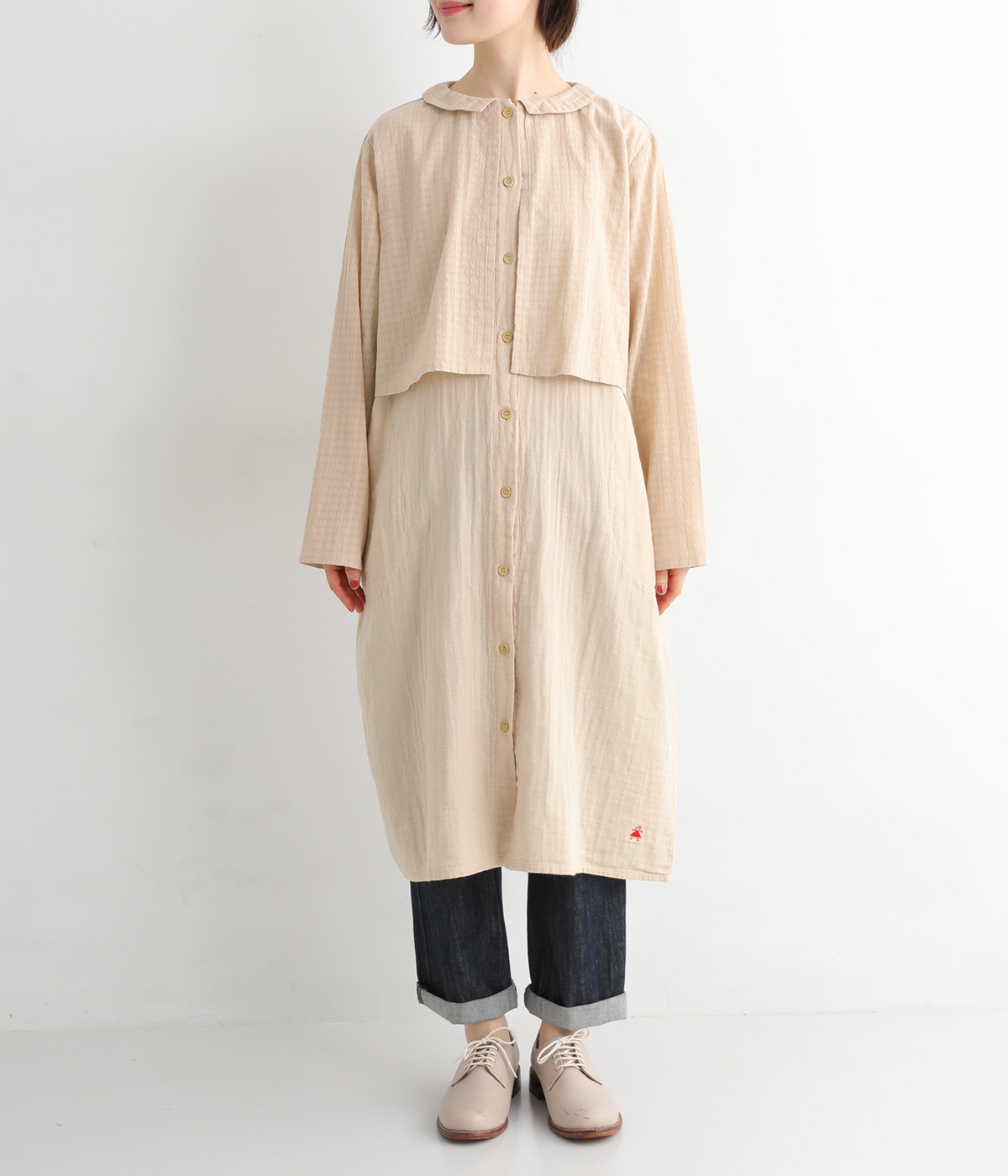 コットンダブルガーゼのやわらかな風合いが魅力。着続けるほどにさらに肌になじんでいきます。ボレロ部分には格子柄に織った表情のある生地を使用。