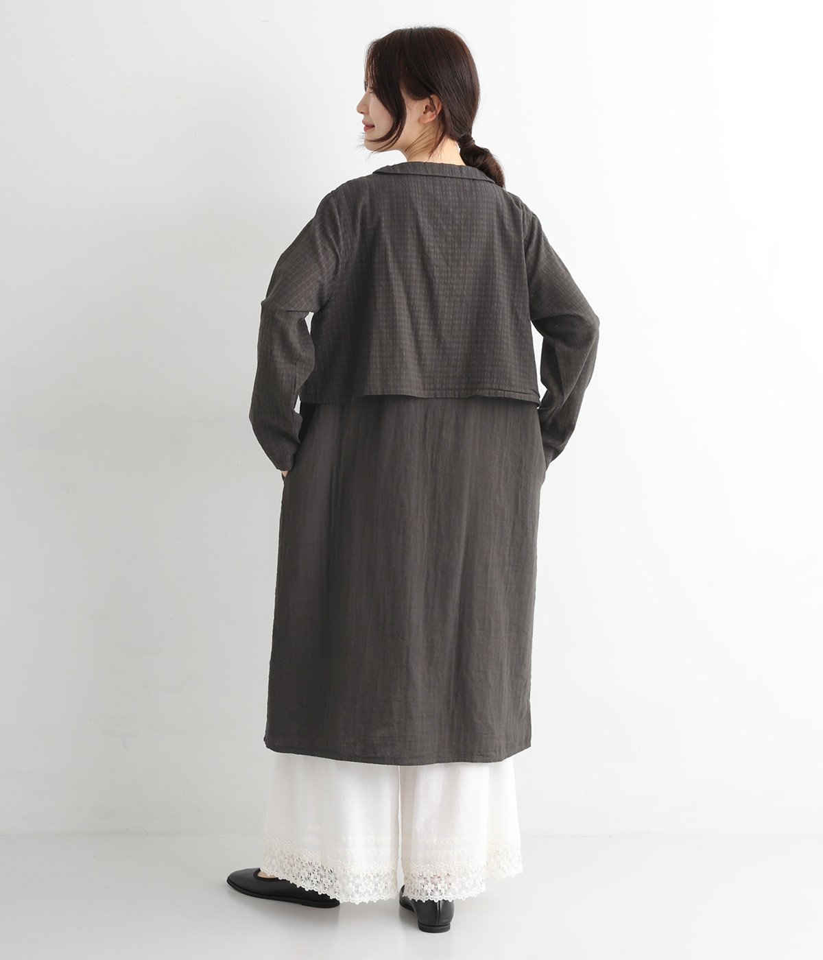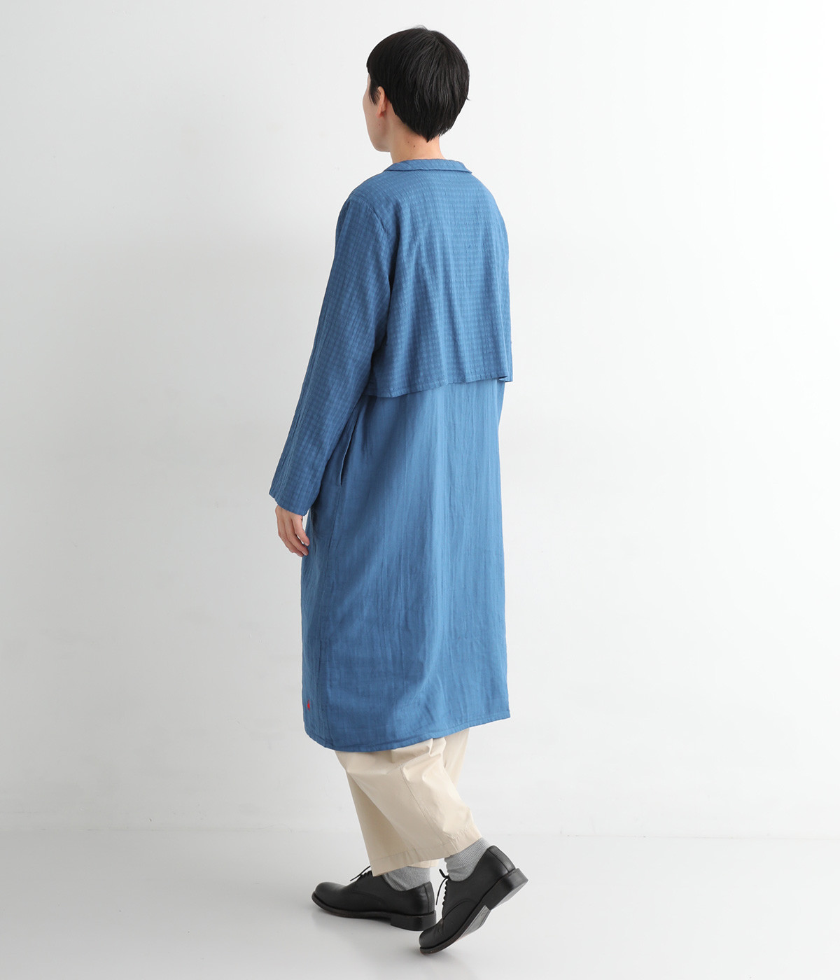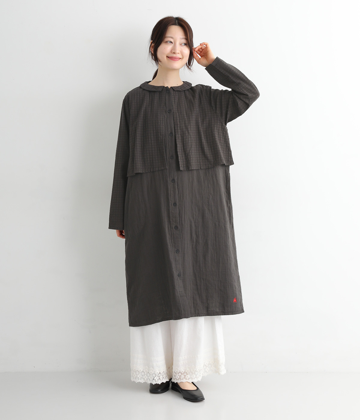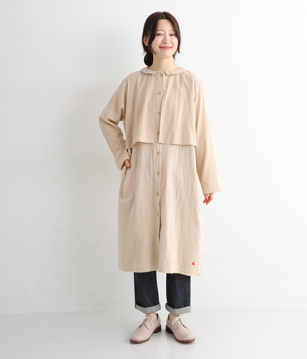 コットンダブルガーゼのやわらかな風合いが魅力。着続けるほどにさらに肌になじんでいきます。ボレロ部分には格子柄に織った表情のある生地を使用。