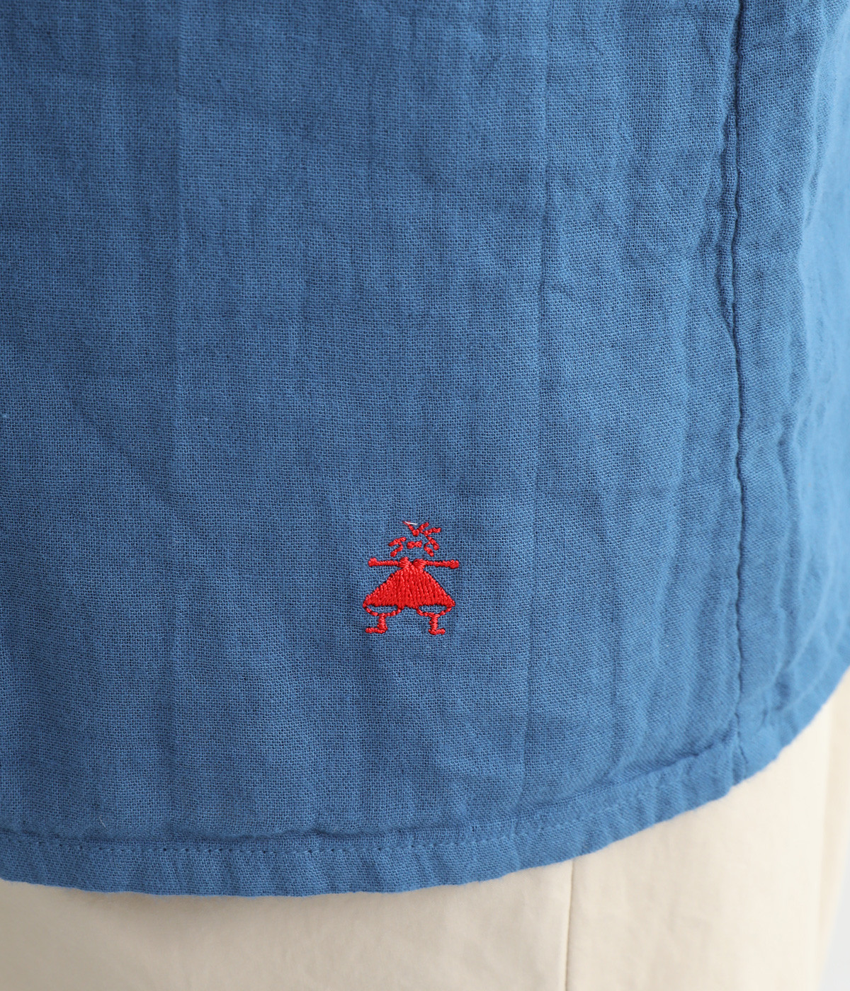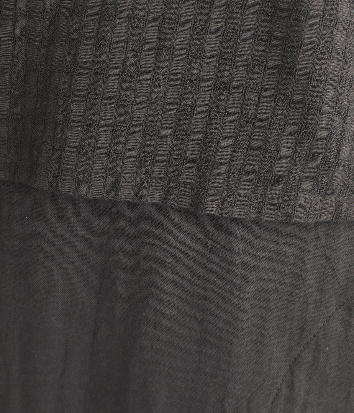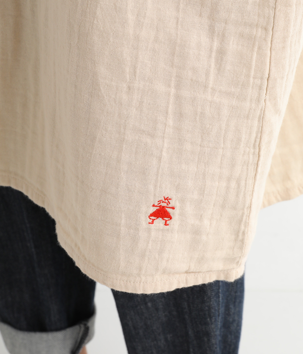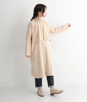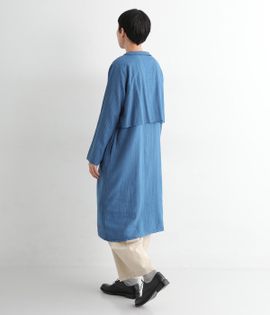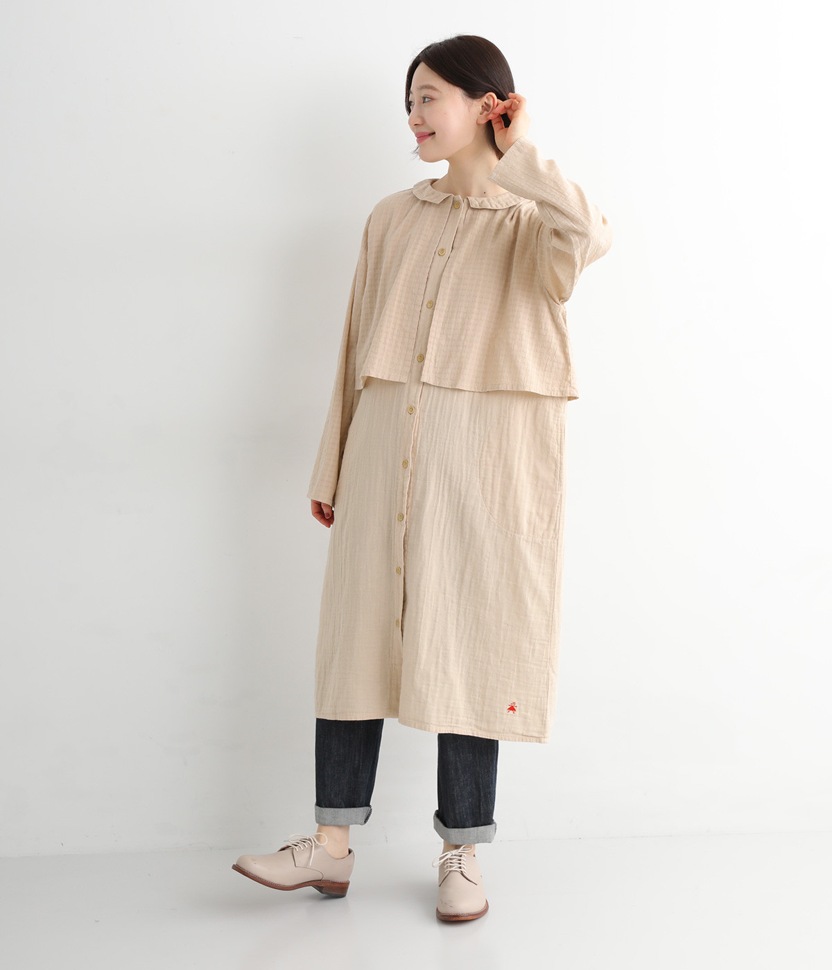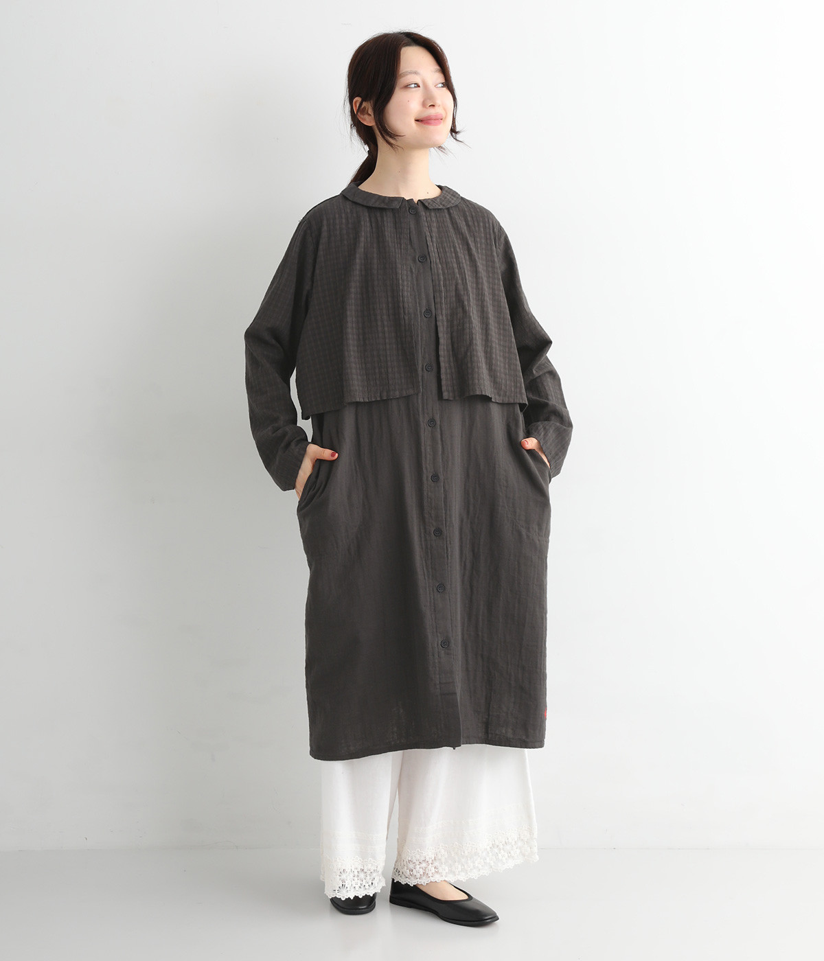 コットンダブルガーゼのやわらかな風合いが魅力。着続けるほどにさらに肌になじんでいきます。ボレロ部分には格子柄に織った表情のある生地を使用。