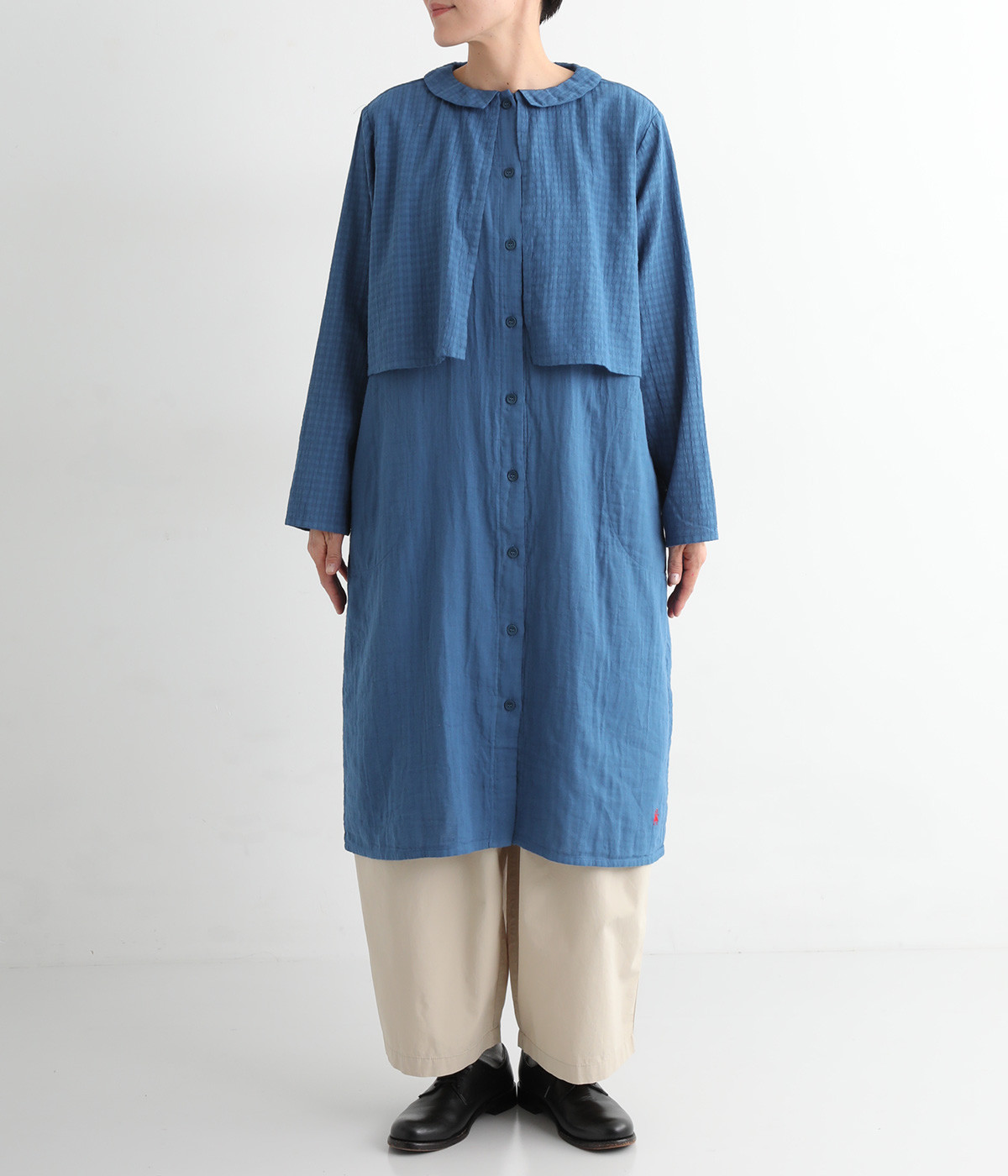 ボレロを重ねたようなデザインのチュニックワンピース。小さなフラットカラーがかわいらしい雰囲気です。裾の刺しゅうがさりげないワンポイントに。前開きタイプなのでボタンの開閉でも印象が変化します。ボレロ部分は取り外しできません。