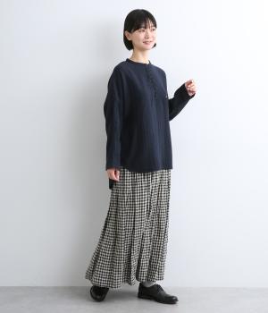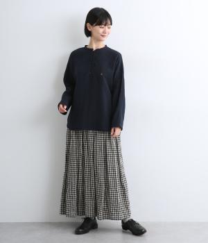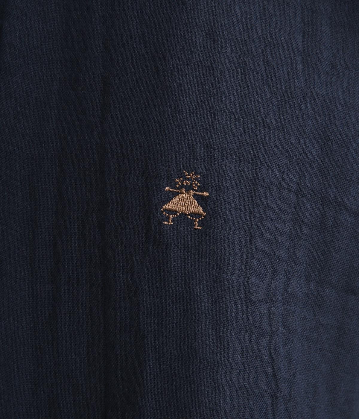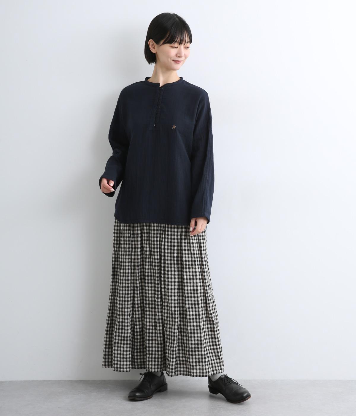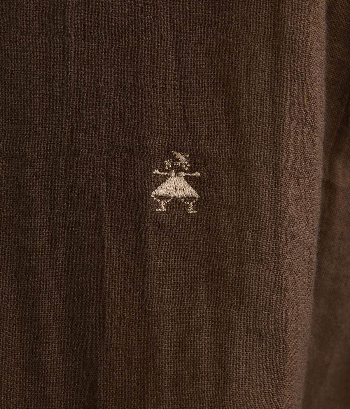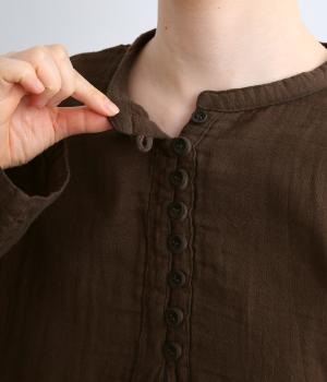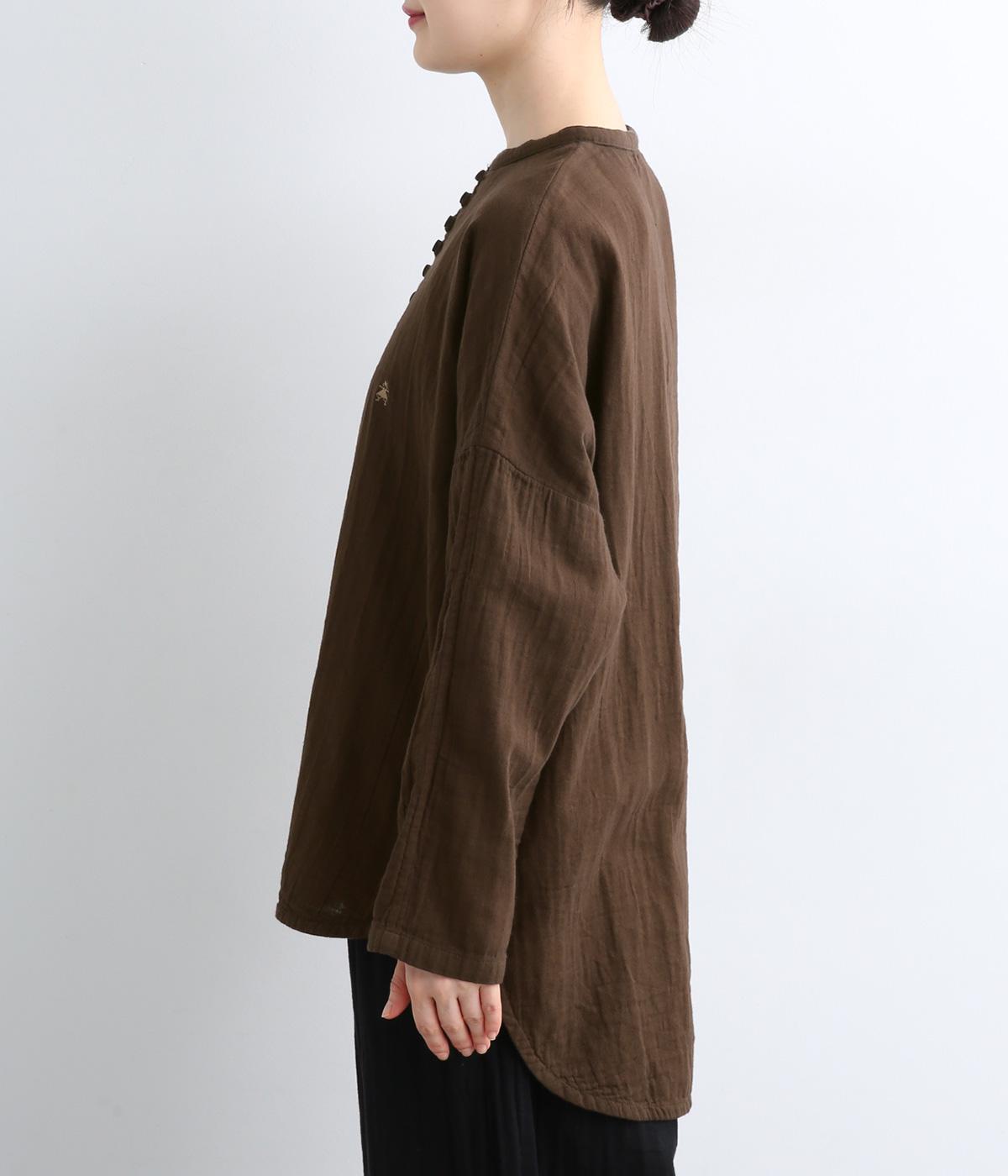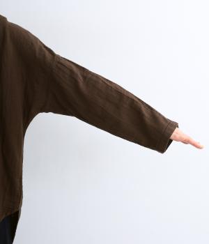 一見シンプルながらも、ループの多ボタンや胸元の刺しゅうで前身頃にデザイン性を持たせました。着丈に大きく前後差をつけているのでラフな着こなしもさまになり、ラウンドヘムがやさしい雰囲気を醸します。