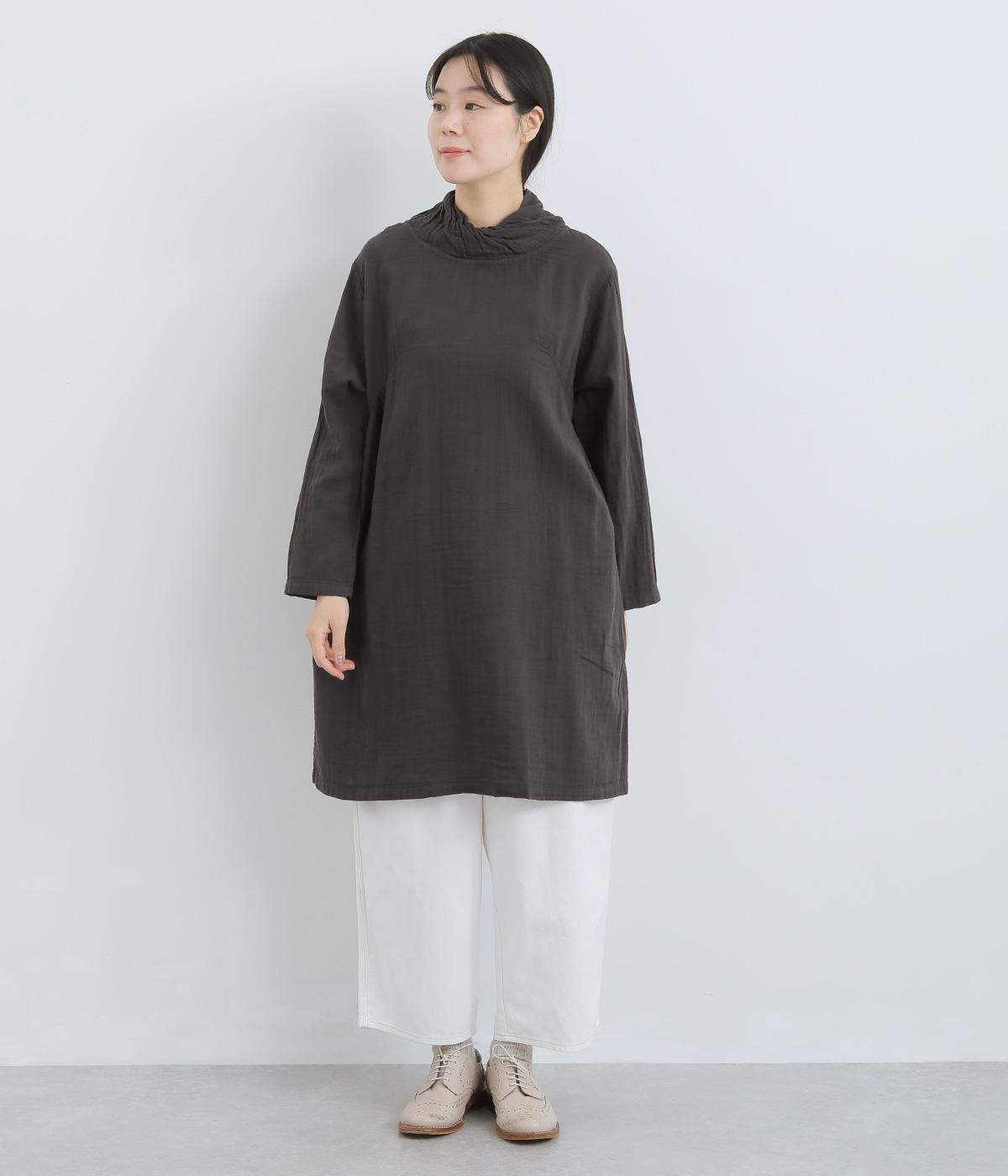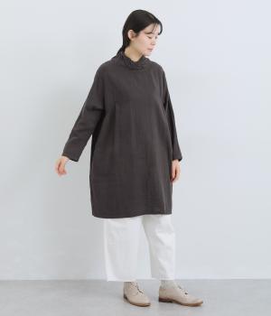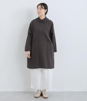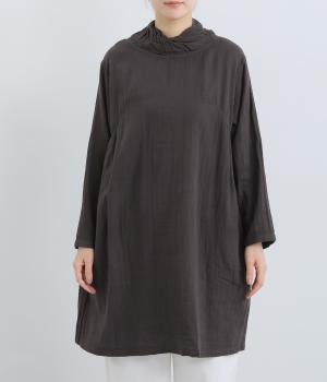 脇から胸にかけてギャザーをほどこし、さり気なくゆったりと分量を持たせたプルオーバーチュニック。ねじりスタンドネックで顔まわりにニュアンスをプラス。ポケット口の刺しゅうが可愛らしいポイントになっています。