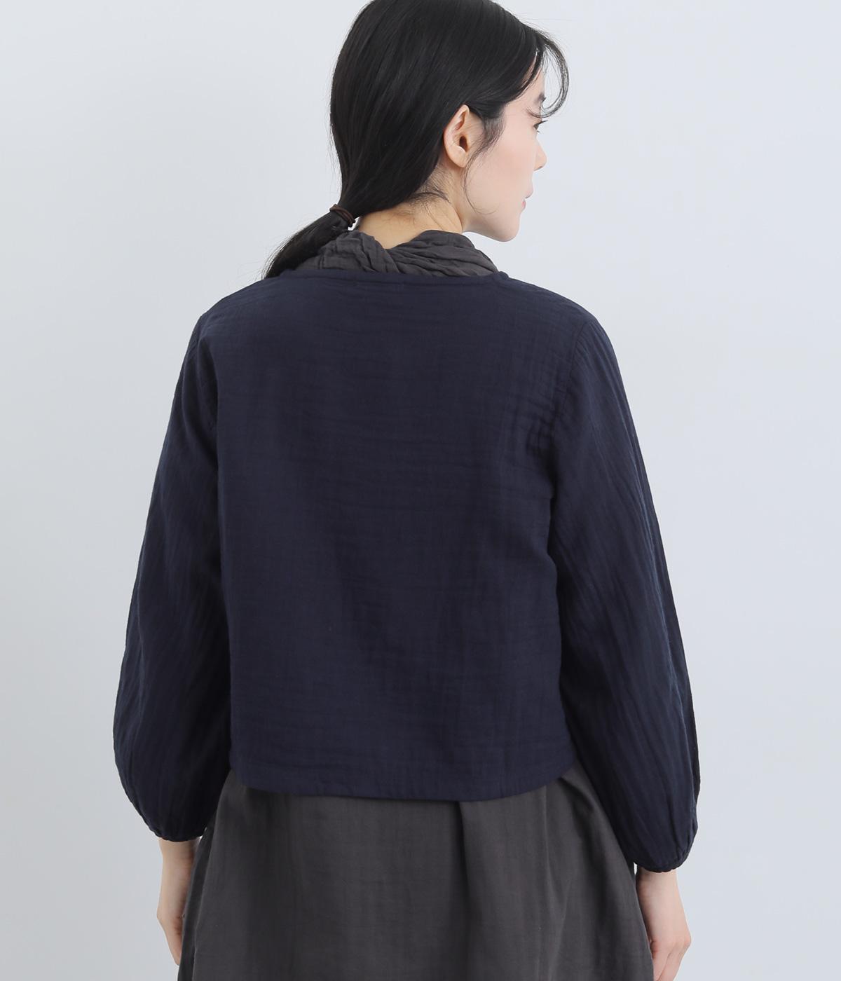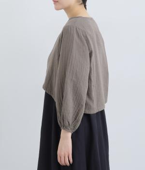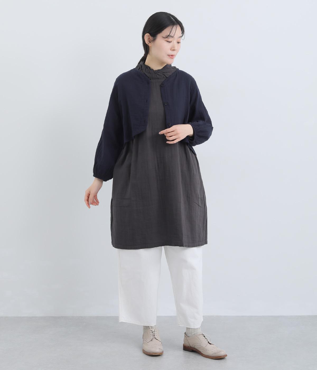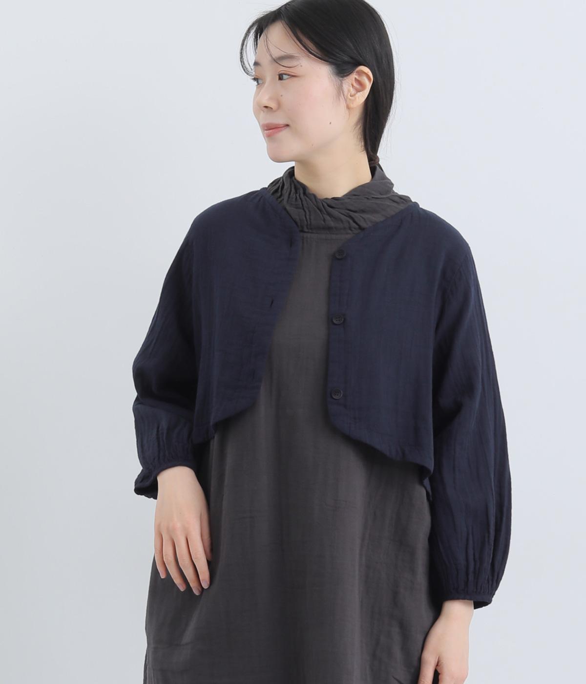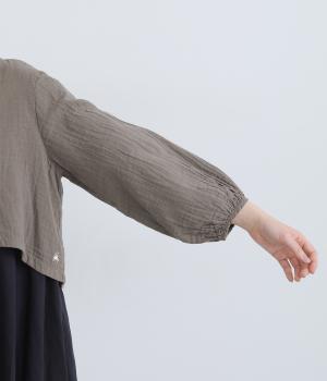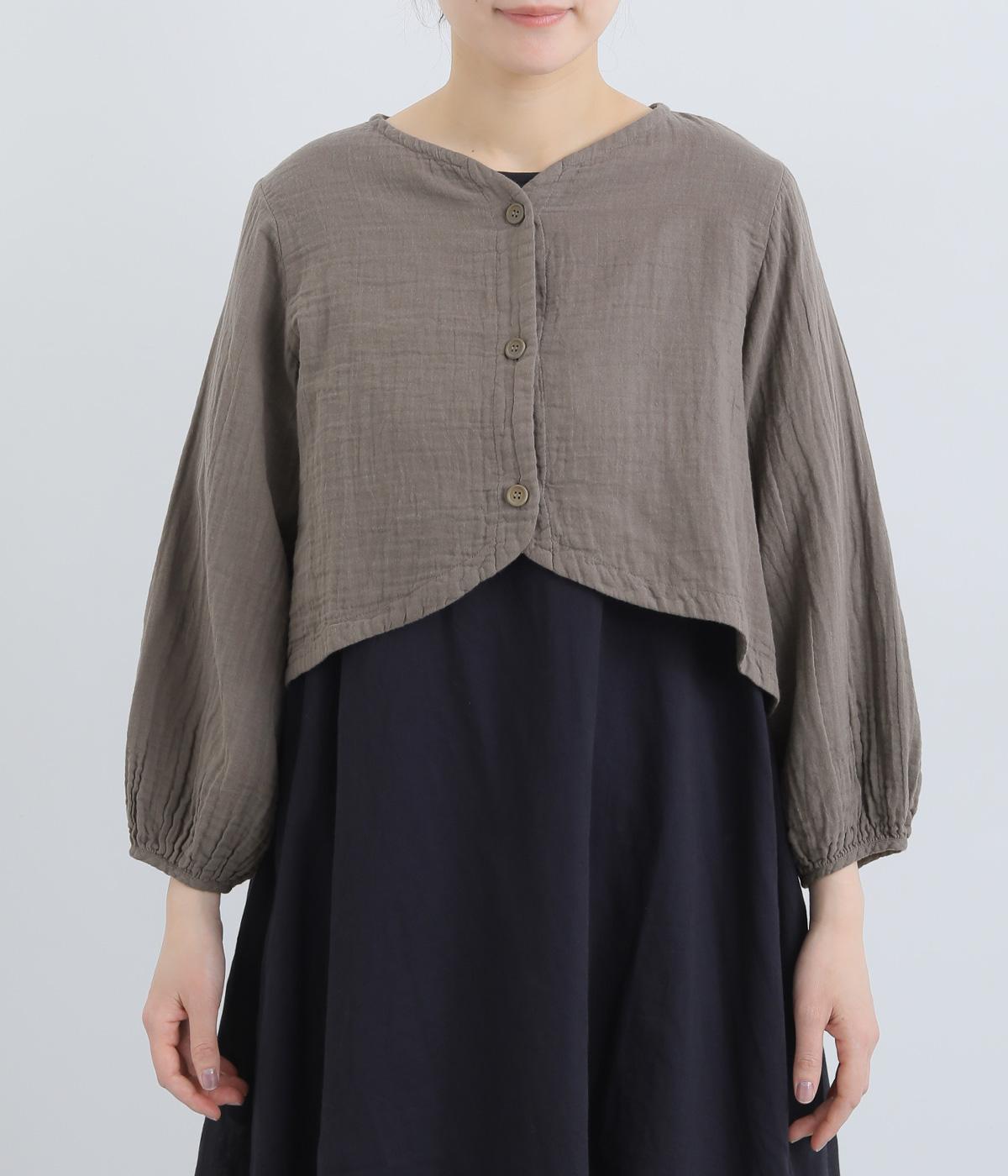 襟ぐりから前立て、裾とやわらかくつなげたショート丈ブラウス。羽織りにしたりと着まわし力が高く、ガーゼ特有のやさしい雰囲気がジャケットにはない魅力です。手首がすっきり見える袖丈でバランスも◎。