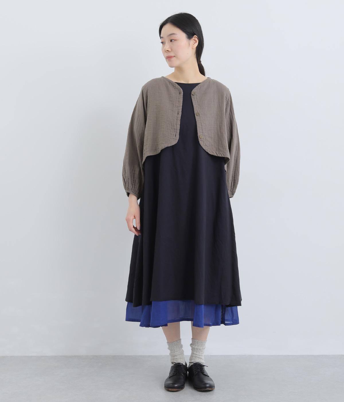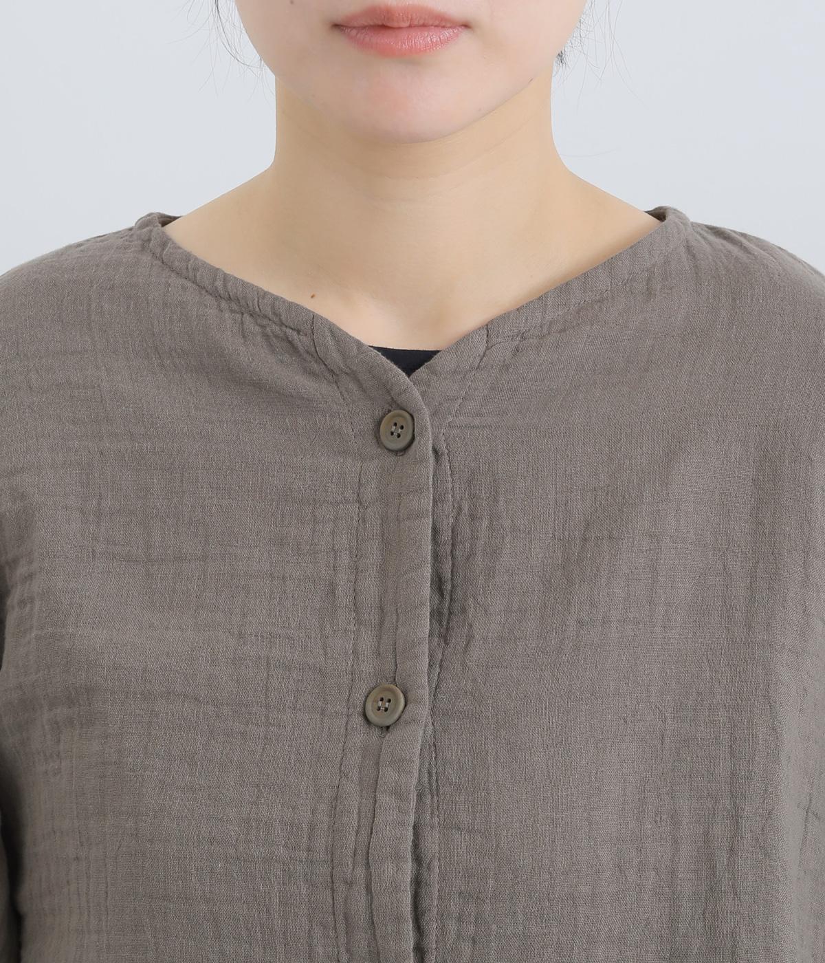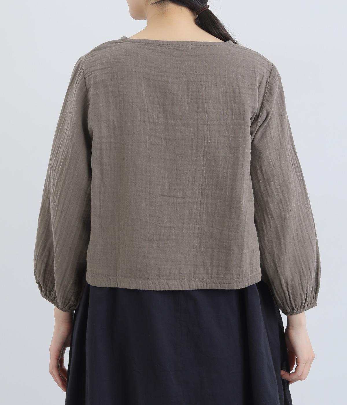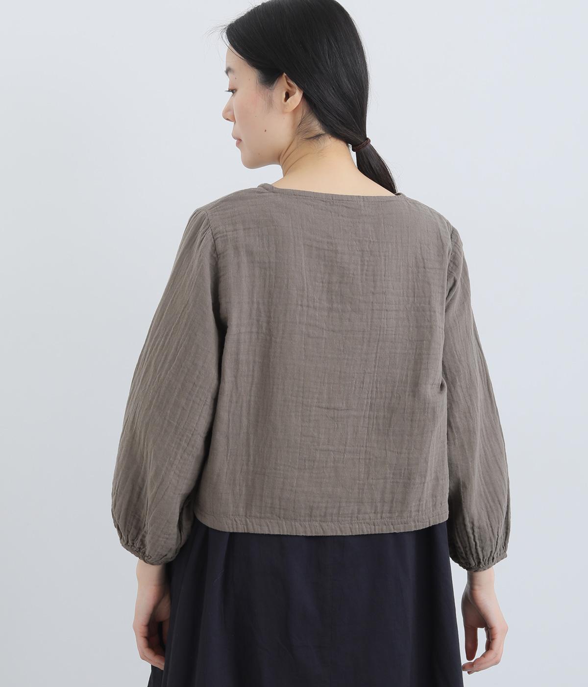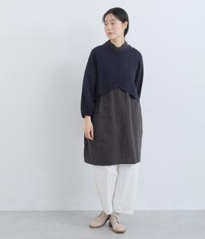 襟ぐりから前立て、裾とやわらかくつなげたショート丈ブラウス。羽織りにしたりと着まわし力が高く、ガーゼ特有のやさしい雰囲気がジャケットにはない魅力です。手首がすっきり見える袖丈でバランスも◎。