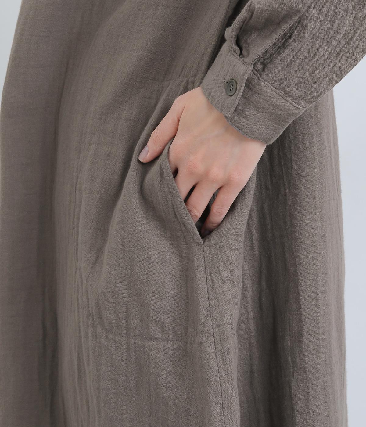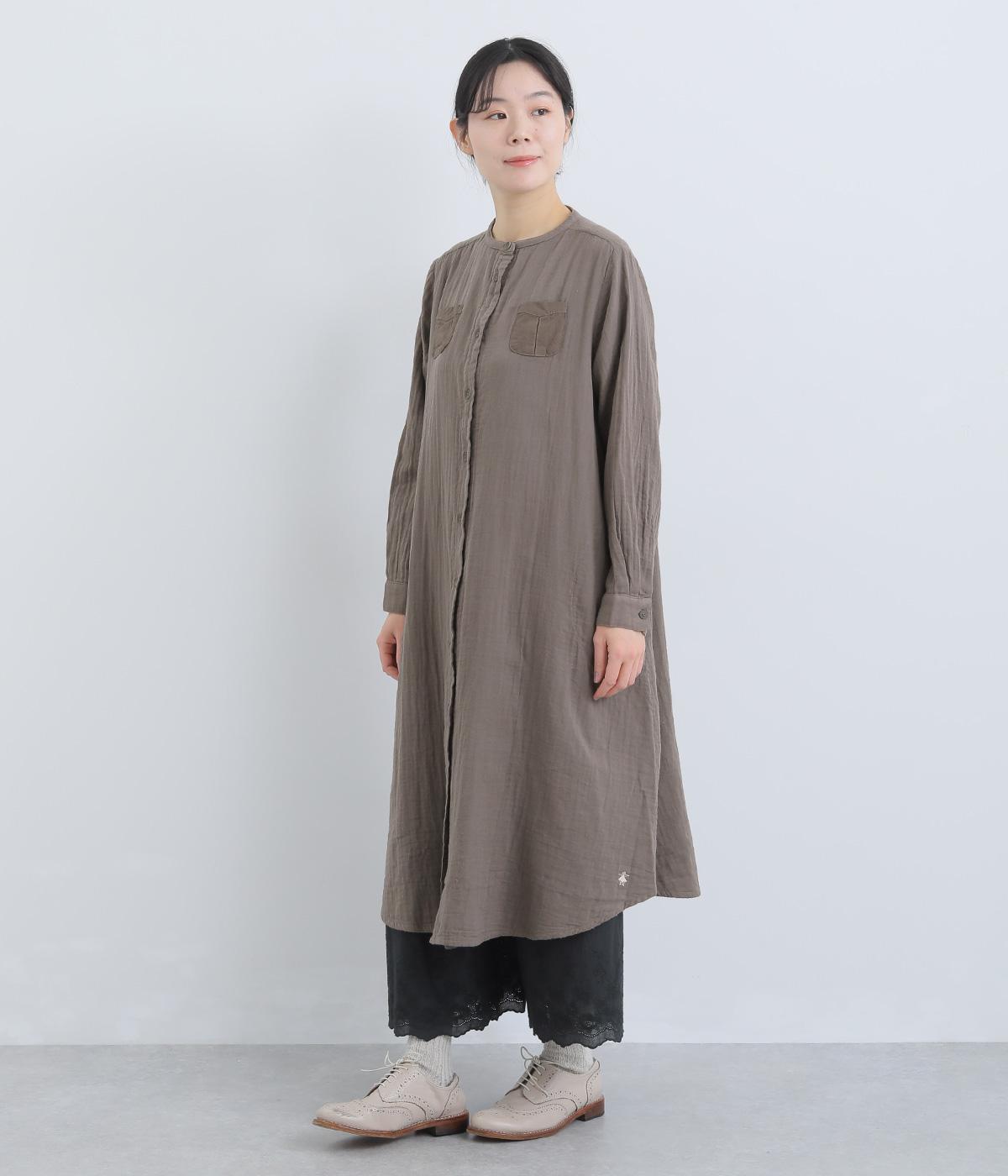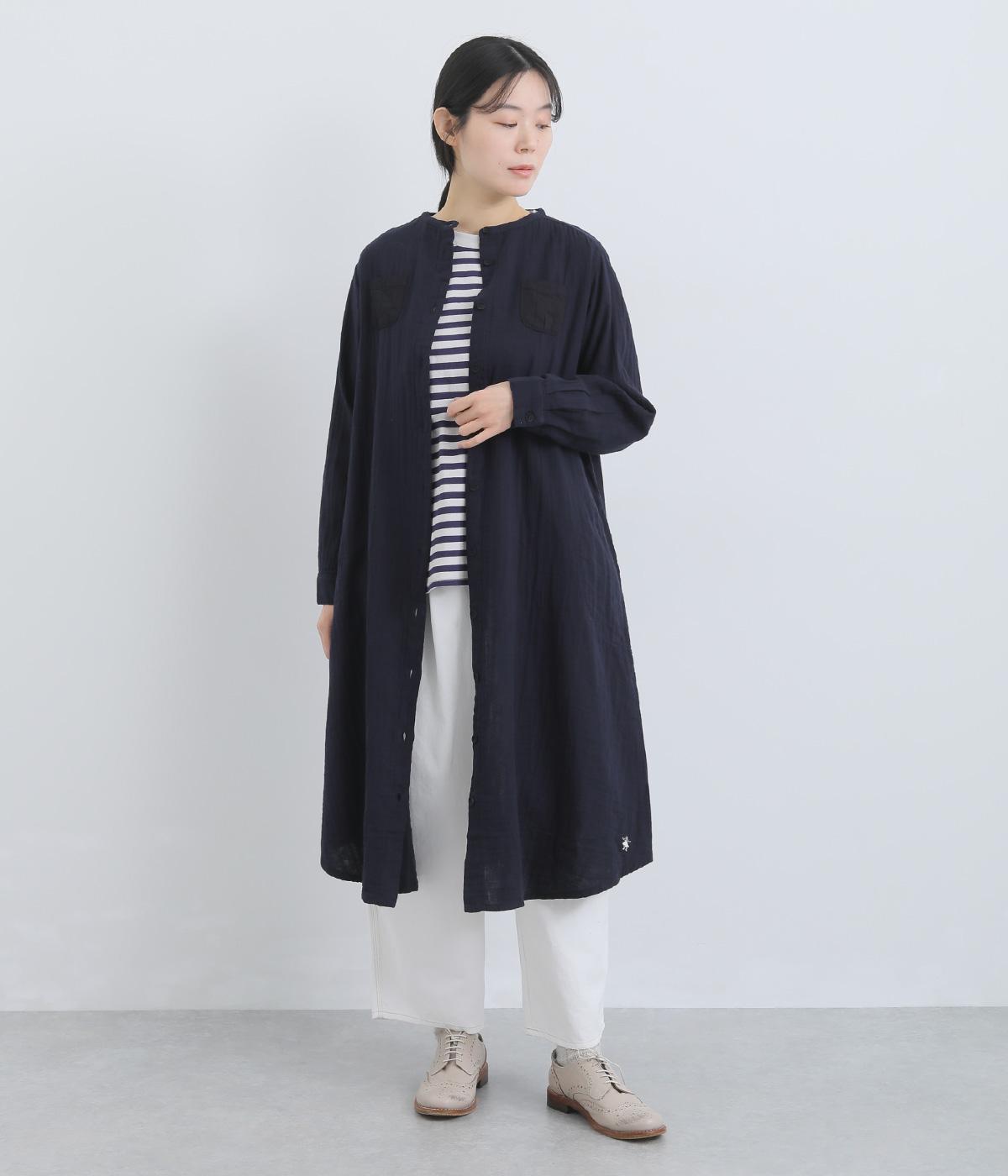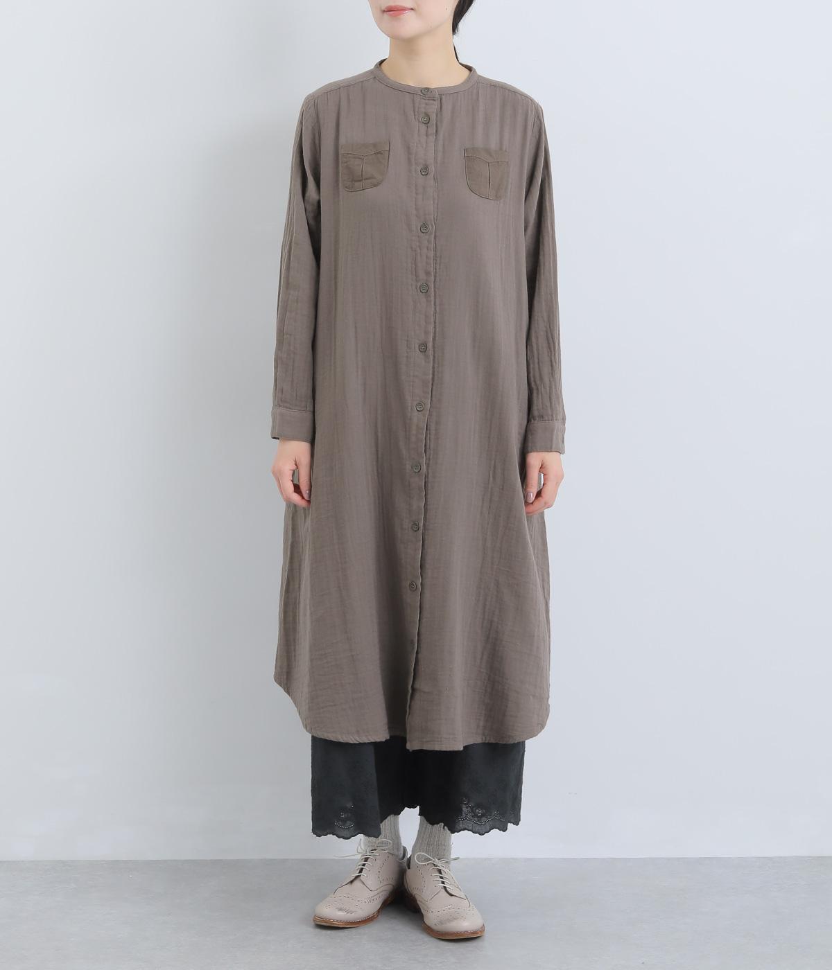 ガーゼならではのやわらかな空気感を活かしてシンプルに仕立てたシャツワンピース。ちょこんとついた胸ポケットは別生地を配してアクセントにしています。一枚着はもちろん、ボトムとレイヤードしたり、前あきで羽織ったりと着まわし力も抜群。