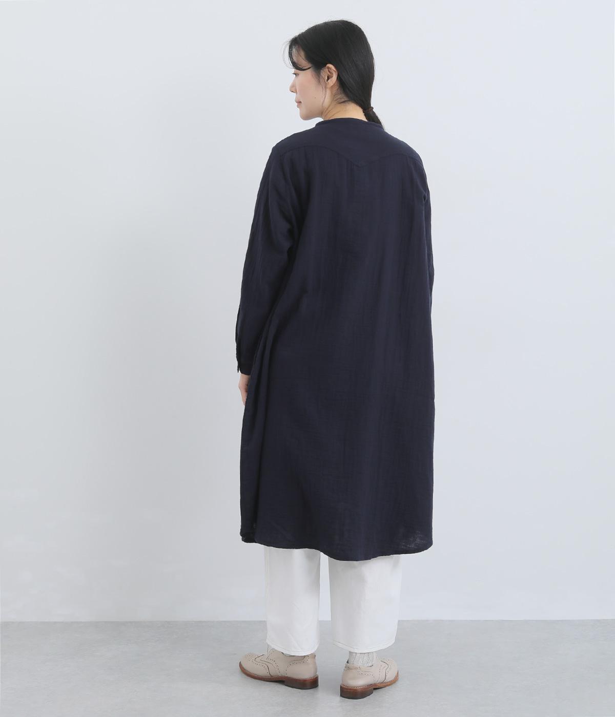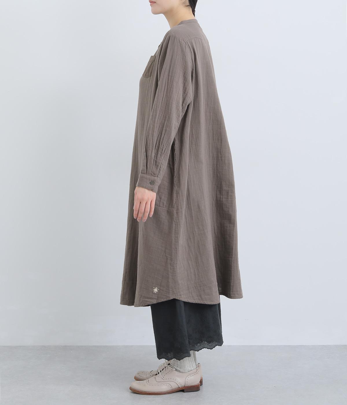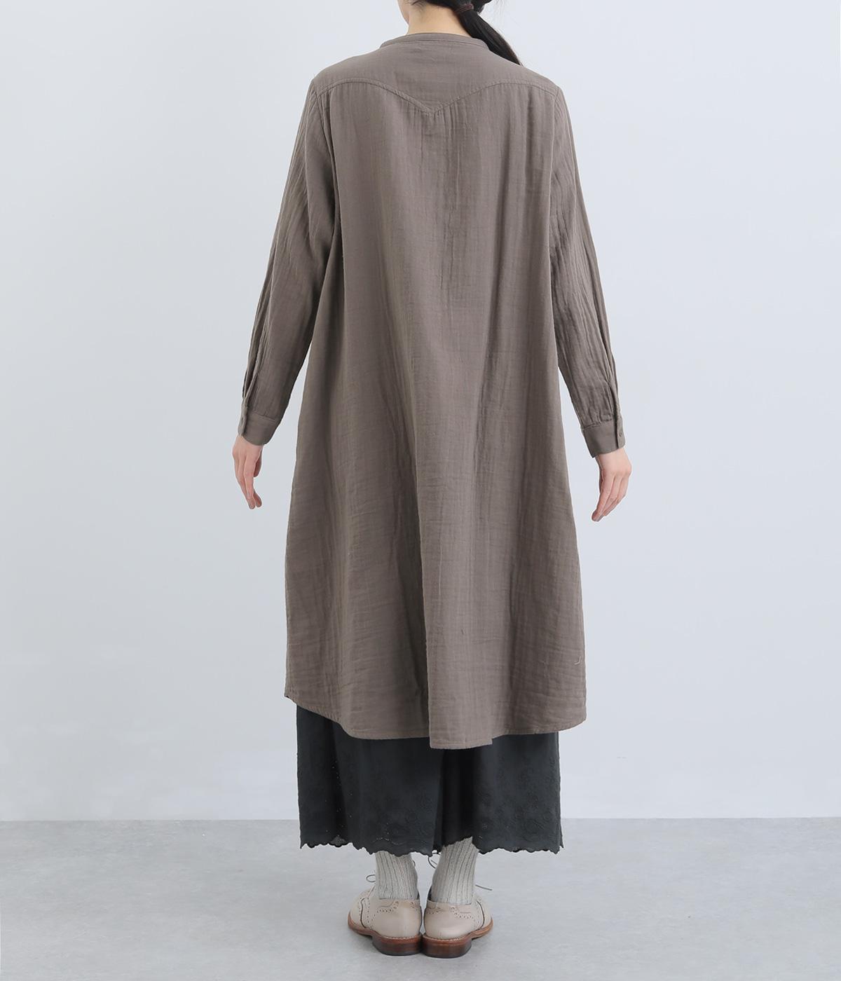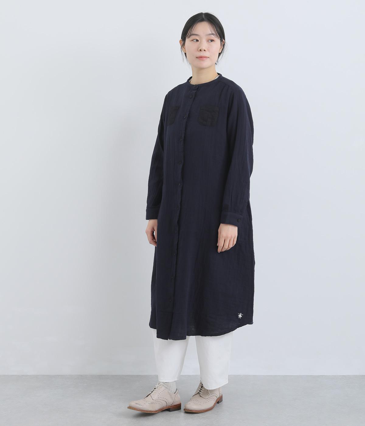 ガーゼならではのやわらかな空気感を活かしてシンプルに仕立てたシャツワンピース。ちょこんとついた胸ポケットは別生地を配してアクセントにしています。一枚着はもちろん、ボトムとレイヤードしたり、前あきで羽織ったりと着まわし力も抜群。