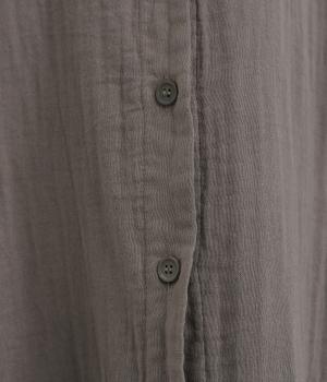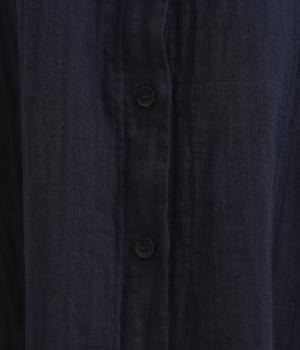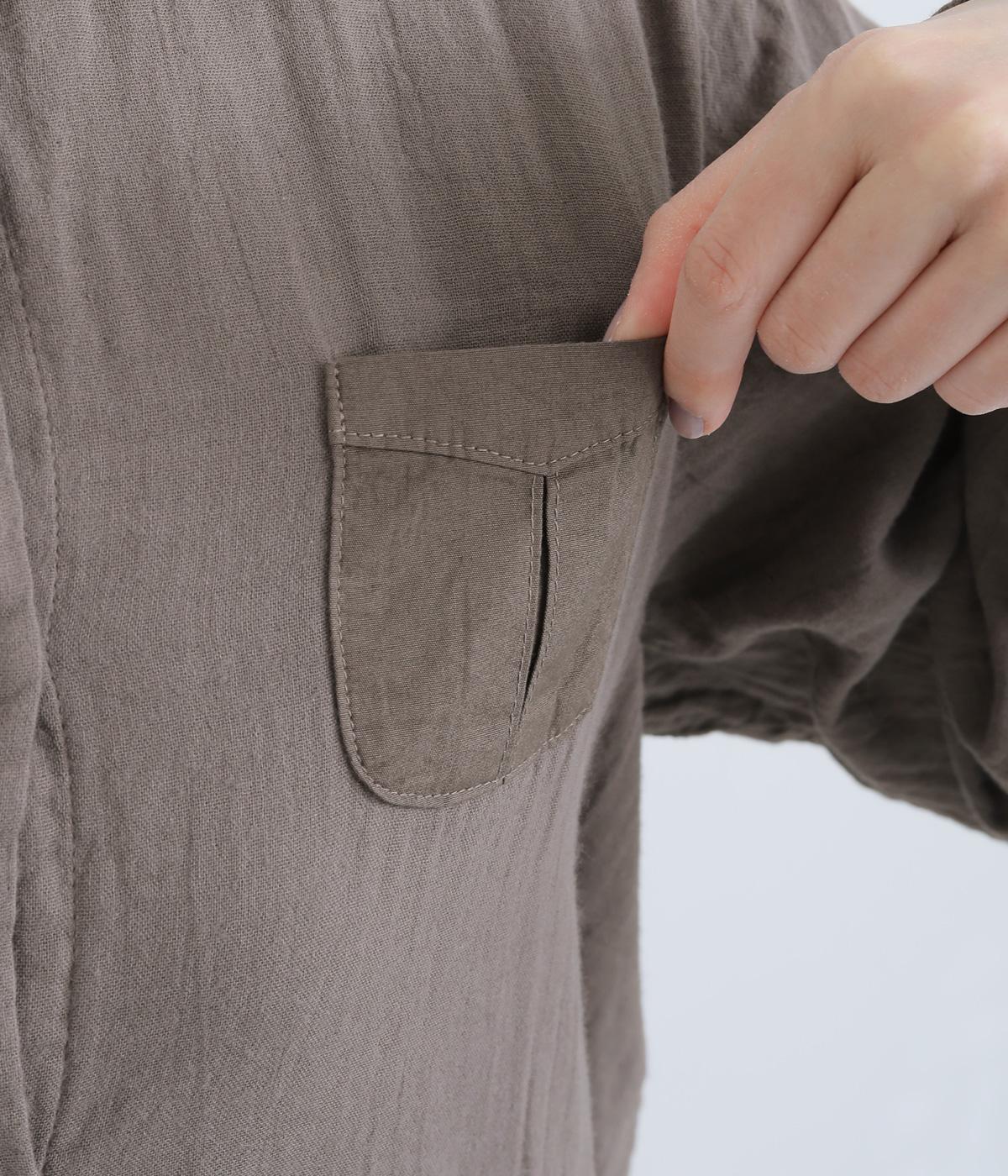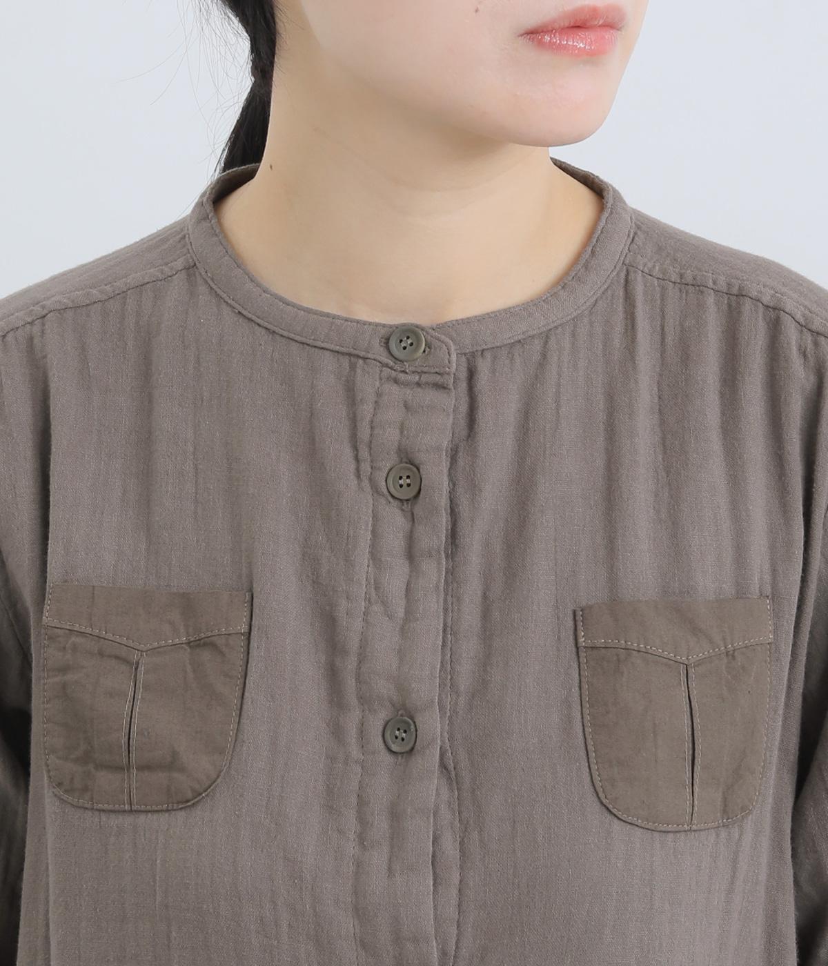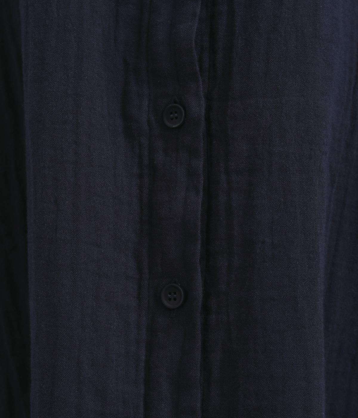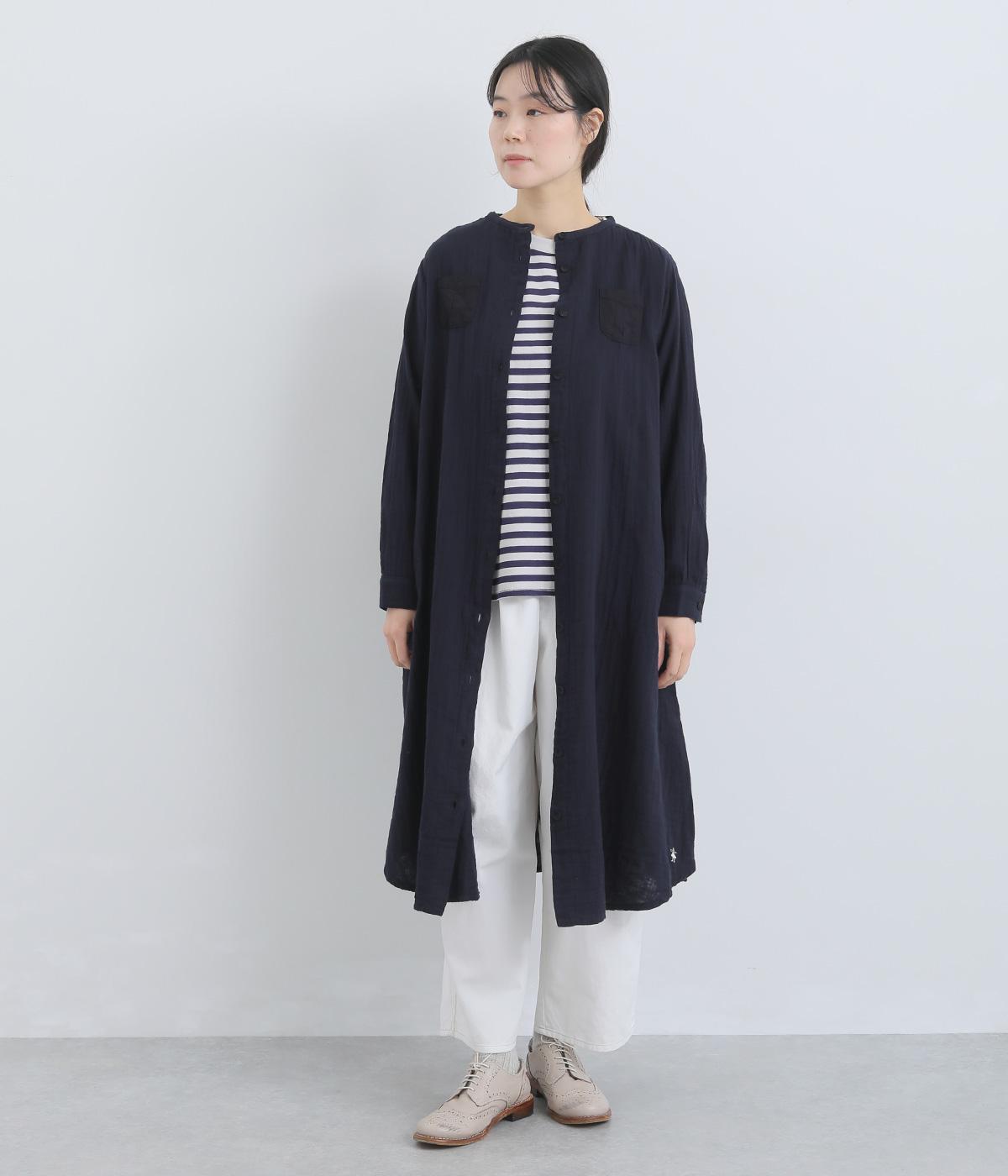 ガーゼならではのやわらかな空気感を活かしてシンプルに仕立てたシャツワンピース。ちょこんとついた胸ポケットは別生地を配してアクセントにしています。一枚着はもちろん、ボトムとレイヤードしたり、前あきで羽織ったりと着まわし力も抜群。