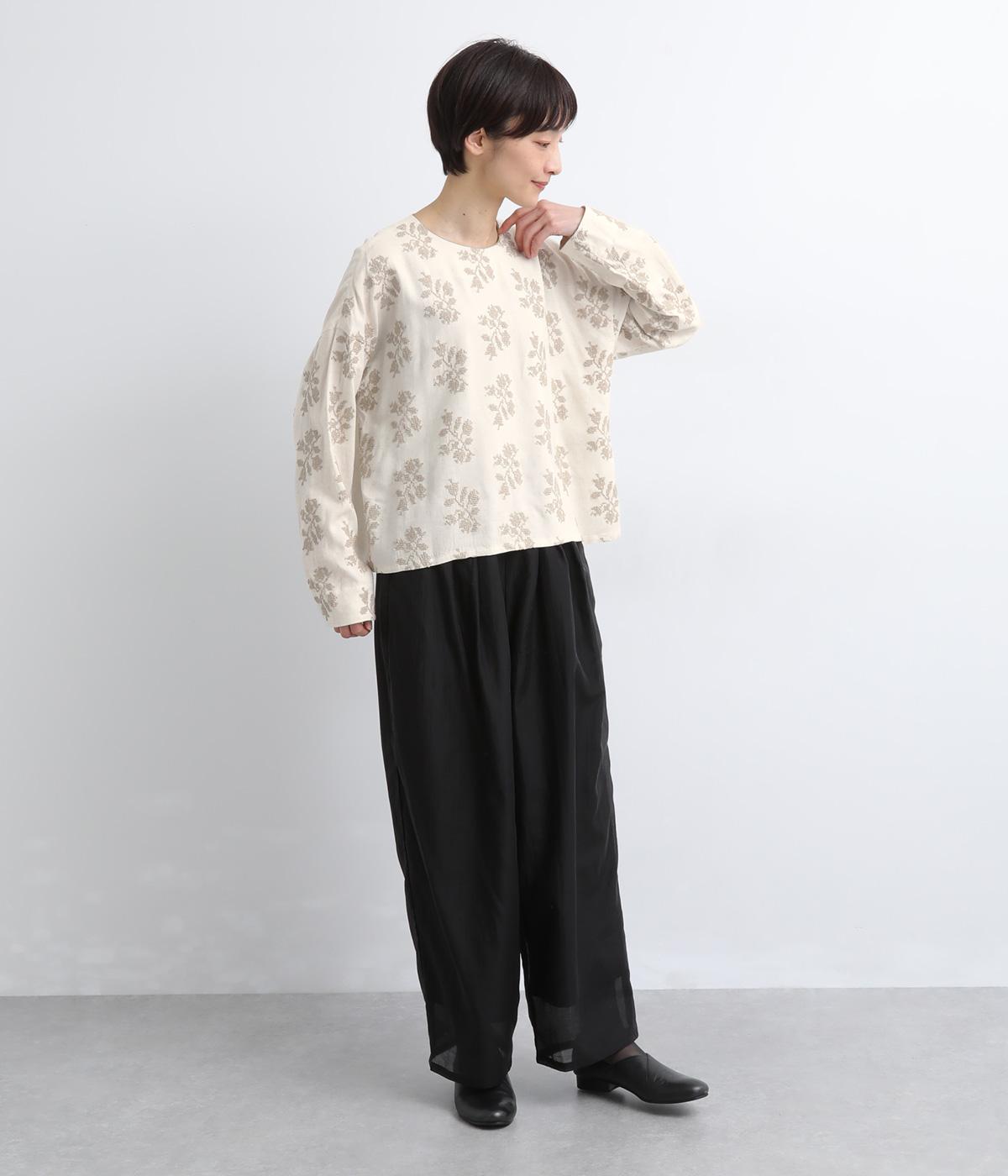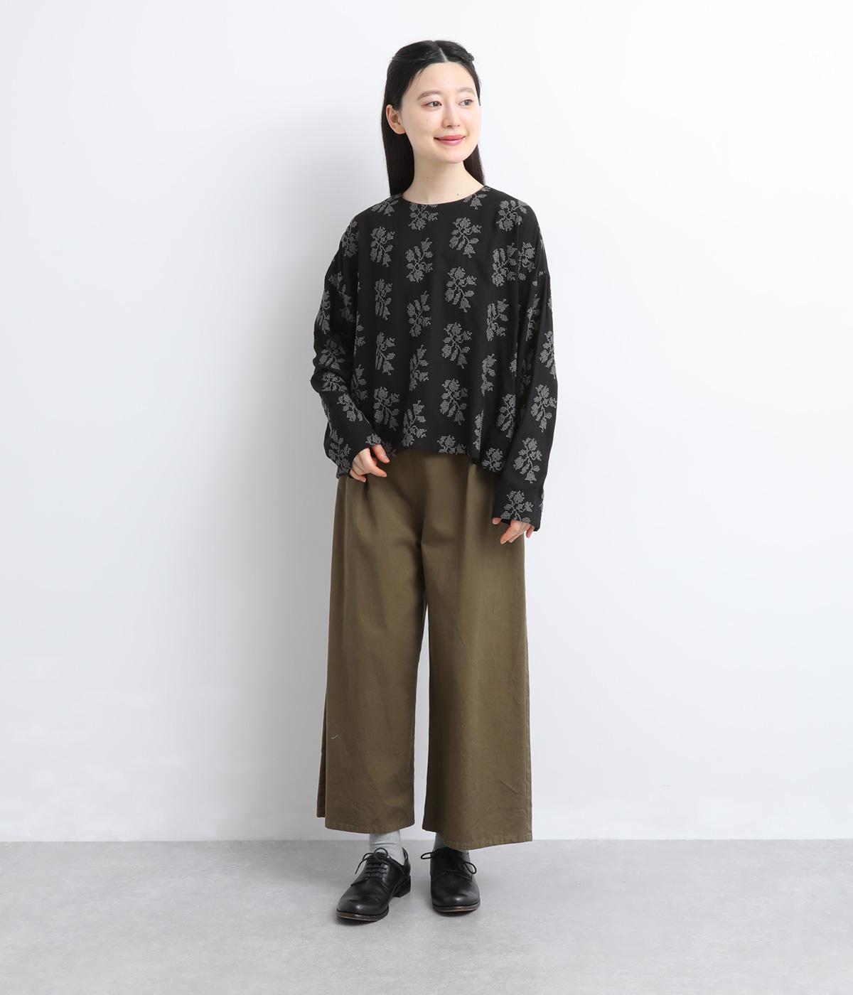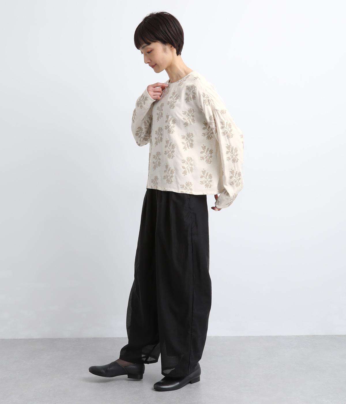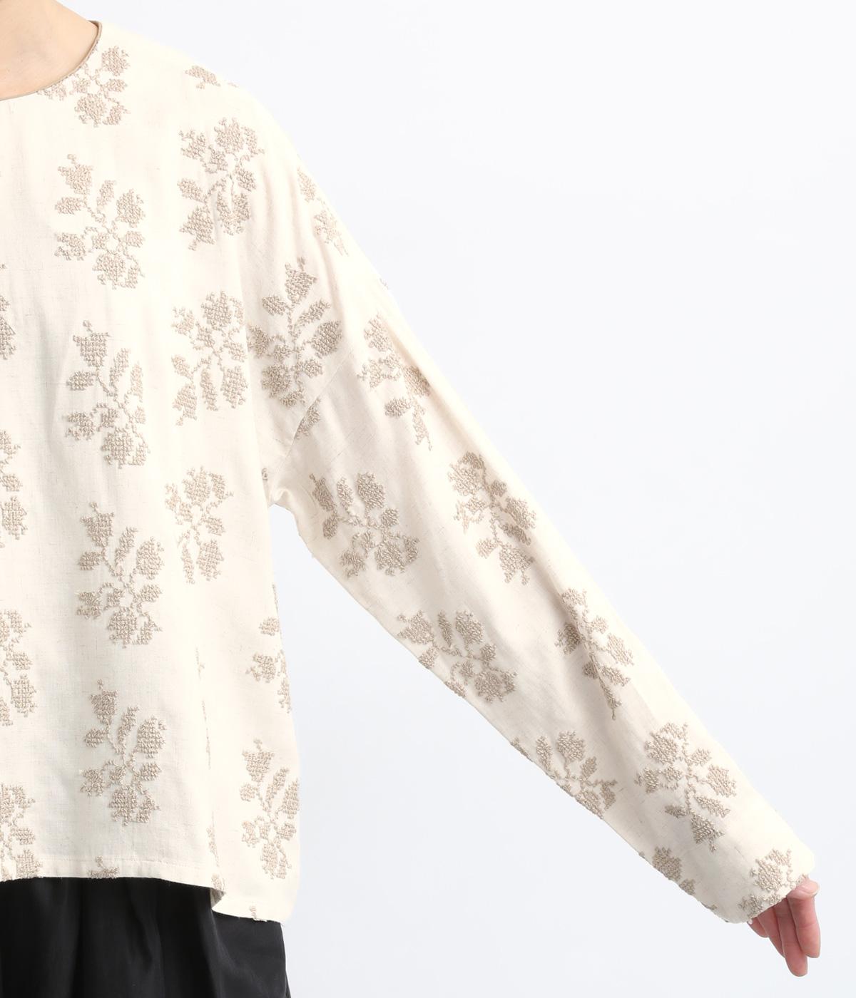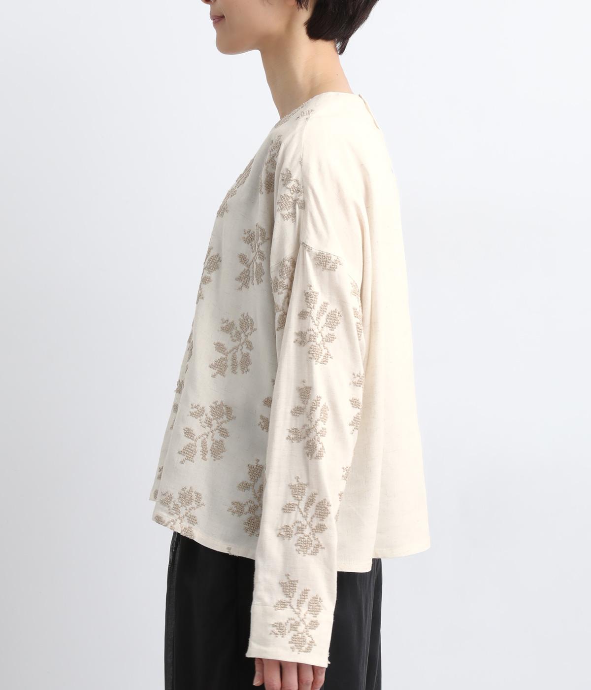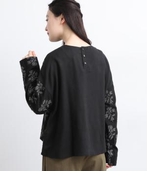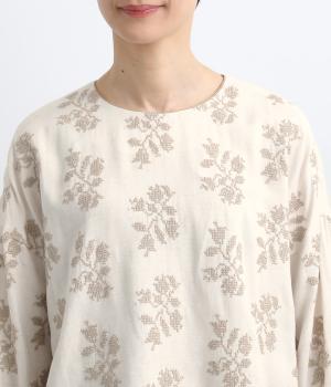 大ぶりのリーフモチーフ刺しゅうが、装いにナチュラルな華やかさを演出します。ゆったりとしたボクシーシルエットは、体のラインを拾いにくいのが◎。後ろ身頃を無地で切り替えることで柄が引き立ち、着こなしに奥行きを生みます。襟ぐりのさりげないパイピングも、上品なアクセントです。