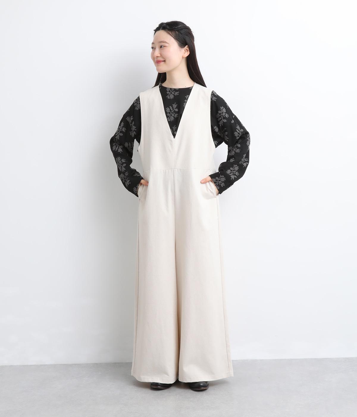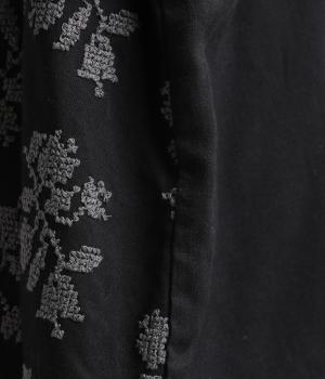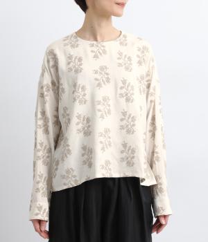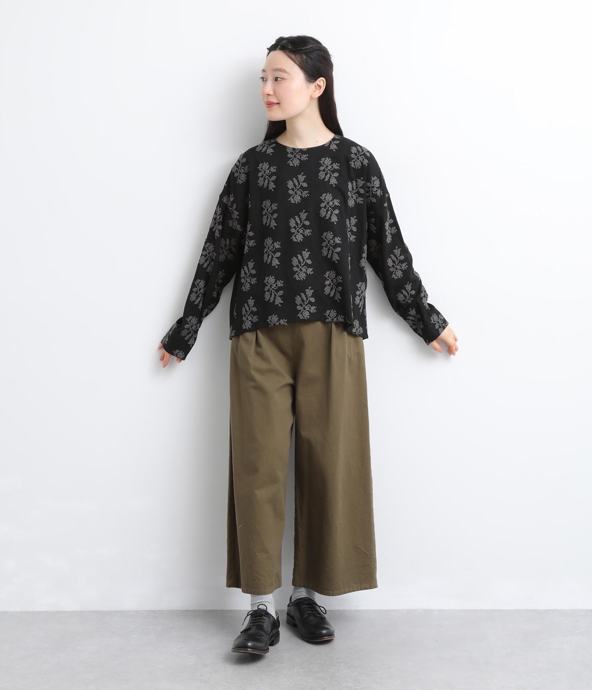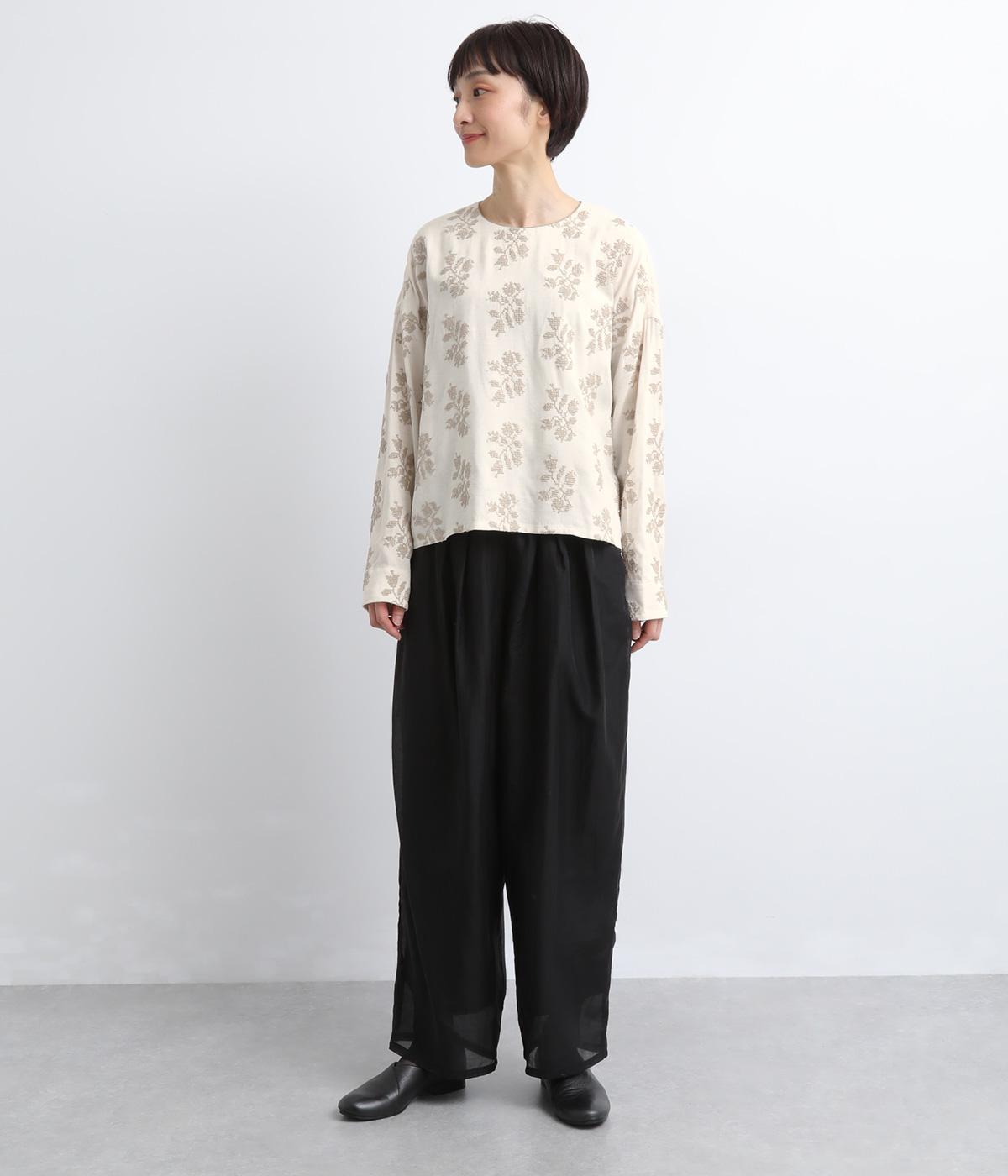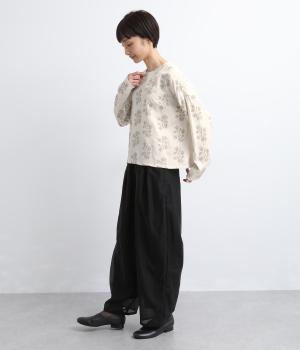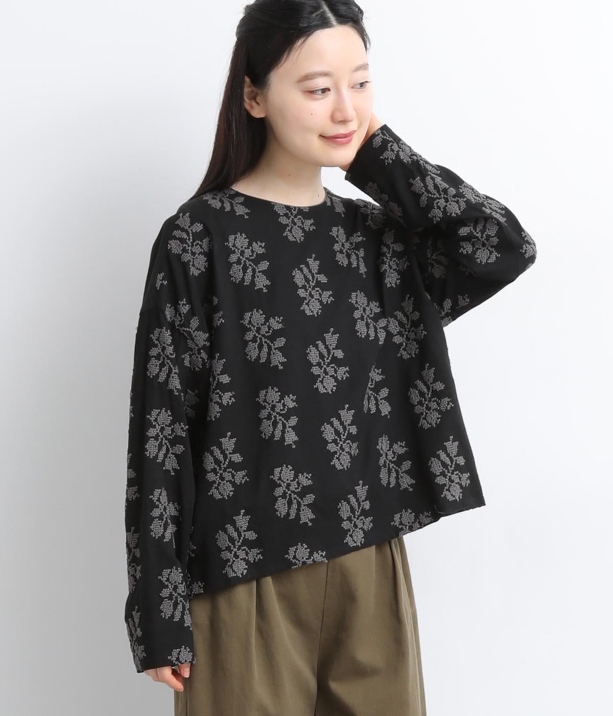 大ぶりのリーフモチーフ刺しゅうが、装いにナチュラルな華やかさを演出します。ゆったりとしたボクシーシルエットは、体のラインを拾いにくいのが◎。後ろ身頃を無地で切り替えることで柄が引き立ち、着こなしに奥行きを生みます。襟ぐりのさりげないパイピングも、上品なアクセントです。