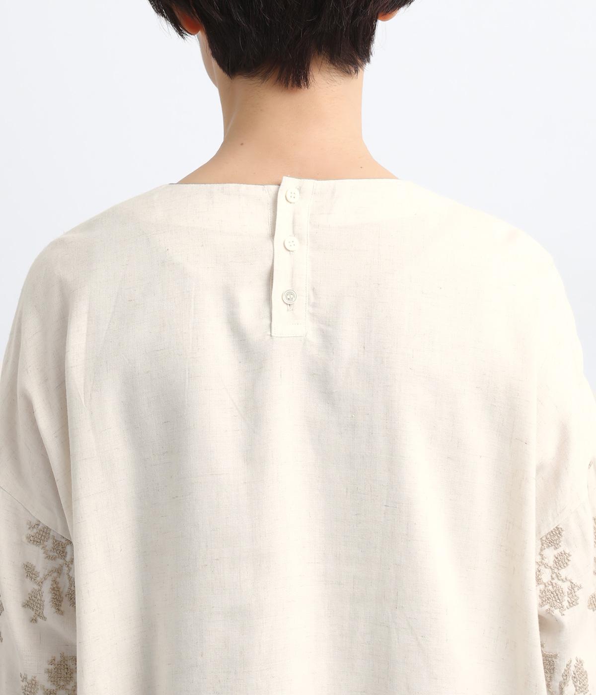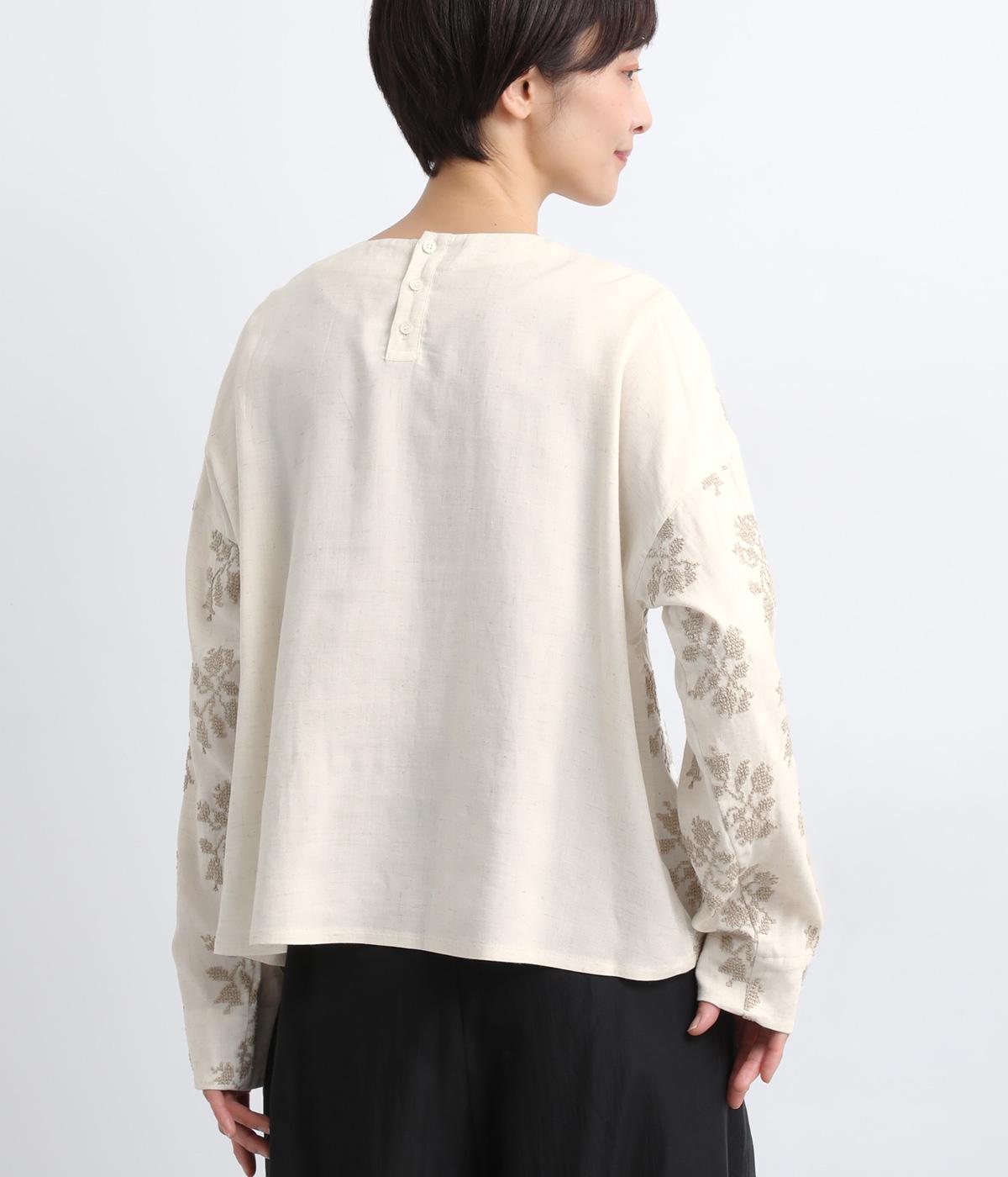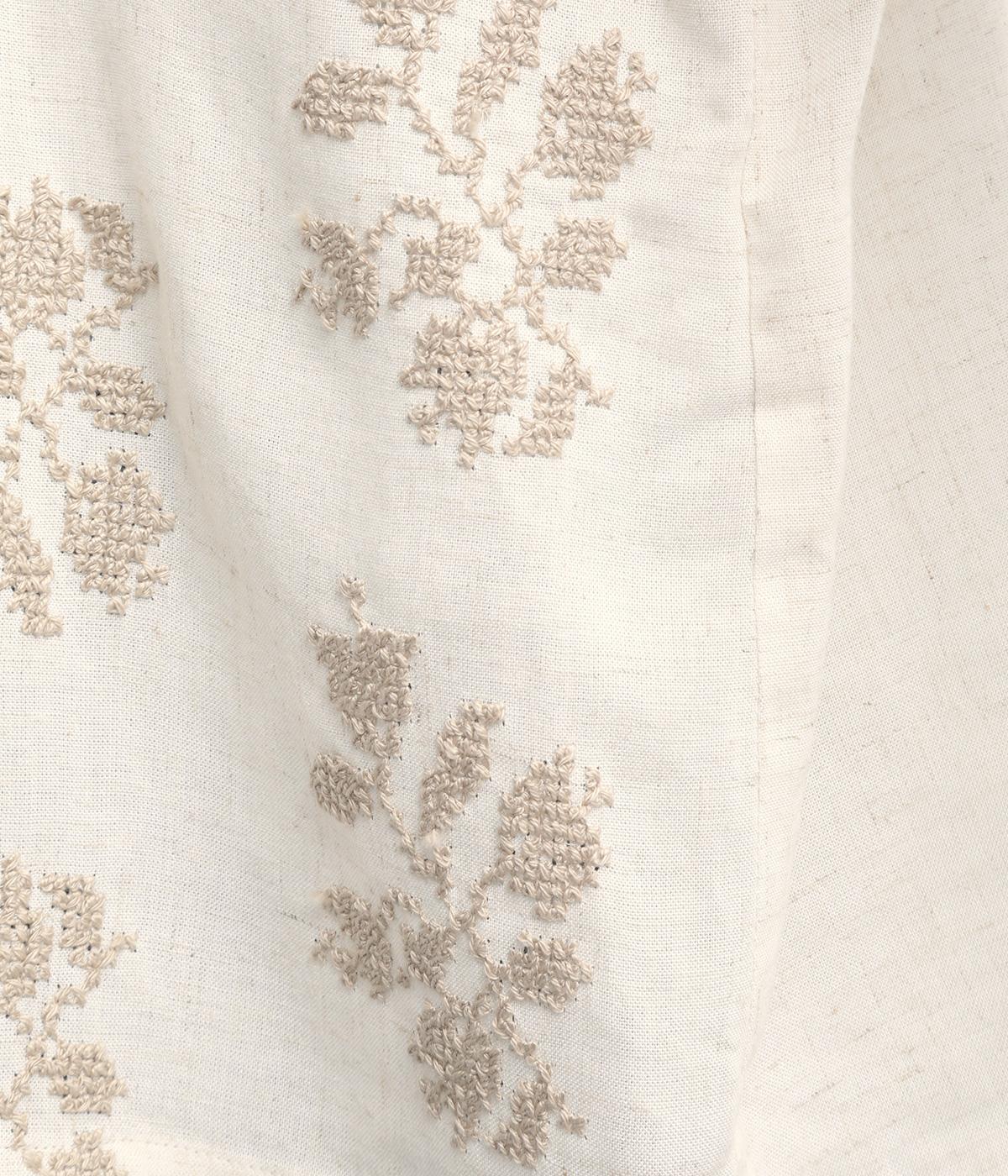 なめらかさと自然な風合いをあわせ持つ、レーヨンリネンの生地を使用。天日干しによるふっくらとした質感と、やさしい雰囲気が魅力です。太番手の綿糸で施した刺しゅうは、手仕事のような立体感があり、素材の表情にぬくもりと奥行きを添えています。
