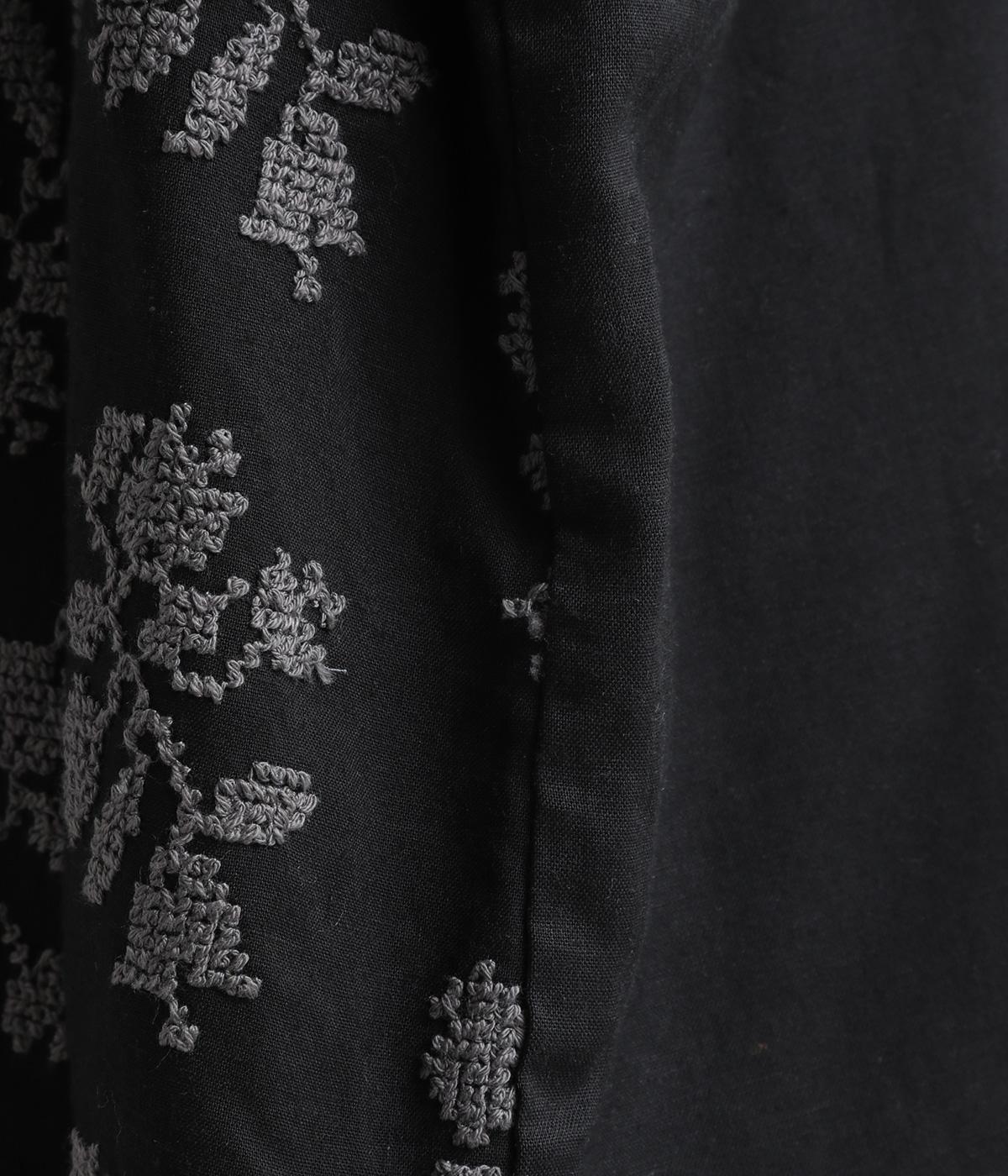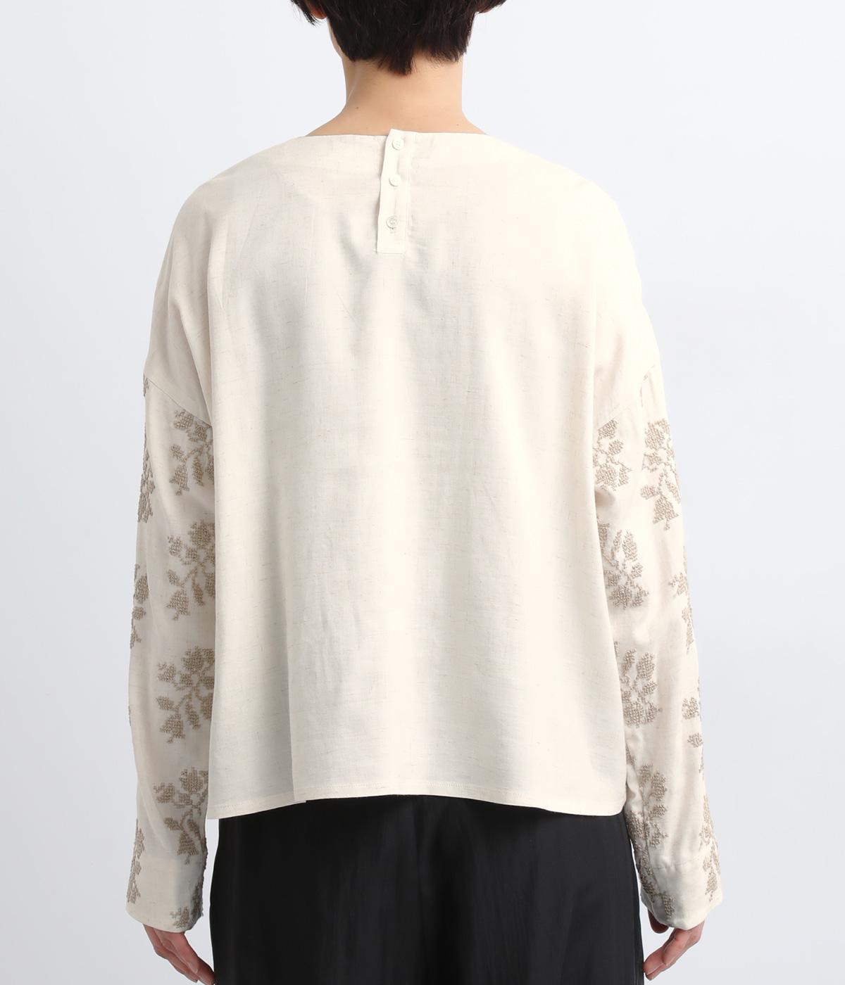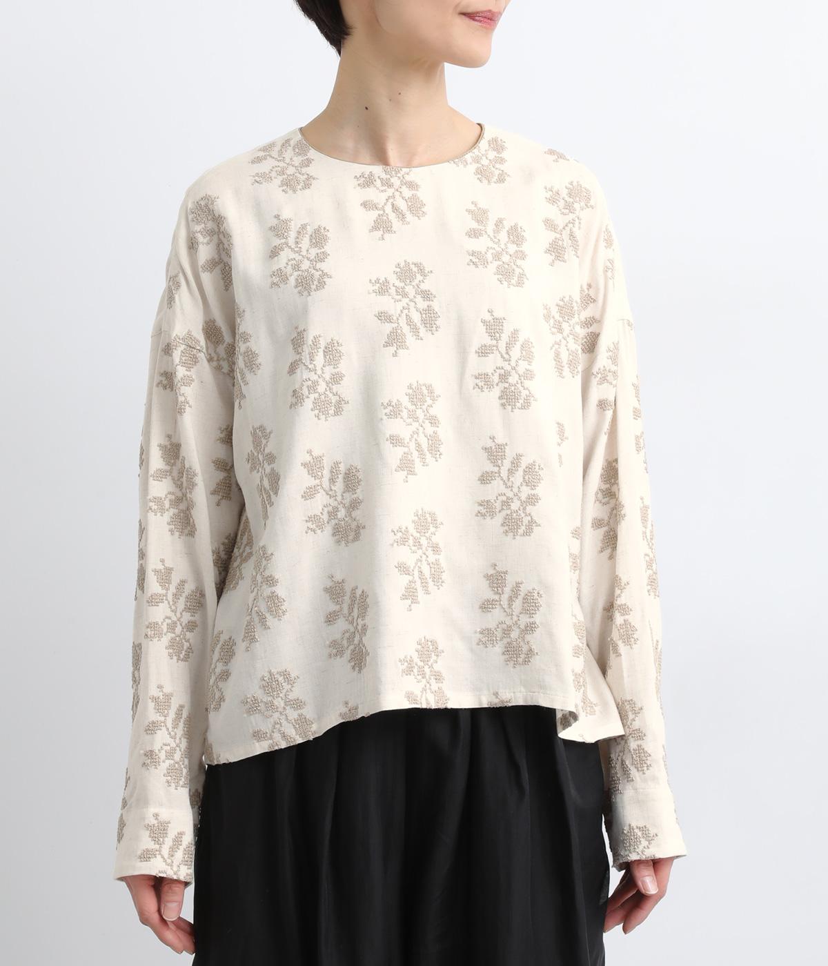 なめらかさと自然な風合いをあわせ持つ、レーヨンリネンの生地を使用。天日干しによるふっくらとした質感と、やさしい雰囲気が魅力です。太番手の綿糸で施した刺しゅうは、手仕事のような立体感があり、素材の表情にぬくもりと奥行きを添えています。
