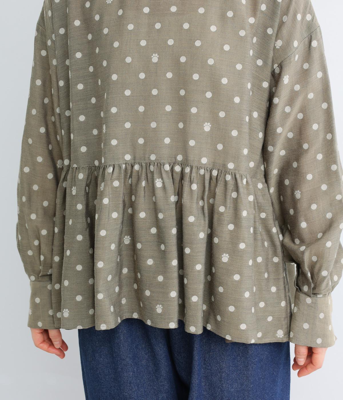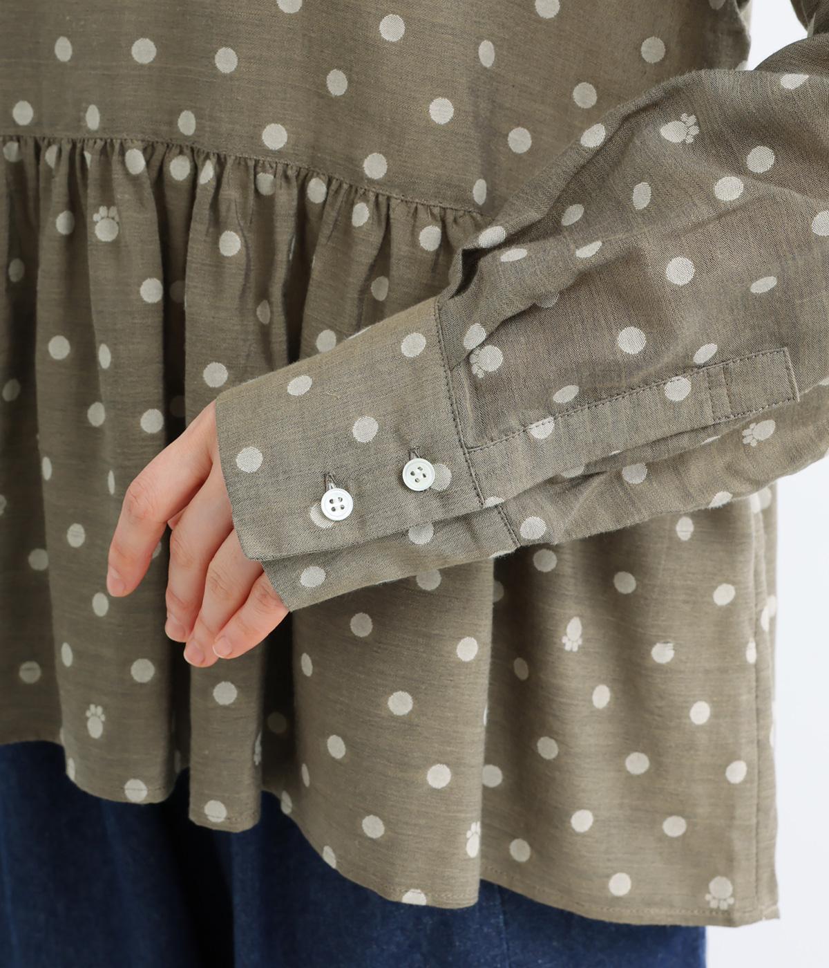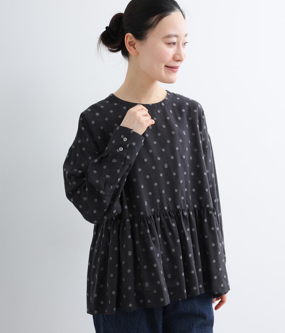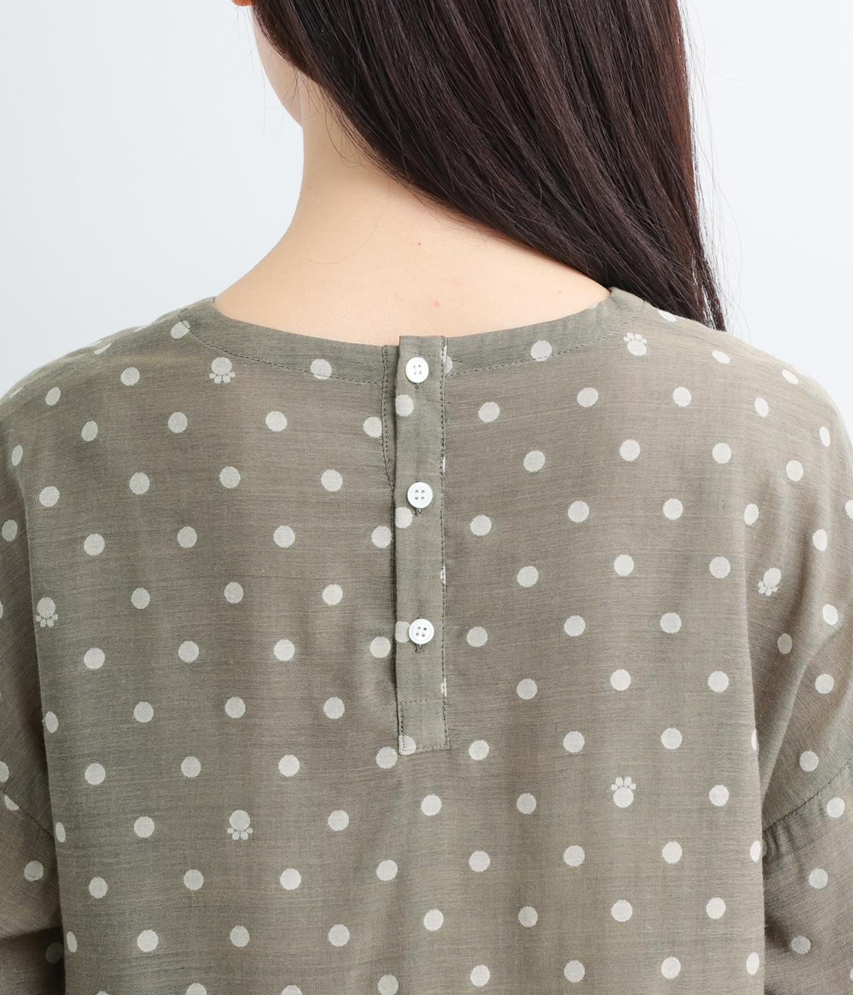 きれいめな印象を運ぶドット柄ブラウスは、よく見ると猫の肉球がかくれている遊び心のあるデザイン。ウエスト切り替えにギャザーを入れたフレア感が特徴で、クラシックに寄りすぎずふだん使いができます。首元をきれいに見せるクルーネックに後ろボタンあき。