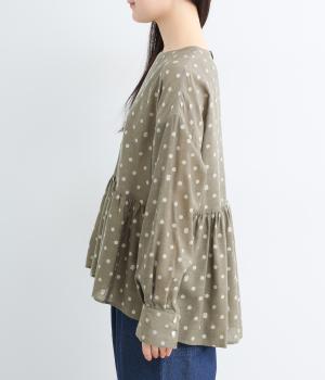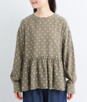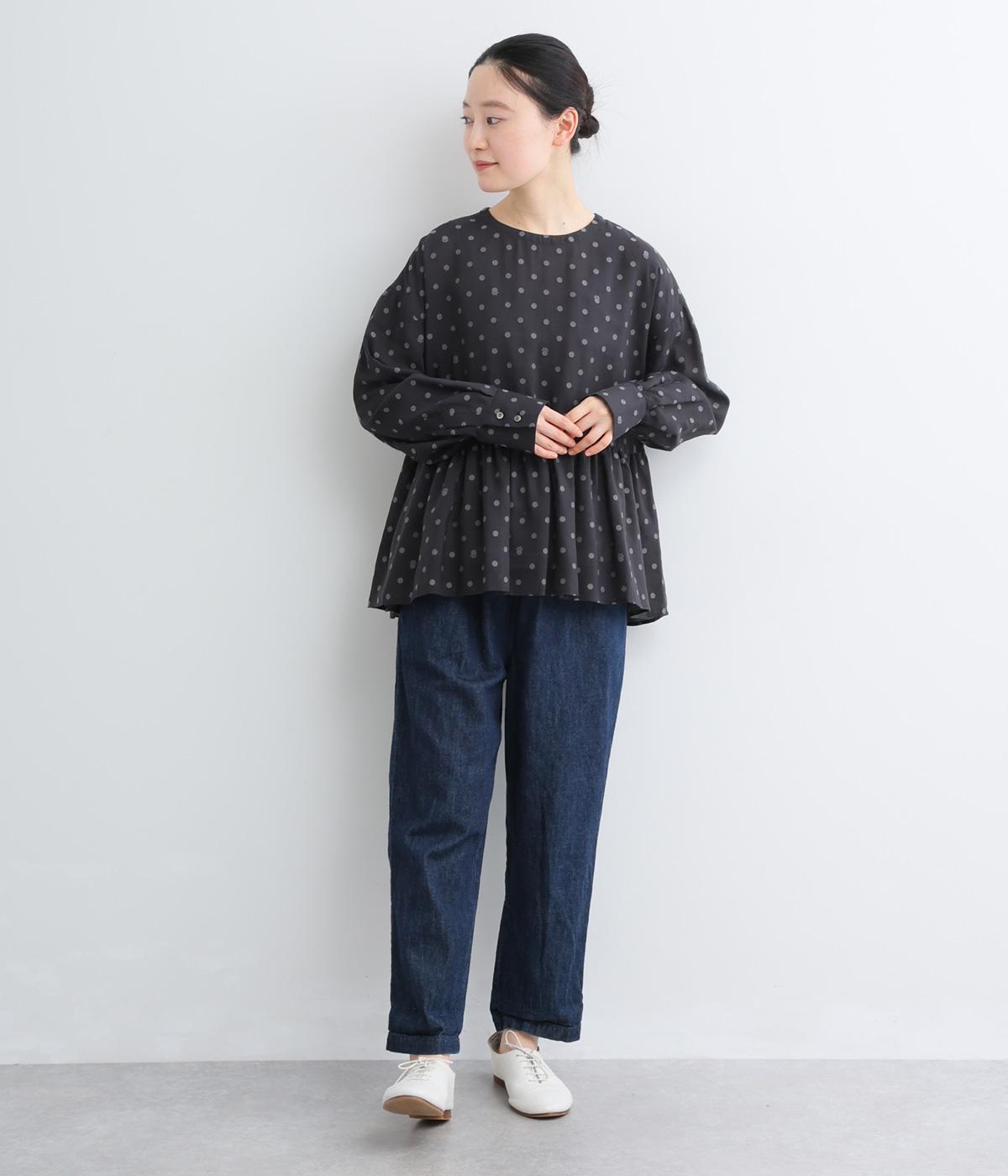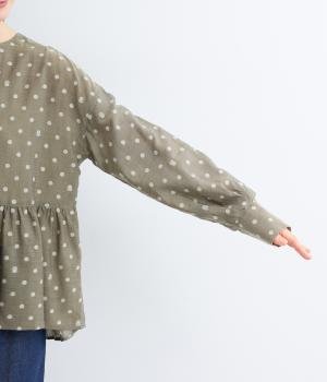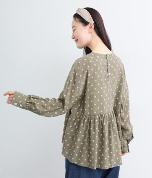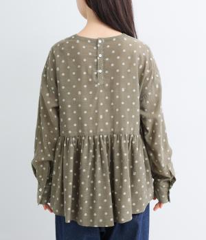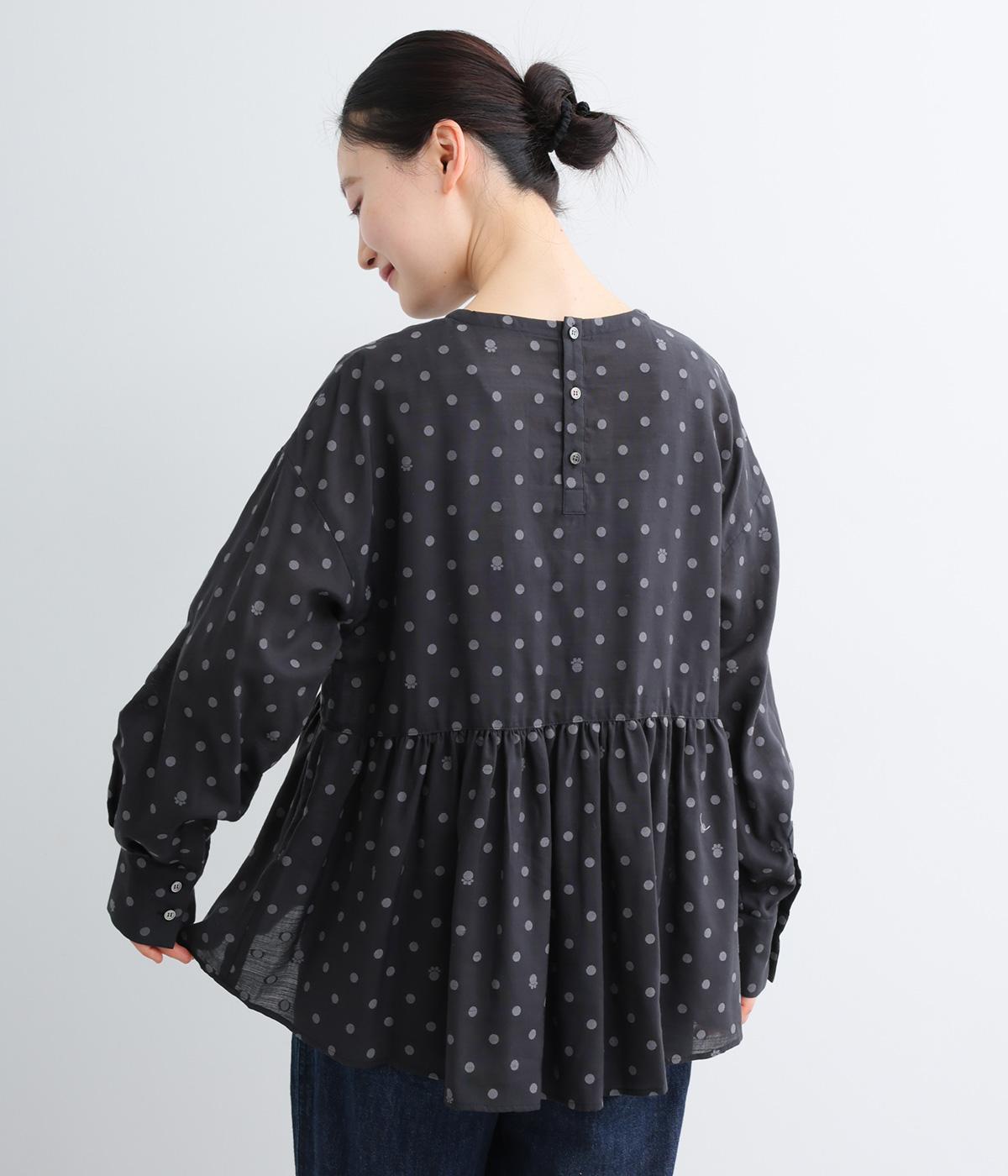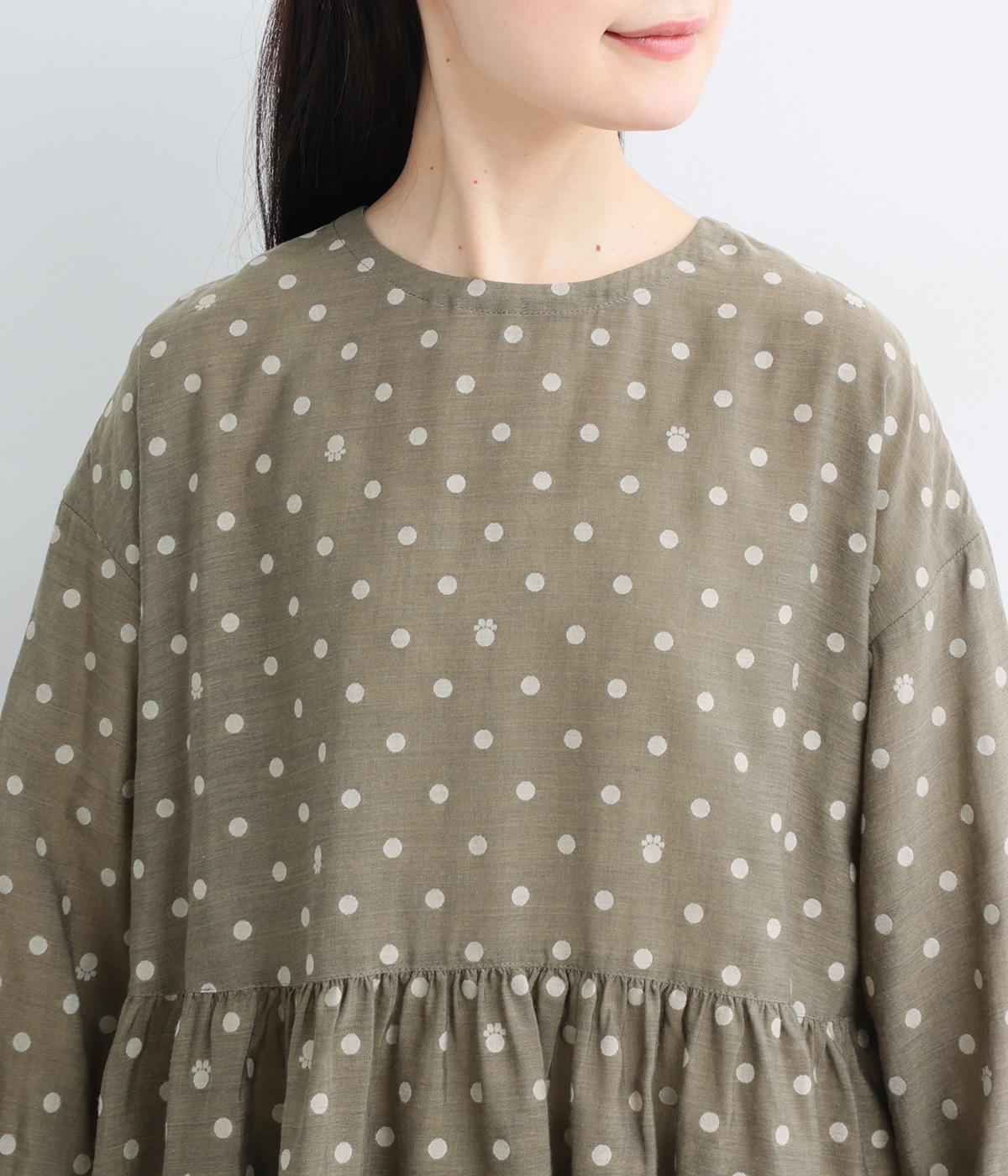 きれいめな印象を運ぶドット柄ブラウスは、よく見ると猫の肉球がかくれている遊び心のあるデザイン。ウエスト切り替えにギャザーを入れたフレア感が特徴で、クラシックに寄りすぎずふだん使いができます。首元をきれいに見せるクルーネックに後ろボタンあき。