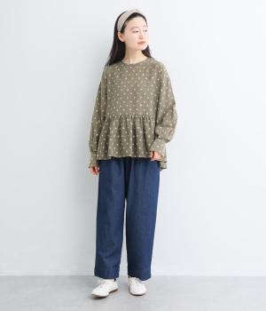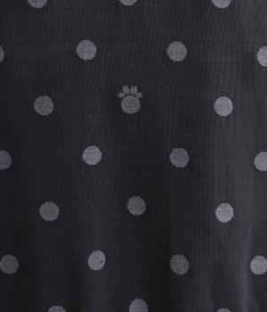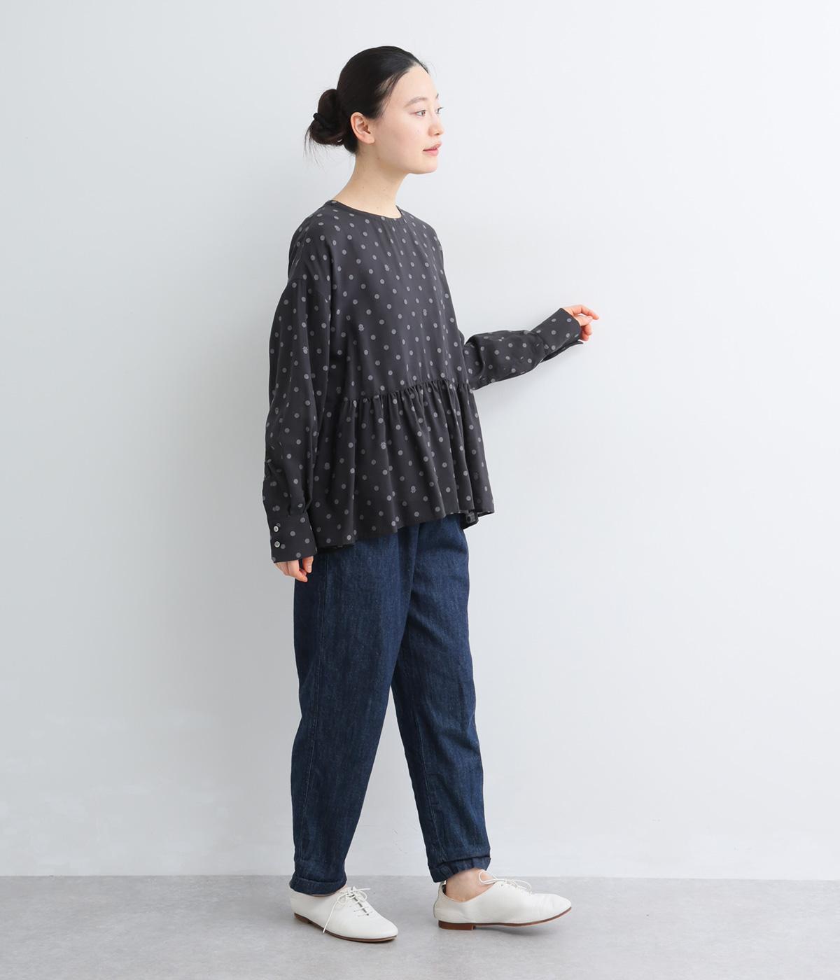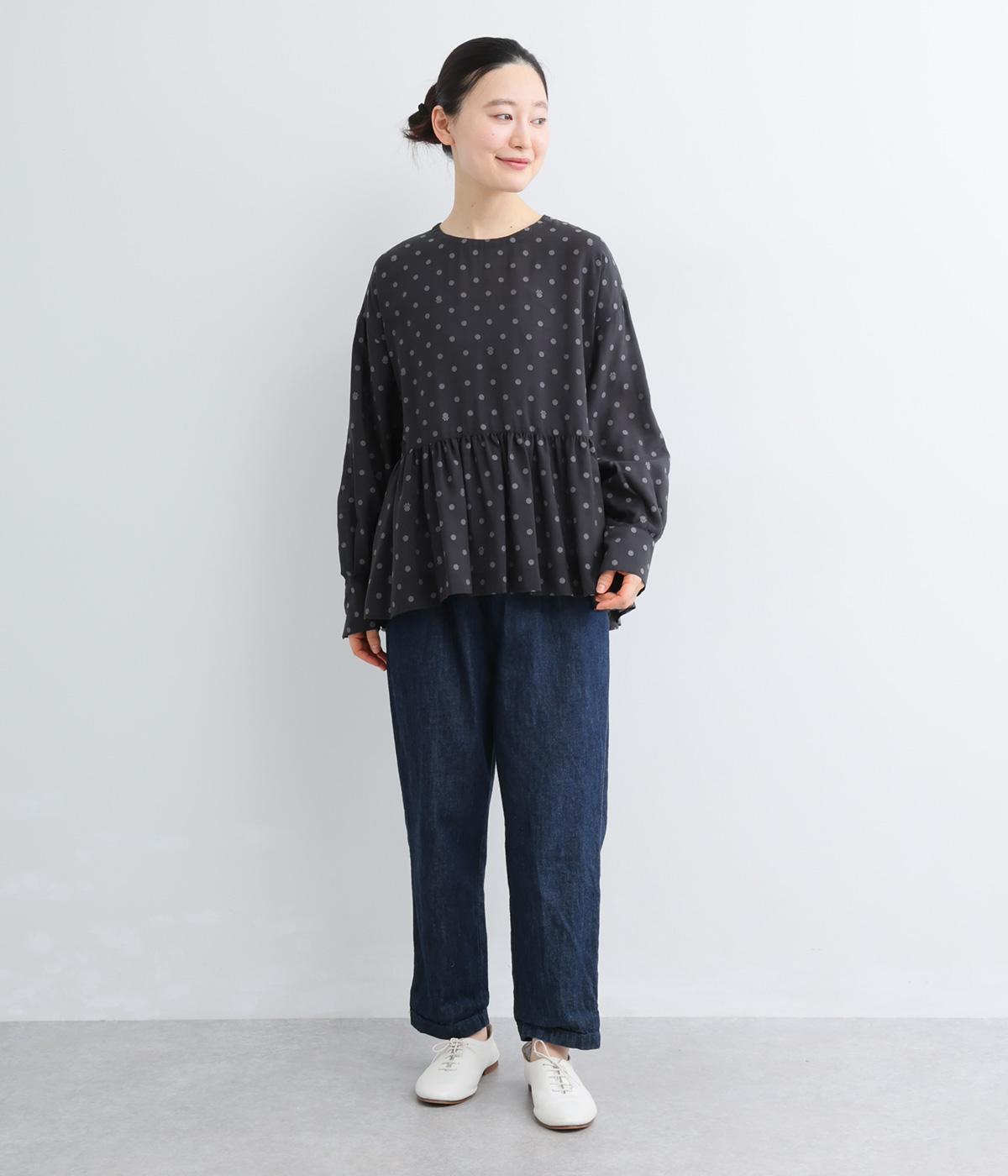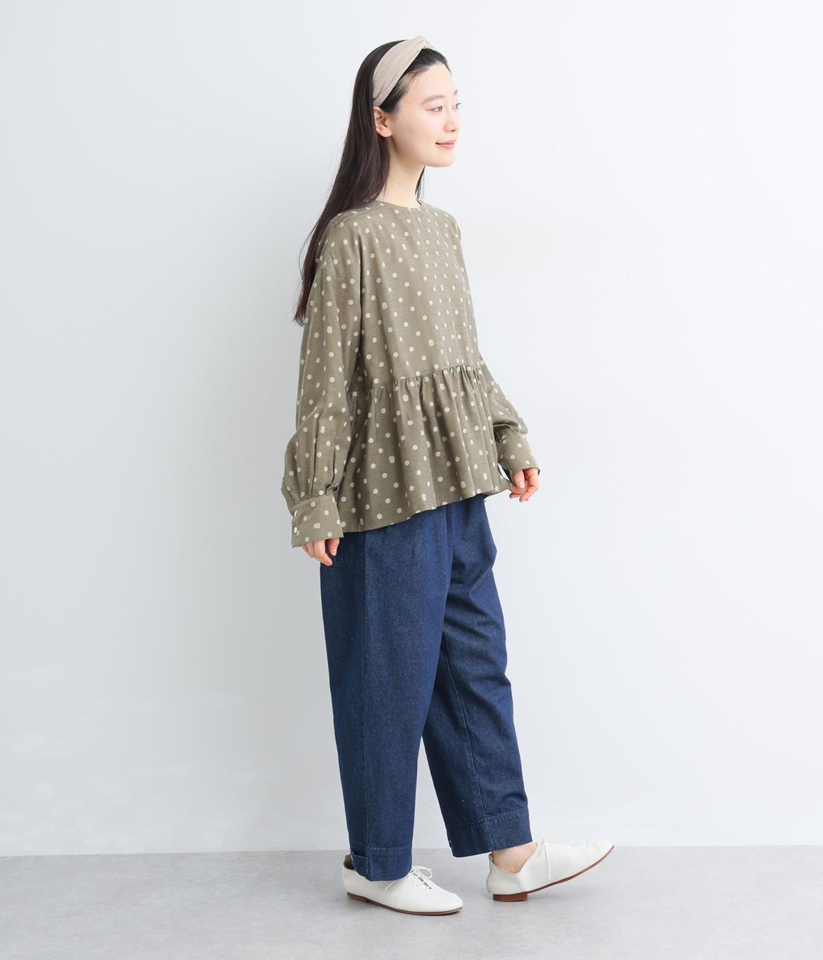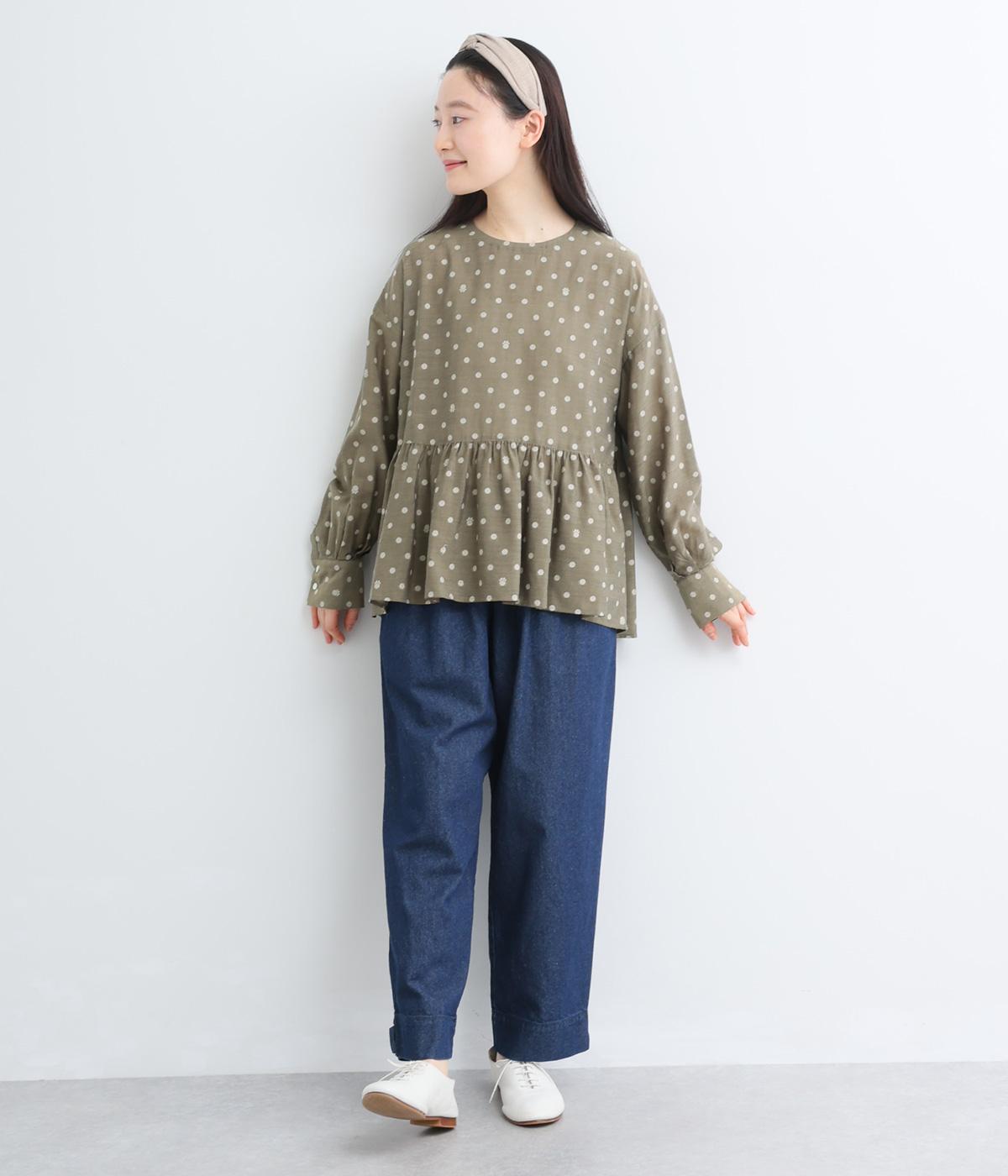 きれいめな印象を運ぶドット柄ブラウスは、よく見ると猫の肉球がかくれている遊び心のあるデザイン。ウエスト切り替えにギャザーを入れたフレア感が特徴で、クラシックに寄りすぎずふだん使いができます。首元をきれいに見せるクルーネックに後ろボタンあき。
