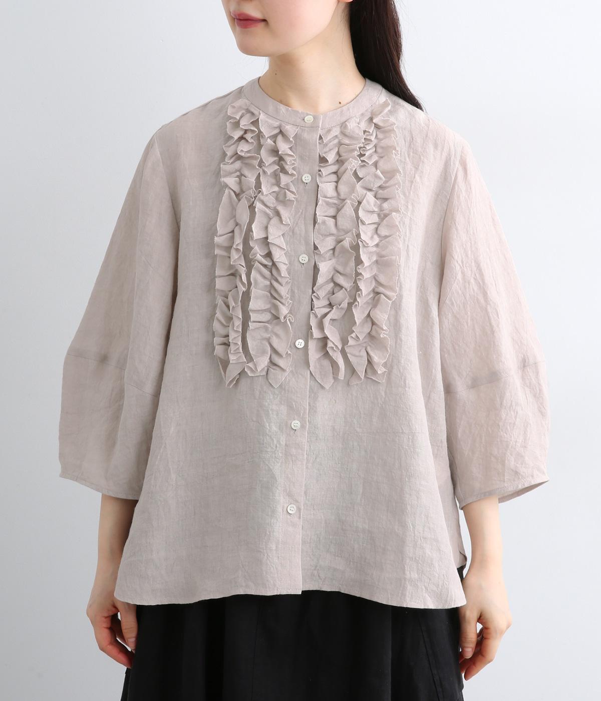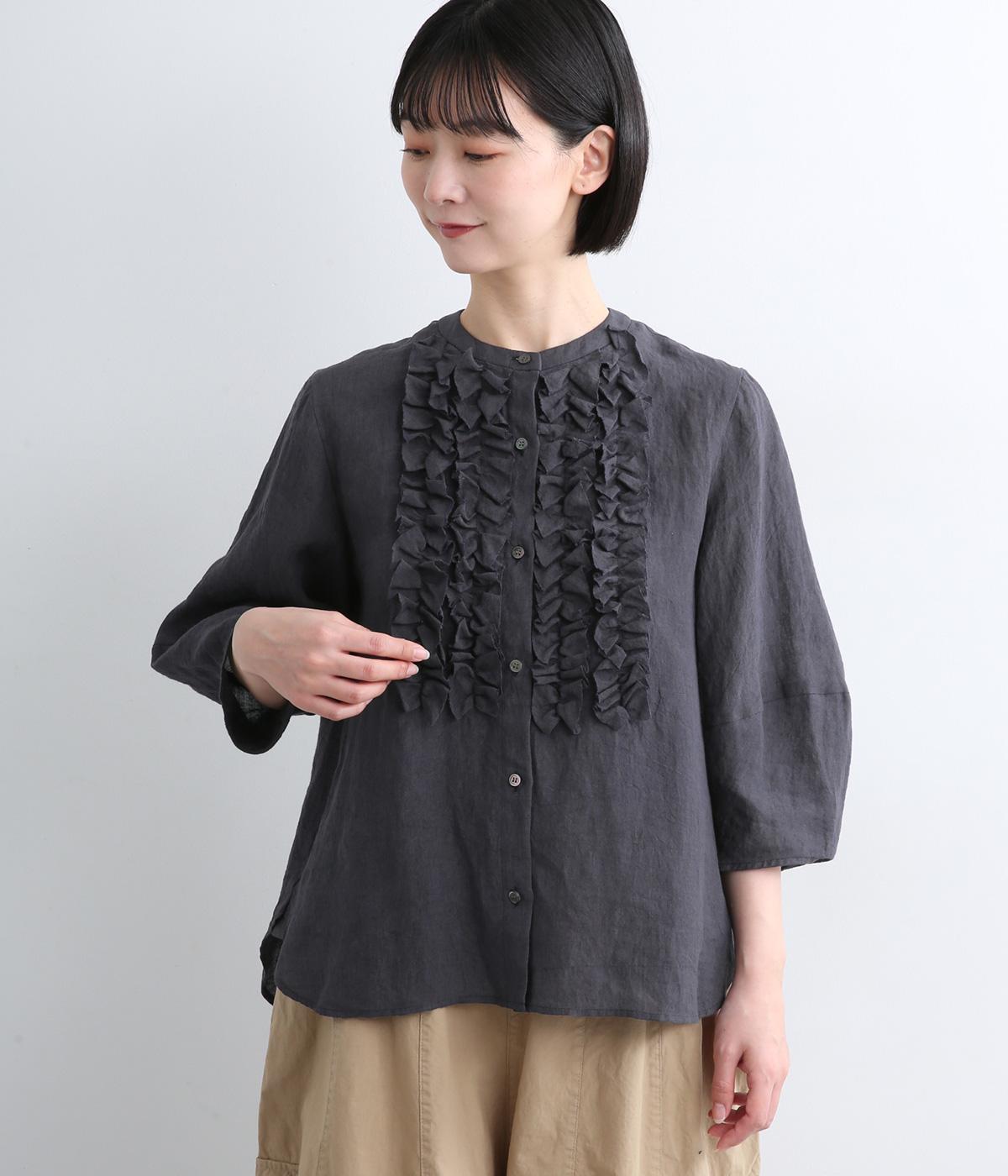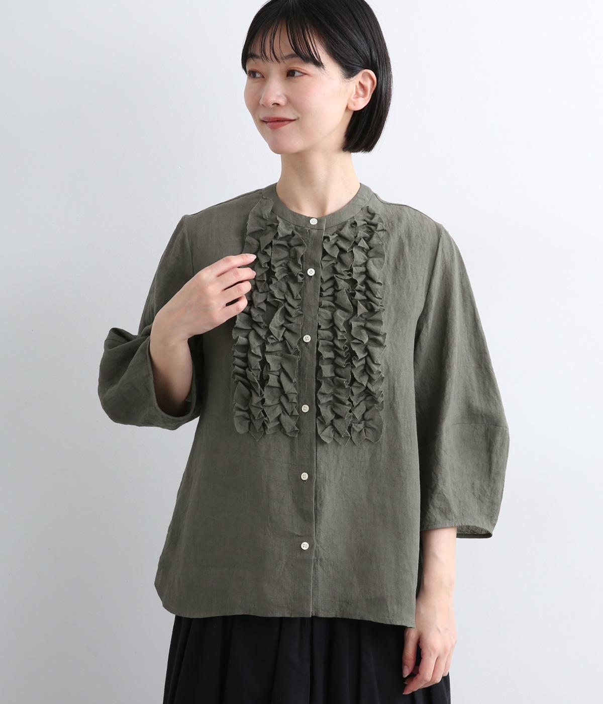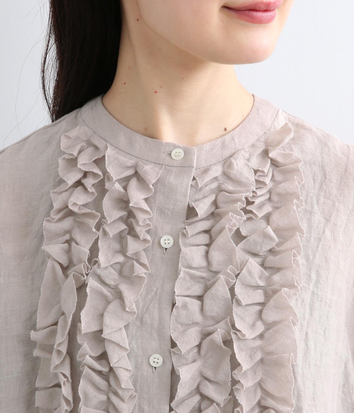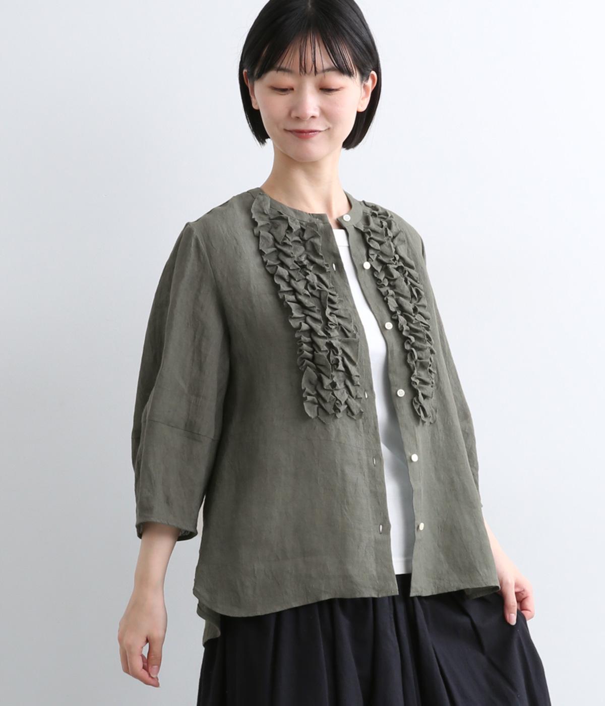 フロントに施した、立体感のあるフリルが印象的なブラウスです。フリルは断ち切り仕様で、着用を重ねるほどにヴィンテージのような味わいが生まれます。身頃はすっきりと整え、袖には切り替えを入れて丸みのあるシルエットに。リネンの風合いをいかした、大人のカジュアルスタイルに寄り添う一枚です。