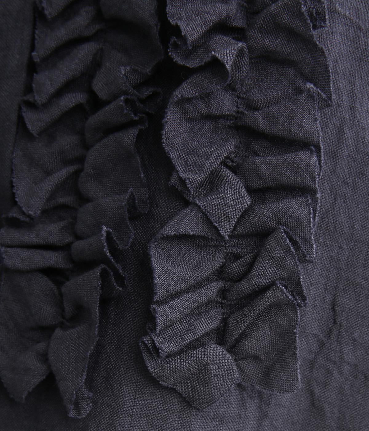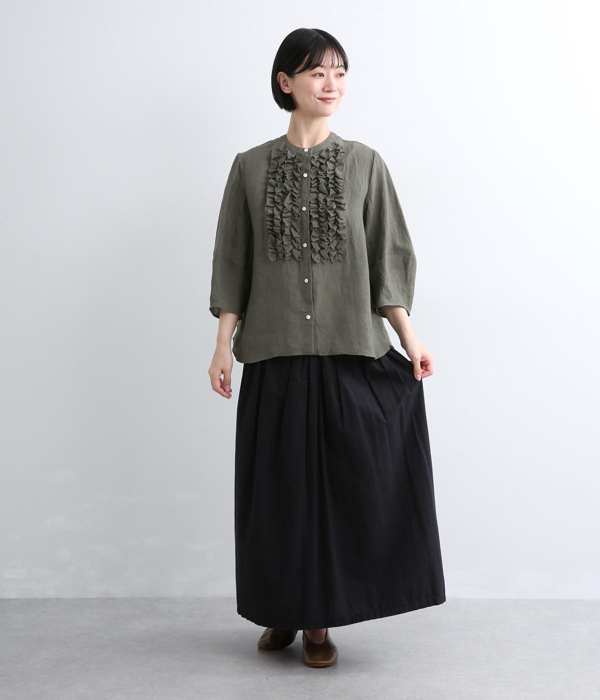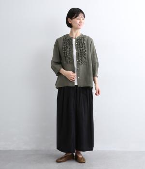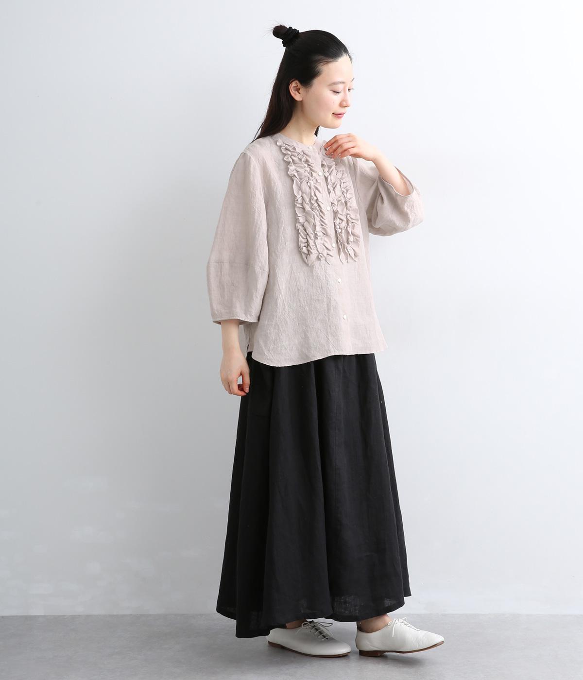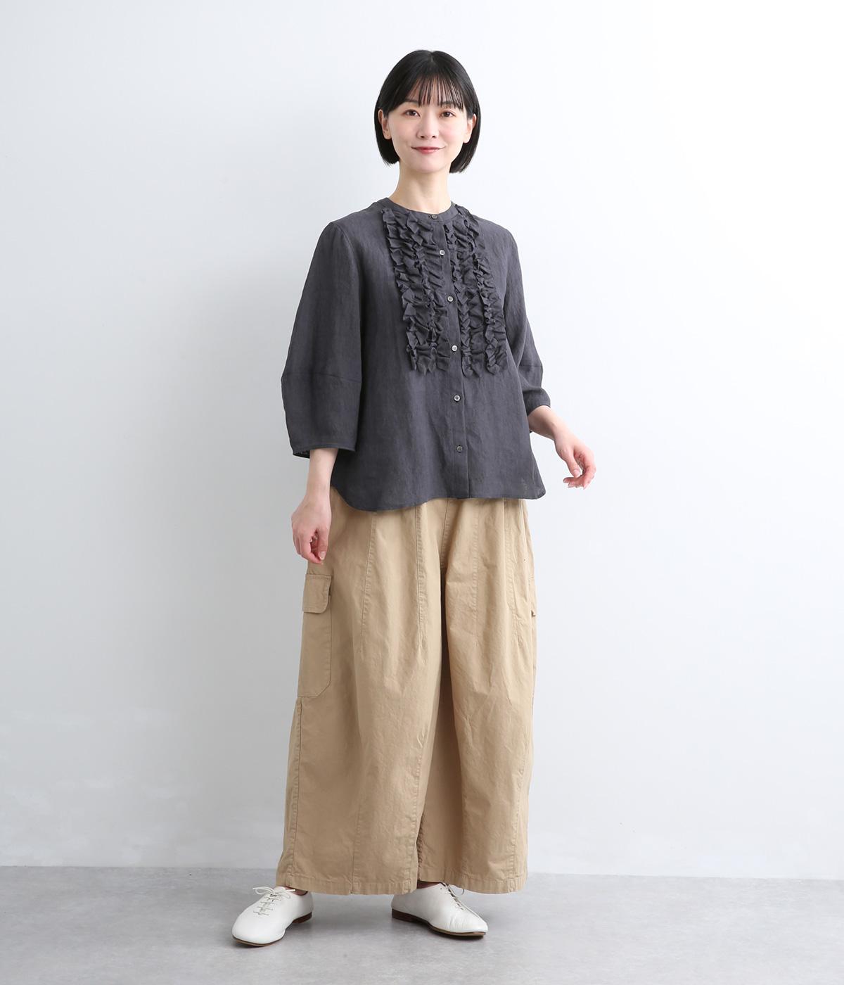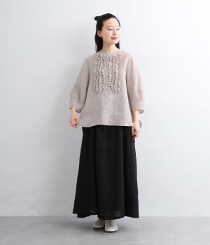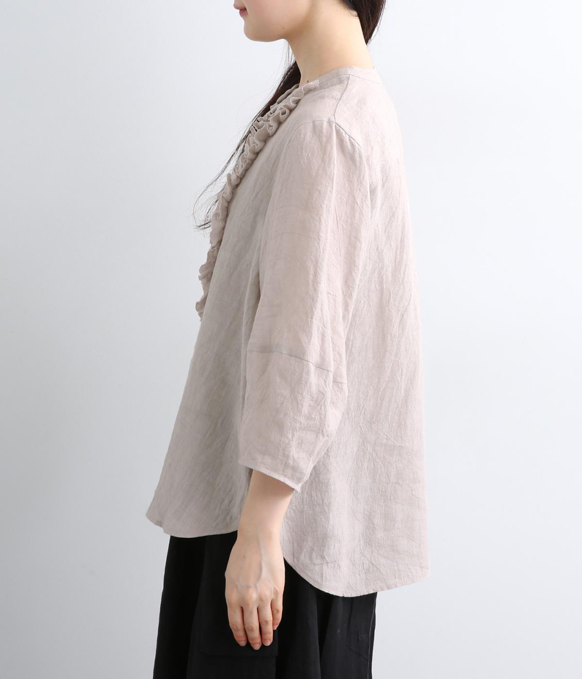 フロントに施した、立体感のあるフリルが印象的なブラウスです。フリルは断ち切り仕様で、着用を重ねるほどにヴィンテージのような味わいが生まれます。身頃はすっきりと整え、袖には切り替えを入れて丸みのあるシルエットに。リネンの風合いをいかした、大人のカジュアルスタイルに寄り添う一枚です。