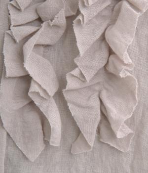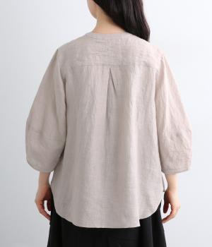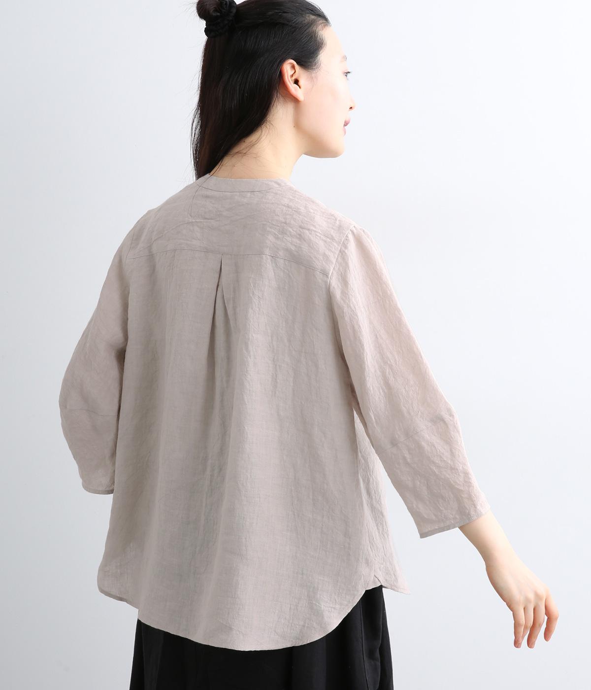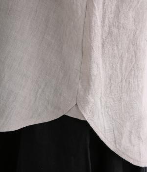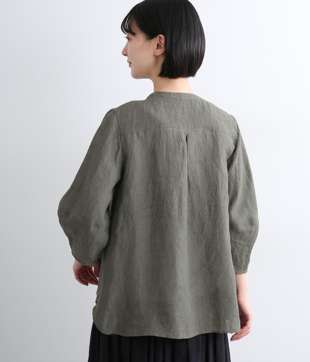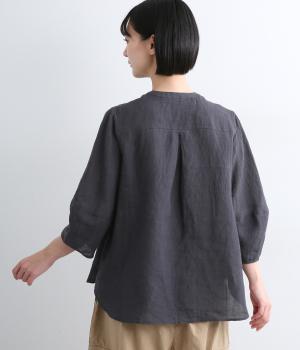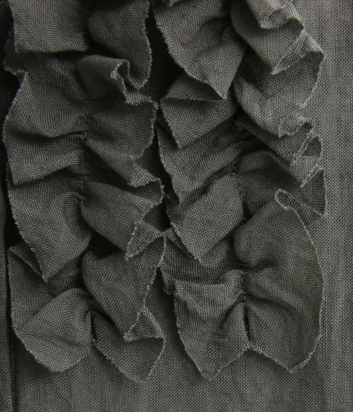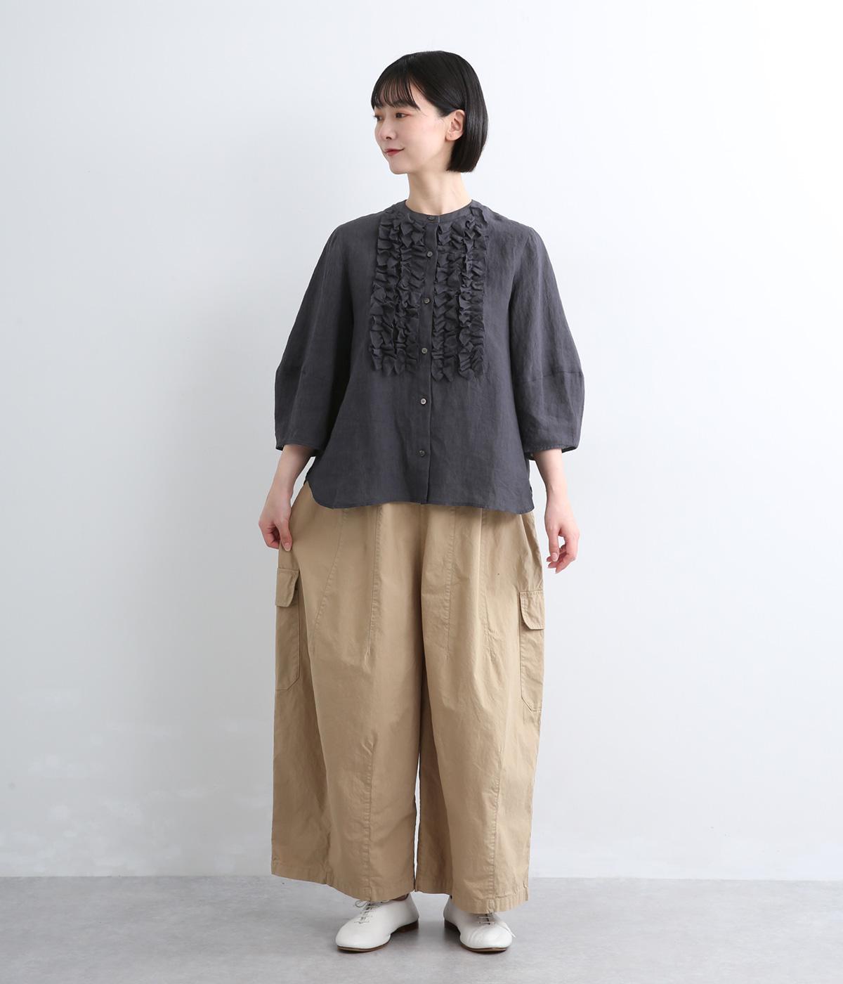 フロントに施した、立体感のあるフリルが印象的なブラウスです。フリルは断ち切り仕様で、着用を重ねるほどにヴィンテージのような味わいが生まれます。身頃はすっきりと整え、袖には切り替えを入れて丸みのあるシルエットに。リネンの風合いをいかした、大人のカジュアルスタイルに寄り添う一枚です。