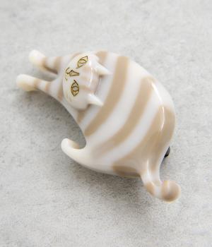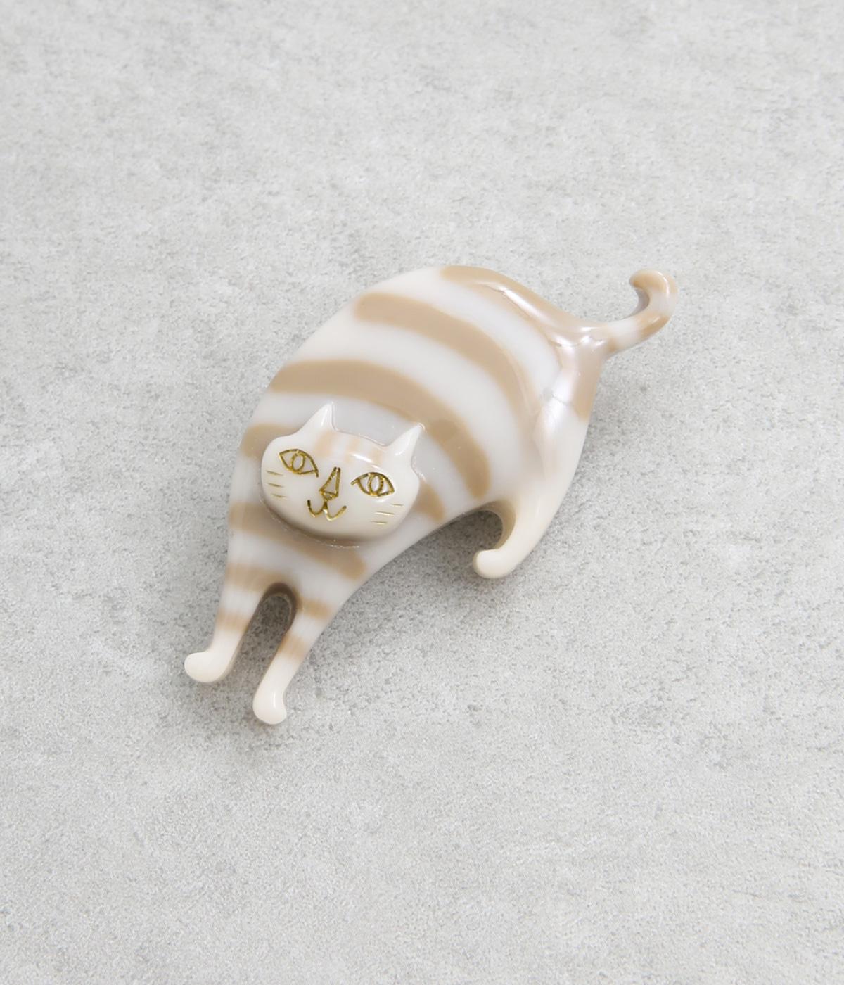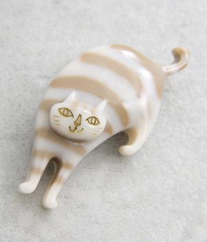 前に歩いてくるしまネコをモチーフにした、どこかストーリーを感じさせるブローチ。ぷっくりとした立体感とやわらかな色づかいで、味わい深い雰囲気に仕上げています。いつものシャツやジャケットに添えるだけで、コーディネートのアクセントになる、こだわりのつまったアイテムです。