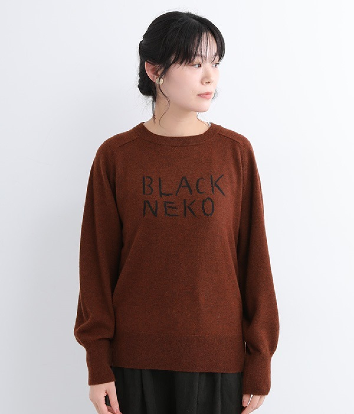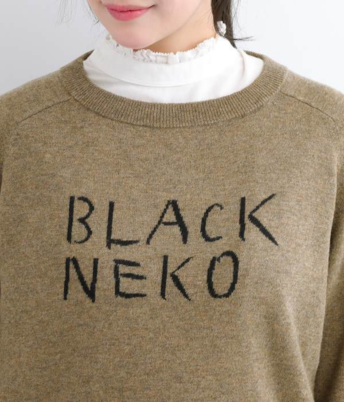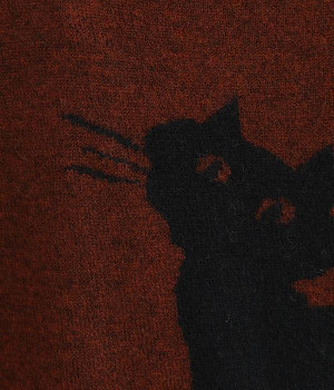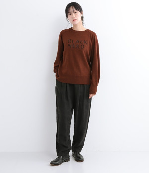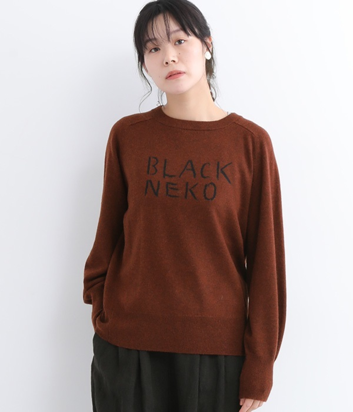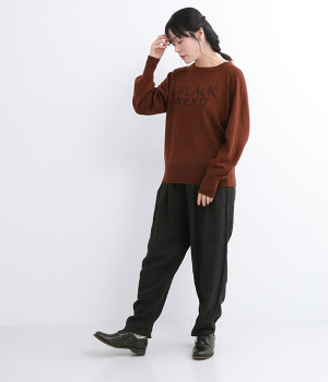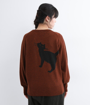 背中に大きく描かれた黒猫がインパクト抜群なニットプルオーバーです。ほっこりとあたたかみのある表情のニットと、走り書きのようなタッチのロゴとのコントラストで印象的なデザインに仕上げました。やわらかな風合いで着心地が良く、生地が厚すぎないのでジャケットなどアウターのインにも◎。